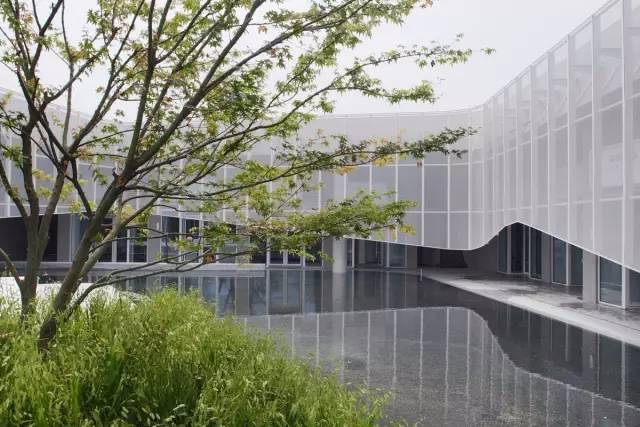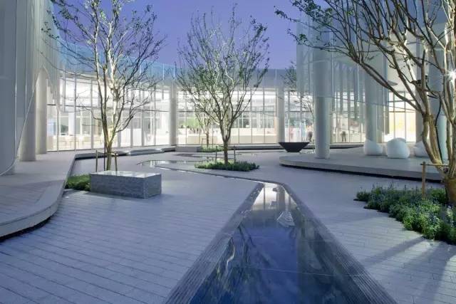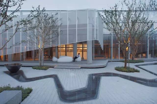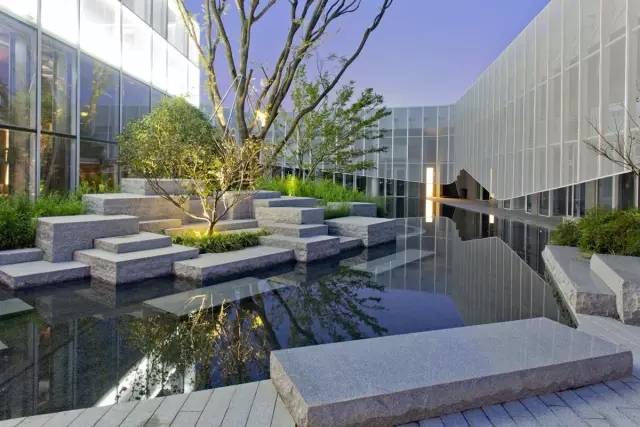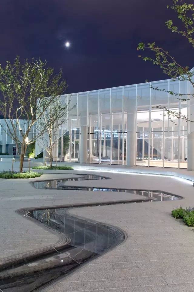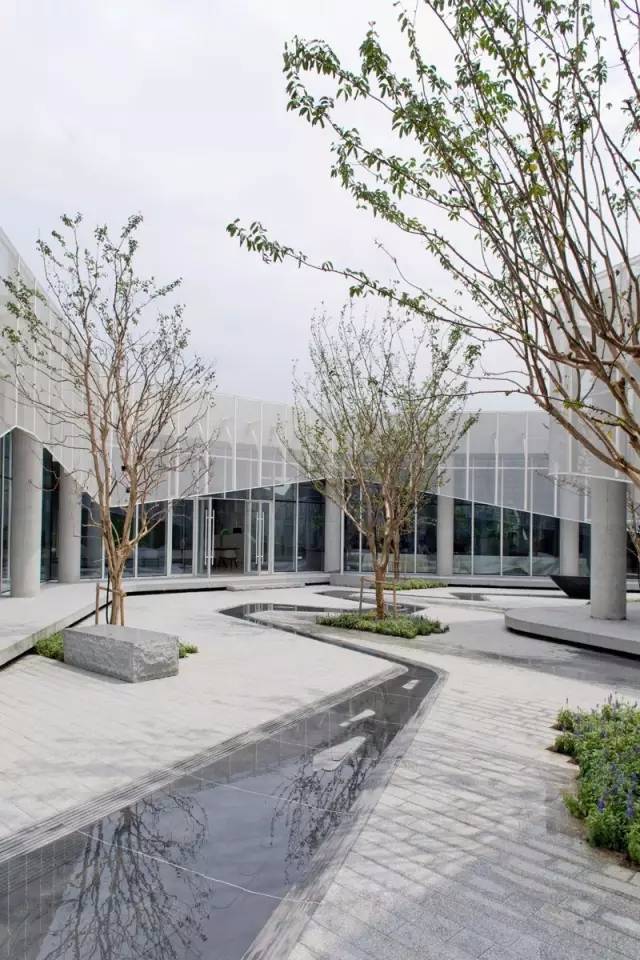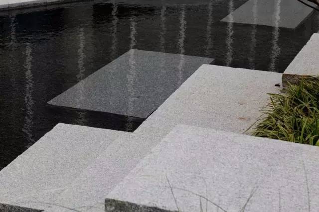 主庭院分為溪院和水院兩部分。水溪以精致的水臺(tái)涌泉為源頭,經(jīng)過“侵蝕”曲水流觴注入到水院中,溪水下游的疊石如被溪流沖刷一般與種植結(jié)合在一起形成了入口對(duì)景“雕塑”。總體來看,溪院以簡(jiǎn)潔的硬質(zhì)鋪裝為主,曲水流觴蜿蜒穿梭在疏影婆娑樹林當(dāng)中,泉水汩汩聲縈繞在其中,這些都營(yíng)造出場(chǎng)地的靜謐氛圍;水院以水為主,靜謐的水面和建筑交相輝映。