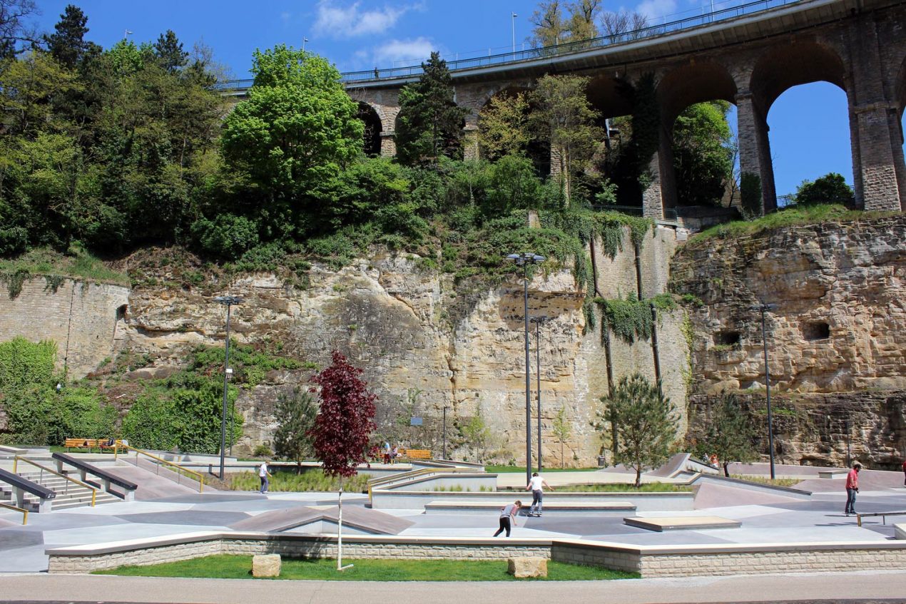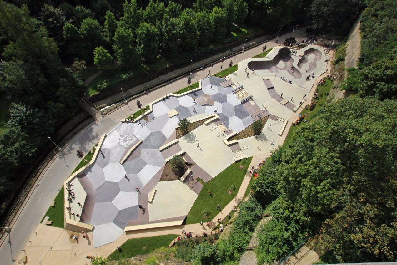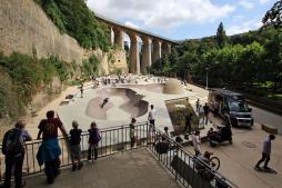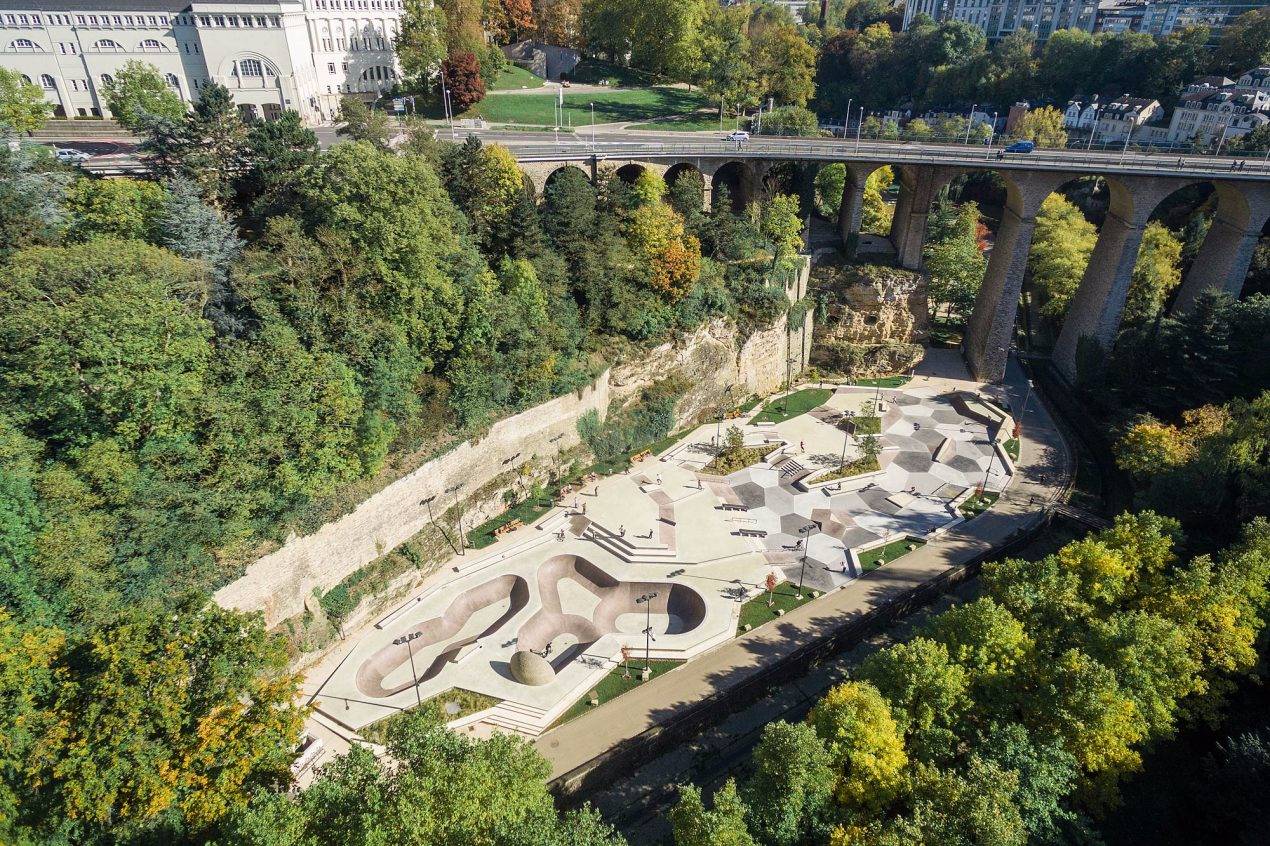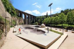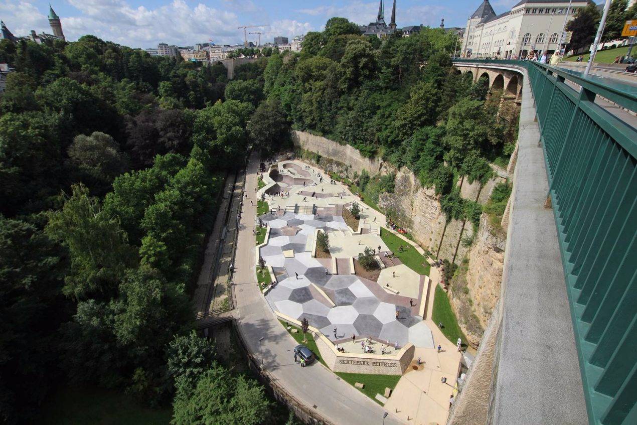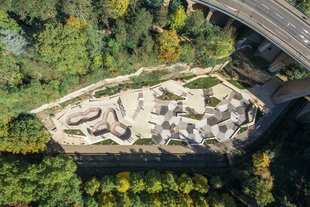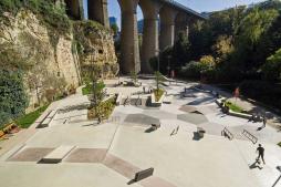 盧森堡滑板公園在Vauban古堡腳下的Peitruss Valley公園中落成。Vauban古堡環(huán)繞著盧森堡舊城而建,被聯(lián)合國(guó)教科文組織列為世界遺產(chǎn)。Peitruss Valley作為舊城區(qū)和新城區(qū)的分界,如今已成為一處包含游樂場(chǎng)、健身公園、綠地、林間小徑以及家庭野餐區(qū)的熱鬧景點(diǎn)?;骞珗@的正上方是橫穿Peitruss Valley、連接了中央車站和舊城區(qū)的大橋。