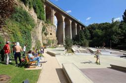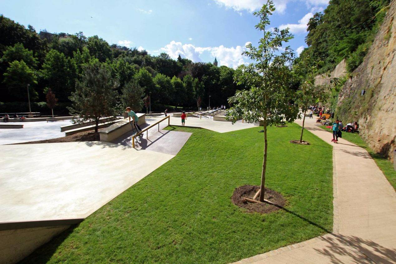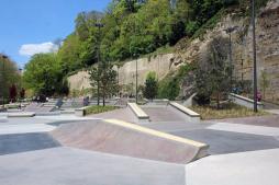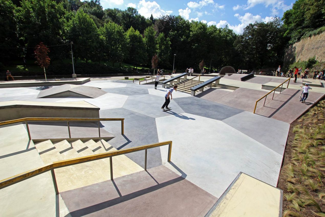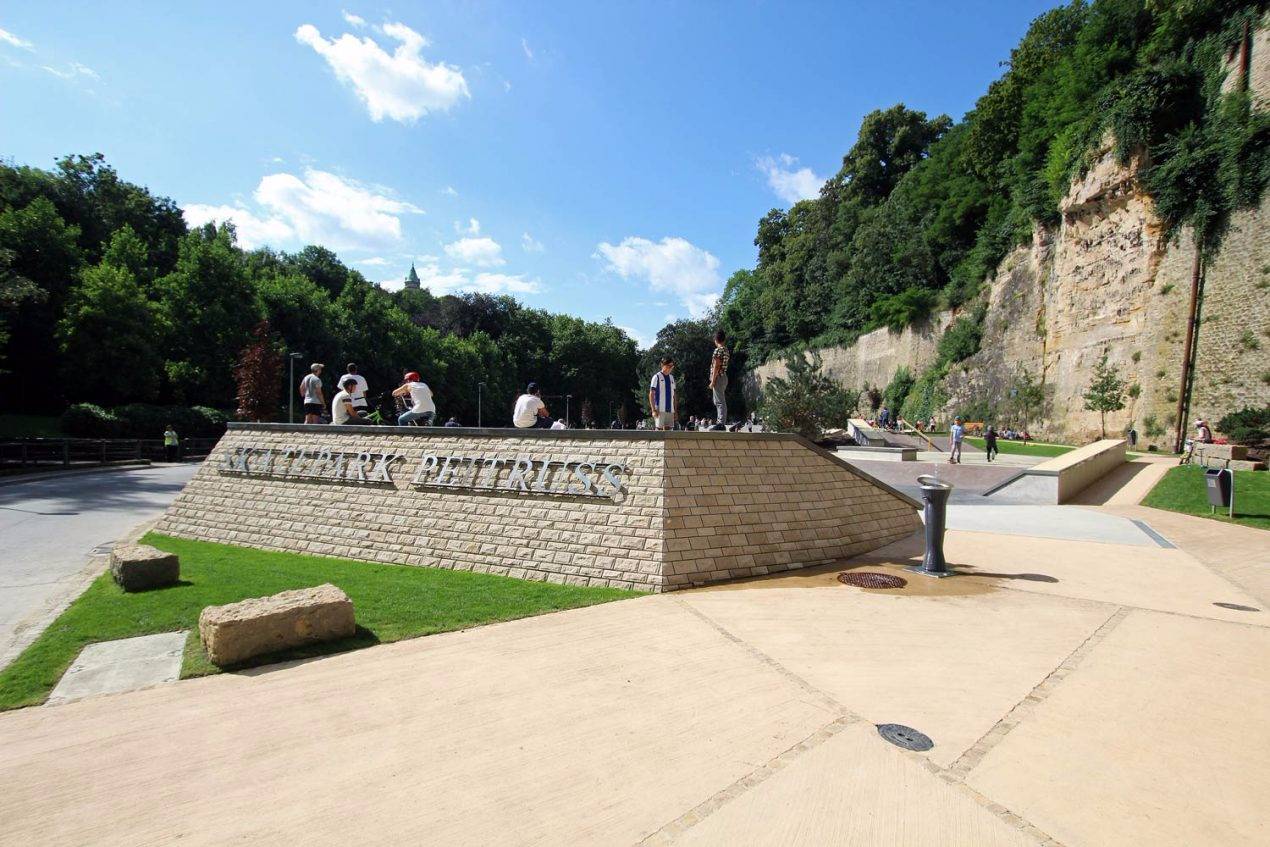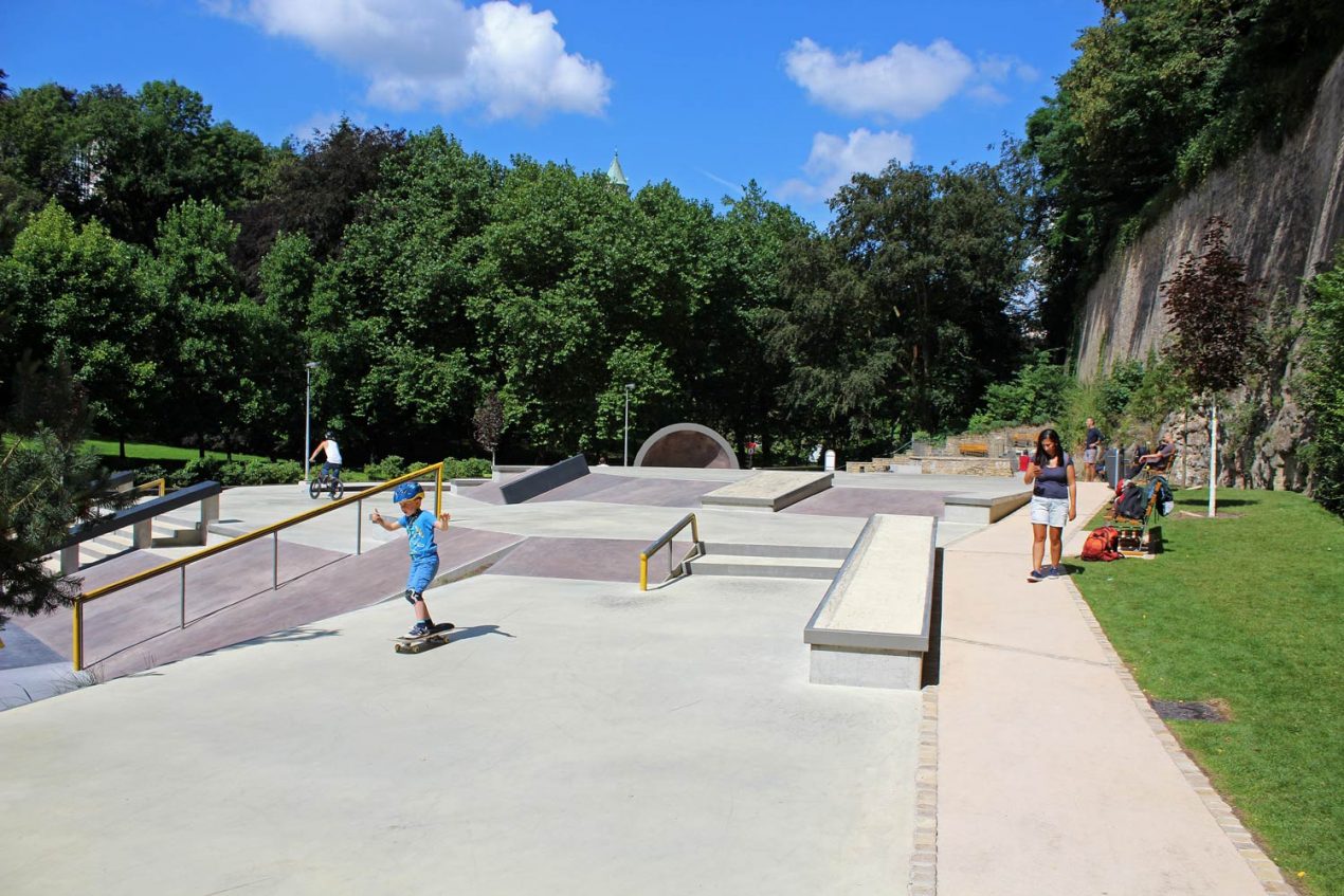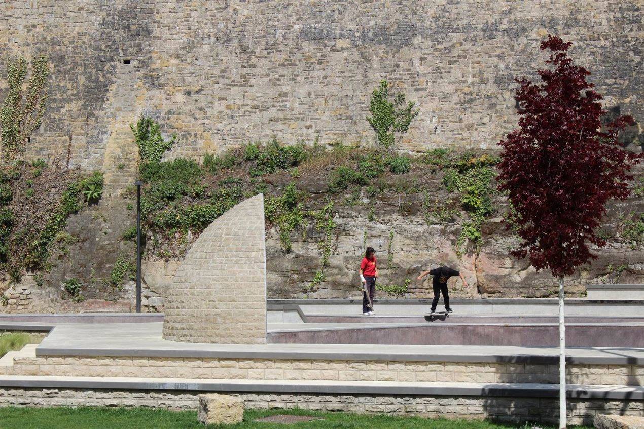 盧森堡滑板公園在Vauban古堡腳下的Peitruss Valley公園中落成。Vauban古堡環(huán)繞著盧森堡舊城而建,被聯(lián)合國(guó)教科文組織列為世界遺產(chǎn)。Peitruss Valley作為舊城區(qū)和新城區(qū)的分界,如今已成為一處包含游樂場(chǎng)、健身公園、綠地、林間小徑以及家庭野餐區(qū)的熱鬧景點(diǎn)?;骞珗@的正上方是橫穿Peitruss Valley、連接了中央車站和舊城區(qū)的大橋。