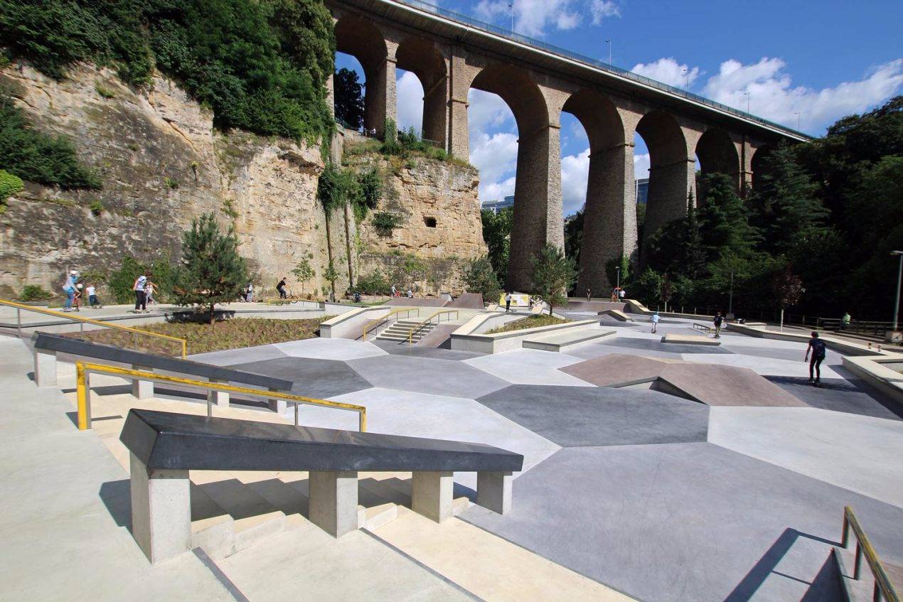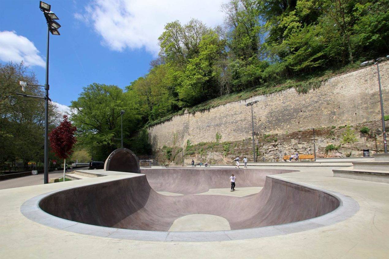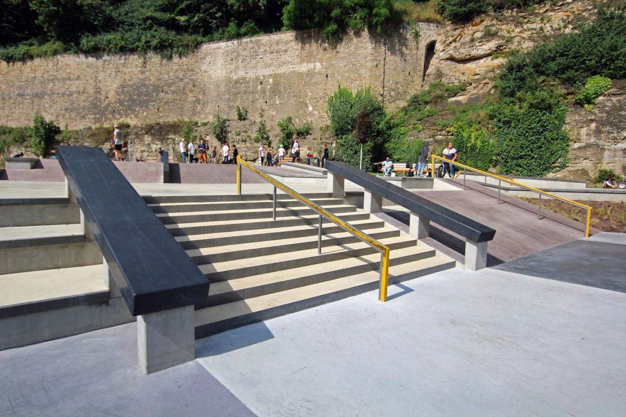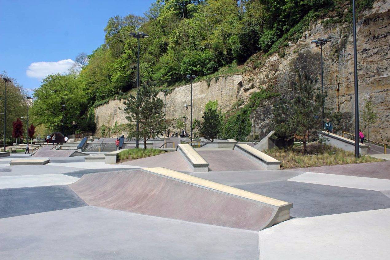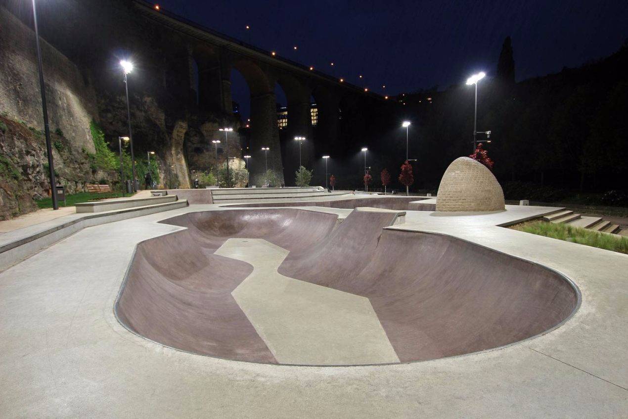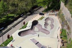 通過(guò)修建滑板公園,盧森堡市彰顯了其作為歐洲特大都市的身份地位。公園總面積為2750平方米,包括一個(gè)小型的碗狀場(chǎng)地,一個(gè)帶有3.2米高擋墻的大型碗狀場(chǎng)地,一座圓頂以及一個(gè)街道廣場(chǎng),是歐洲規(guī)模最大也是最具吸引力的滑板公園之一。