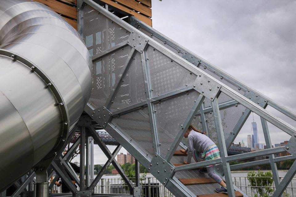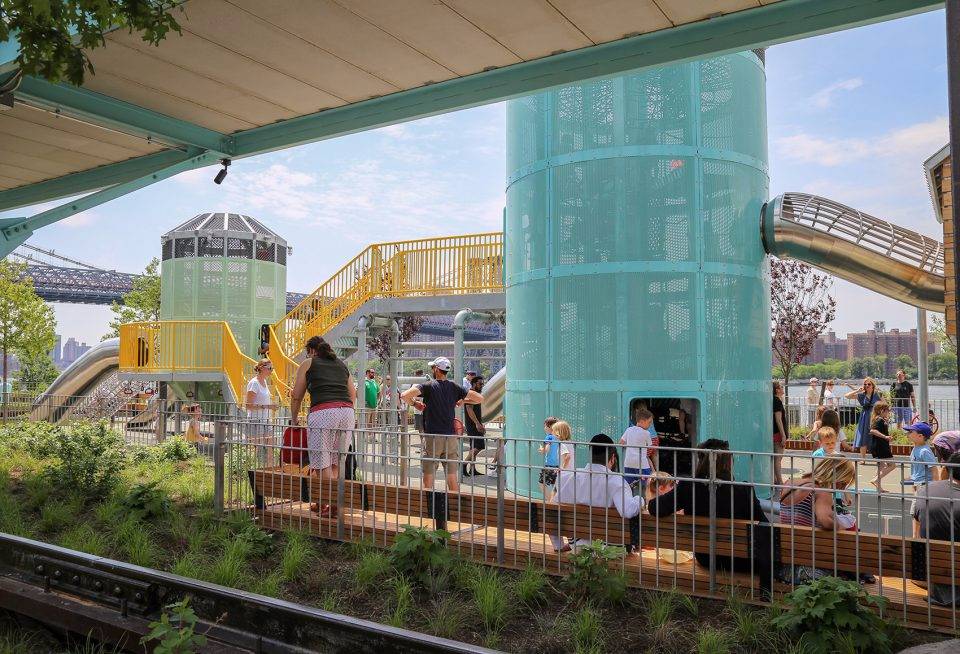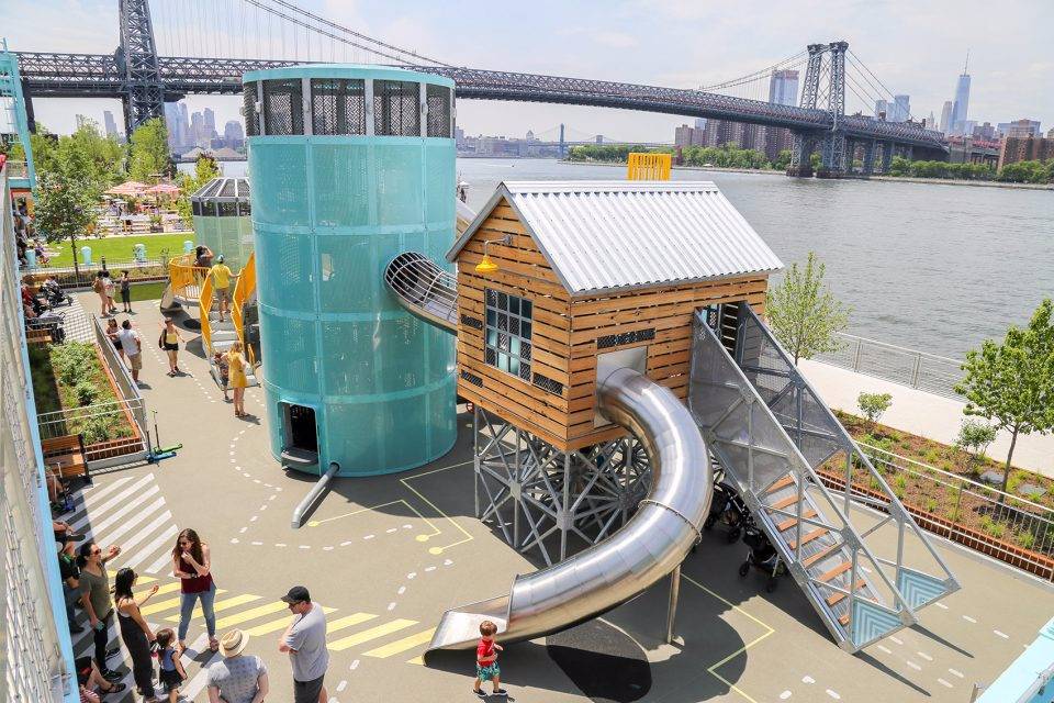 位于威廉斯堡大橋北面的多米諾公園是一個(gè)無(wú)可比擬的公園,全長(zhǎng)四分之一英里,為了紀(jì)念紐約最具代表性的工業(yè)濱水區(qū)的歷史而建。公園本身是與景觀設(shè)計(jì)公司James Corner Field Operations合作設(shè)計(jì)的,該公司也是High Line的首席設(shè)計(jì)。紐約最新的海濱休閑公共空間,就是多米諾公園游樂(lè)場(chǎng),通常人們稱(chēng)之為Sweetwater。多米諾公園游樂(lè)場(chǎng)可供公園游客使用,同時(shí)作為公園的最高點(diǎn),在這兒還能欣賞到曼哈頓天際線(xiàn),威廉斯堡大橋,曼哈頓大橋,以及其他多米諾公園周邊的無(wú)與倫比的美景。設(shè)計(jì)時(shí)在顏色,形態(tài),材料和布局方面都受到了多米諾制糖廠(chǎng)的影響,創(chuàng)造了一個(gè)能滿(mǎn)足城市探索和好奇心的空間。