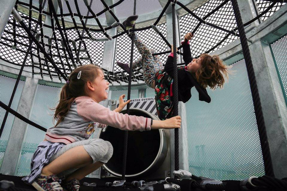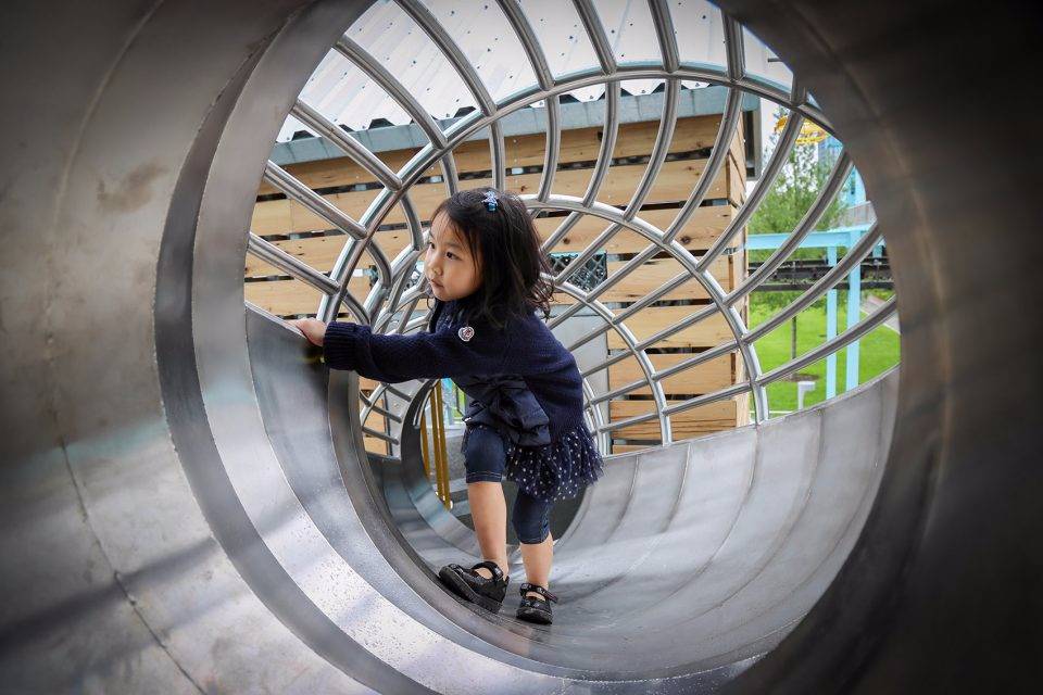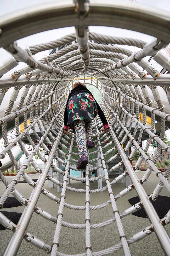 ▼孩子從小屋經(jīng)過(guò)不銹鋼滑梯爬向筒倉(cāng)