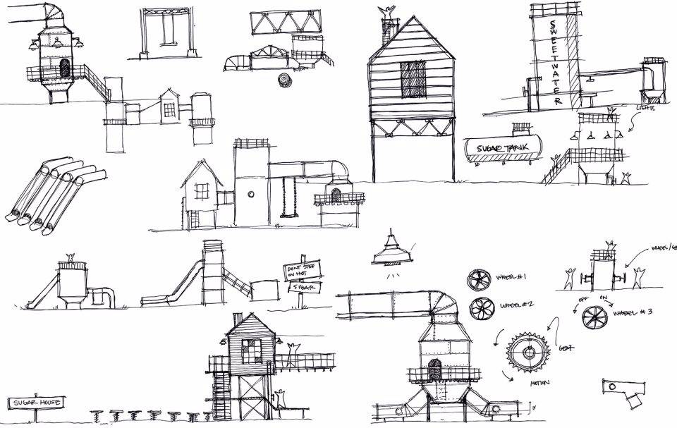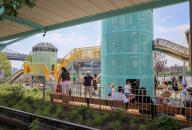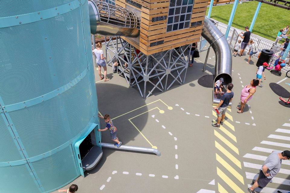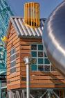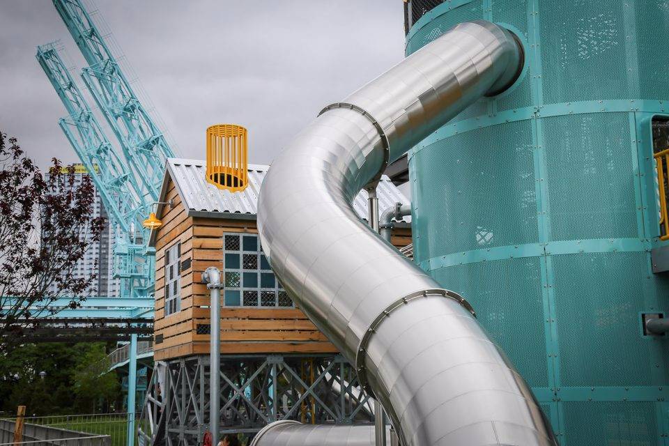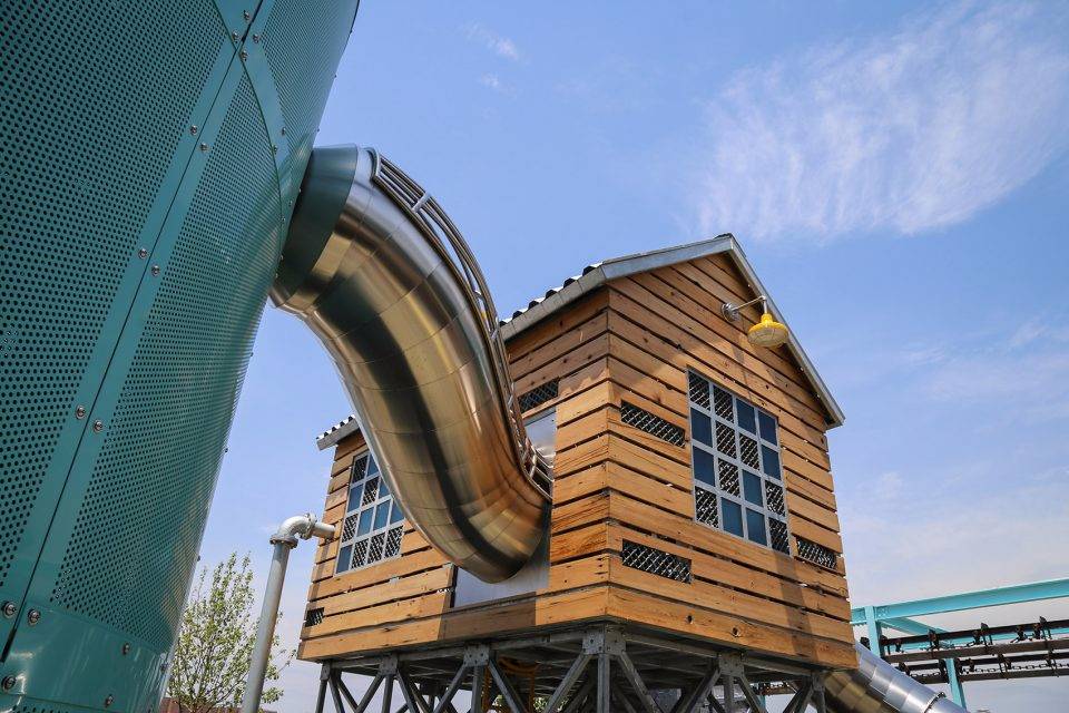 為了與老工廠(chǎng)的色調(diào)相配,Reigelman將亮黃色,青綠色,綠色和拉絲金屬色與現(xiàn)存的工業(yè)文物和工業(yè)元素相結(jié)合。工廠(chǎng)車(chē)間重復(fù)使用的木材被用于高架艙的外立面上,旁邊是色彩艷麗的工廠(chǎng)隨處可見(jiàn)的閥門(mén)輪。游樂(lè)園的三個(gè)主要部分——一個(gè)抬高的小屋,一個(gè)高高的筒倉(cāng),和一個(gè)工業(yè)集裝箱,其他諸如不銹鋼滑梯,攀爬處,以及走道,都能令人想起老工廠(chǎng)的復(fù)雜建筑和基礎(chǔ)設(shè)施。