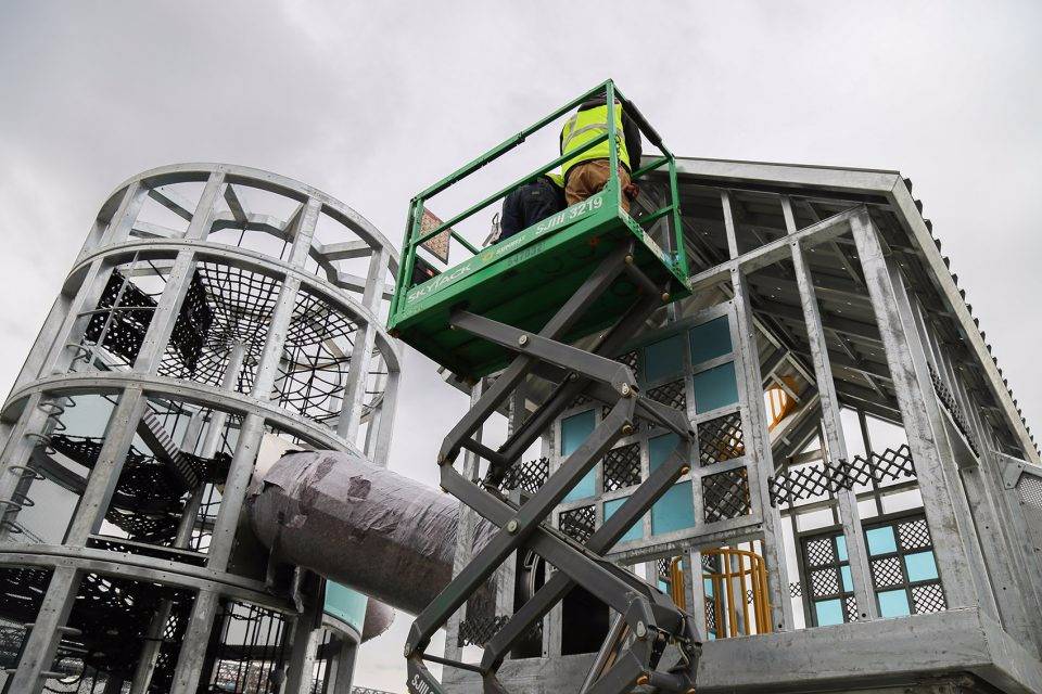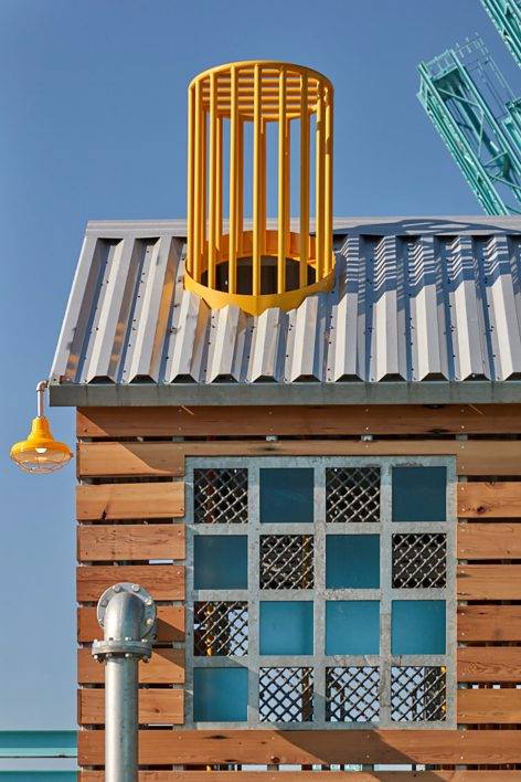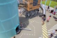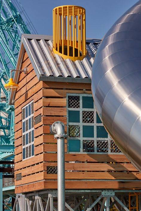 ▼游樂(lè)場(chǎng)由一個(gè)抬高的小屋,一個(gè)高高的筒倉(cāng),和一個(gè)工業(yè)集裝箱組成
