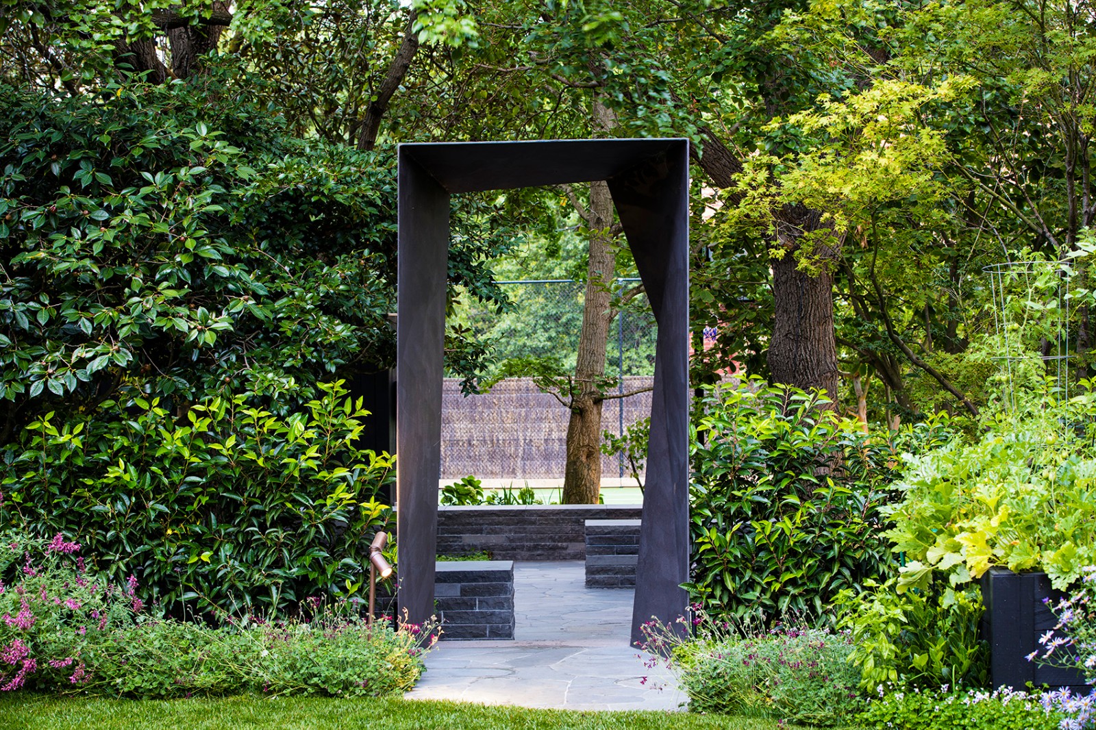 藍砂巖鋪路上設置了同樣材質的長椅,在提供座椅功能的同時也增加了建筑性的趣味。貫穿場地的硬性景觀將不同的花園區(qū)域連接在一起,保證了整體空間的流暢感覺。鋼制的門框有些類似于事務所在2015年墨爾本國際花卉及花園展中展示的“十字路口”作品,成為路徑終點的一個觸動人心的存在。