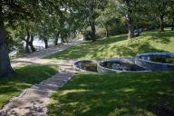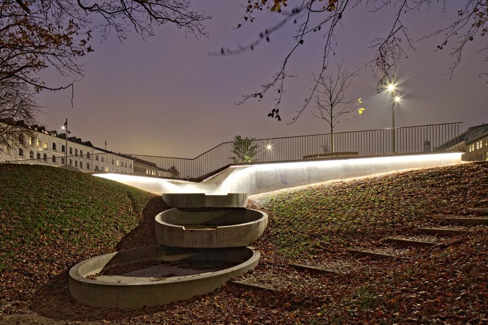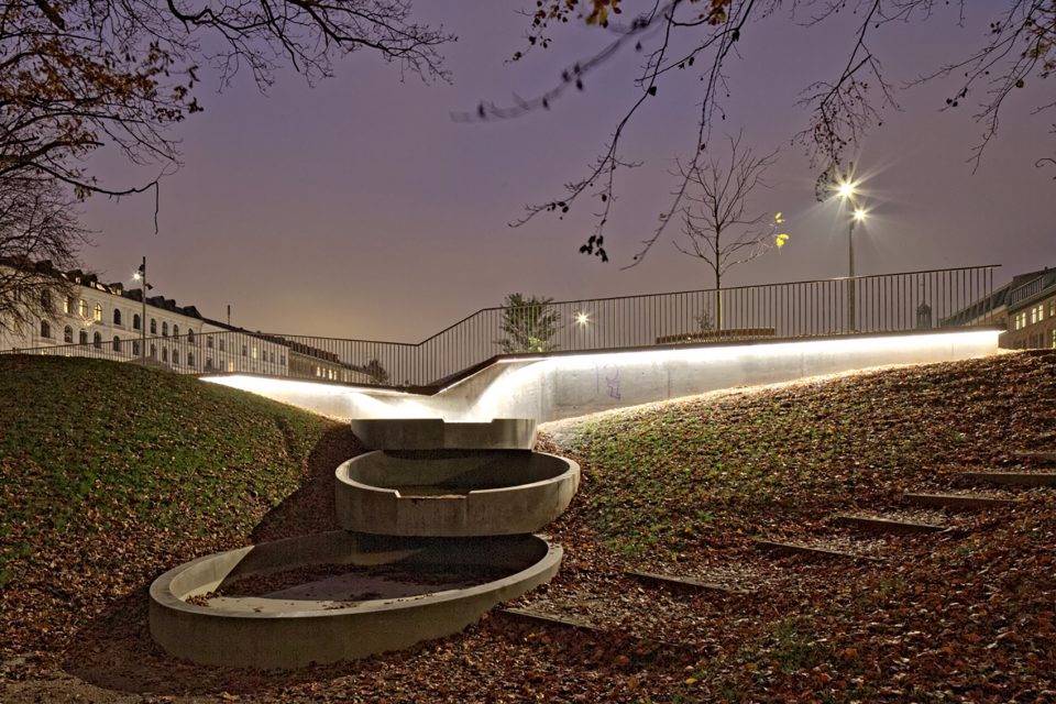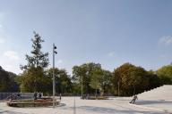 廣場的西南角和東北角被折疊起來,宛如兩雙翅膀,在構(gòu)成休憩空間的同時也為地下停車庫的斜坡提供了遮蔽。廣場的地面由西北角向H.C. ?rsteds公園傾斜,與公園內(nèi)伸向廣場的樹木融為一體。一條貫穿廣場的溪流順應(yīng)著地勢匯入H.C. ?rsteds公園邊上由三個橢圓形水池搭成的階梯。