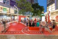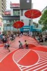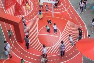 其他特色還有:定義了裝置邊界的賽跑道,作為障礙和創(chuàng)意平臺的金字塔形體塊,為了父母和其他自發(fā)形成的游戲設(shè)計(jì)的長椅等等。使用不同灰度的單色處理方法也被應(yīng)用于現(xiàn)有的城市設(shè)備和裝飾物上,為超現(xiàn)實(shí)的“紅色星球”帶來更具沉浸感的體驗(yàn)。
