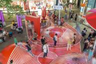 從最開始Life Hub@Daning的市場團(tuán)隊(duì)就堅(jiān)持將其打造成一個(gè)富有想象力、能帶給人靈感的創(chuàng)新場所。該設(shè)計(jì)與裝飾性裝置相比應(yīng)更加出人意料,并且吸引孩子們和成人來使用它,而不是看看以后默默地走過。改造把一個(gè)流通區(qū)域變成一個(gè)讓人們停留的空間,顧客們可以把他們的孩子和家人一起帶來,和其他孩子及家庭互動。設(shè)計(jì)使用了一種超現(xiàn)實(shí)的方法,即打破常規(guī)的感知規(guī)則和已經(jīng)被認(rèn)為是現(xiàn)實(shí)的東西,以激發(fā)孩子們的想象力和創(chuàng)造力,讓他們沉浸在豐富多彩的體驗(yàn)中。對路人來說,這是一個(gè)意想不到的地方。