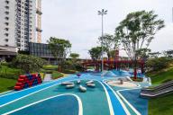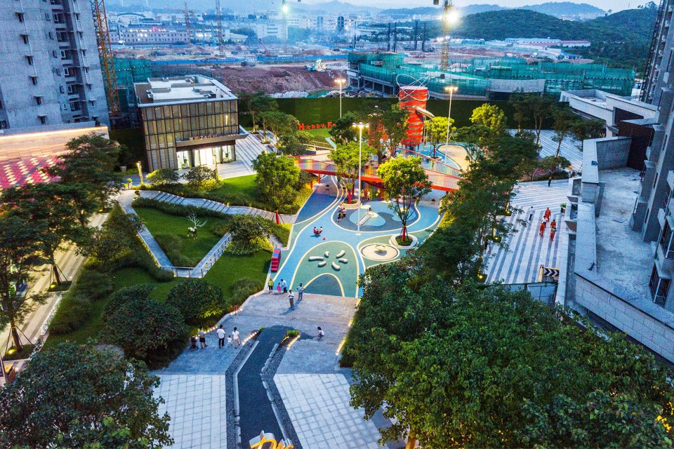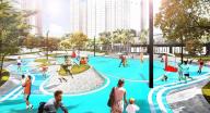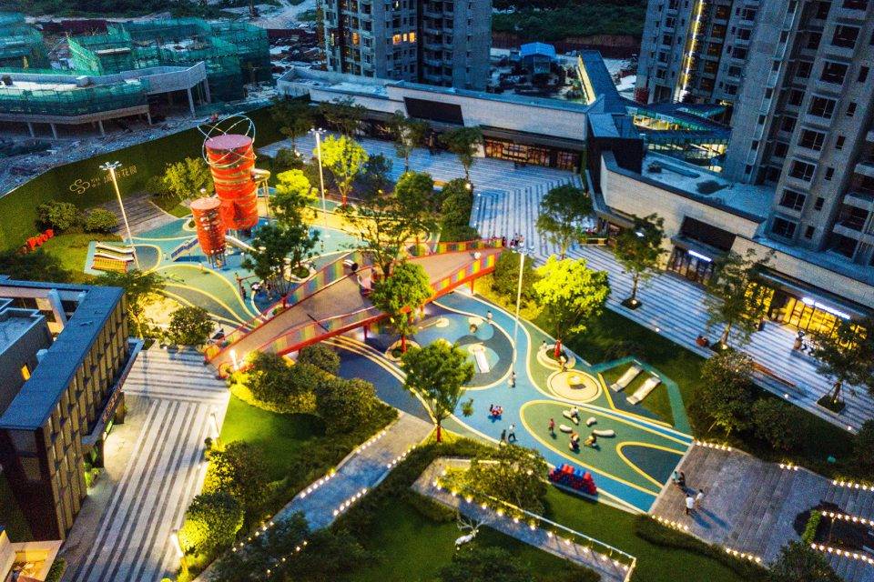 東莞萬科中天城市花園位于東城區(qū),場地周邊交通便利,生態(tài)環(huán)境良好,地形變化豐富。基地位于城市花園社區(qū)的中間,是一個公共綠地景觀。中間公共綠地的原有標(biāo)高由北至南逐漸降低,并且比兩側(cè)地面標(biāo)高低,呈谷地狀態(tài)。景觀設(shè)計著眼于如何創(chuàng)造一個社區(qū)與城市共享,滿足不同人群活動需求的公共空間。無論是周邊的居民還是社區(qū)內(nèi)的居民,我們希望來到這里的人們猶如來到了一個主題樂園,可以在這里感受多樣的空間氛圍,進(jìn)行豐富的體育活動。