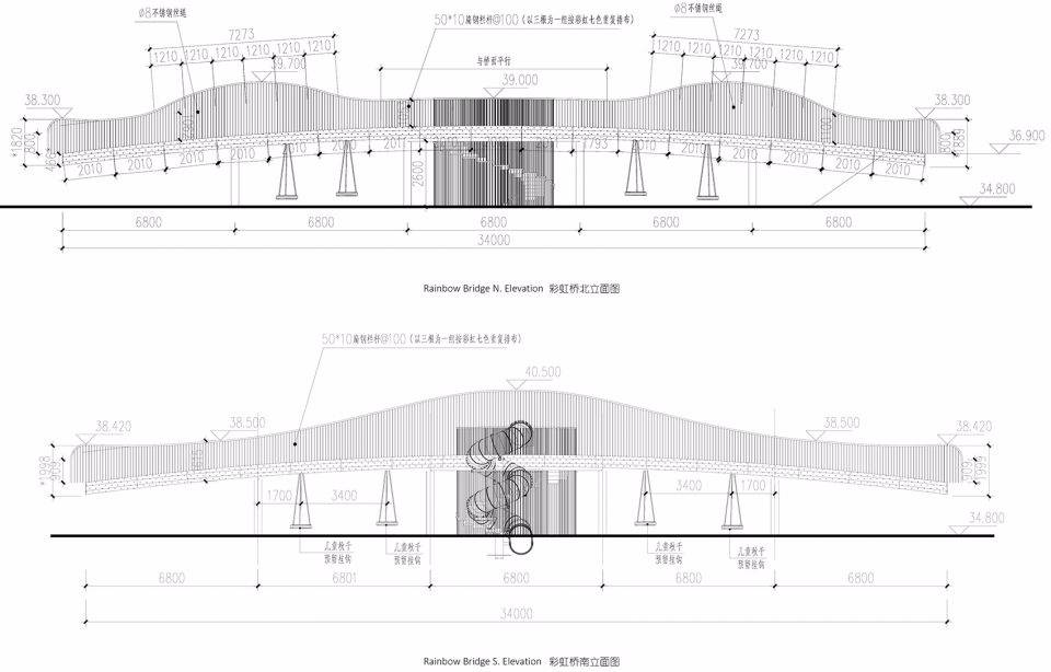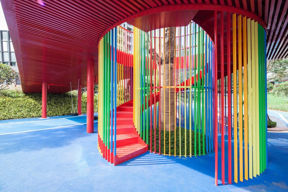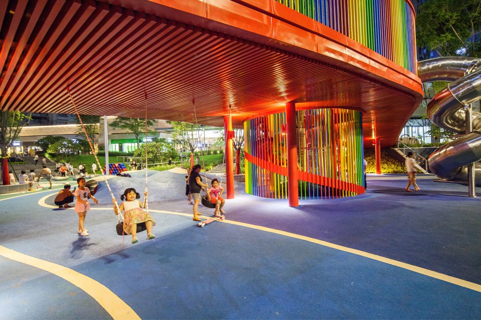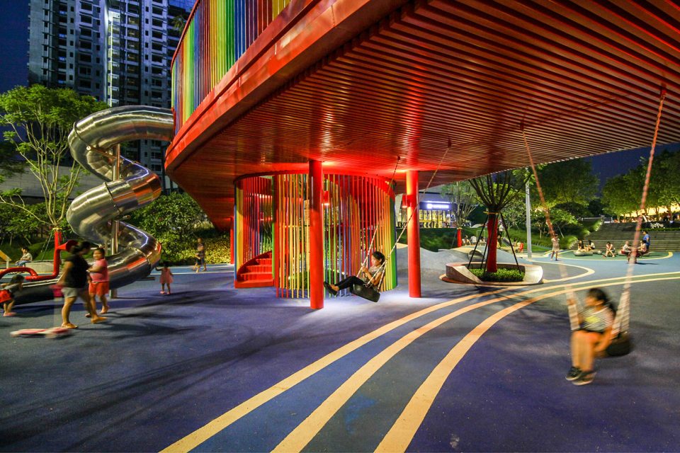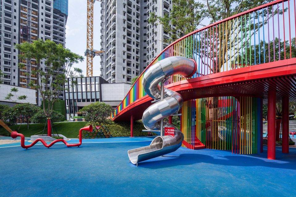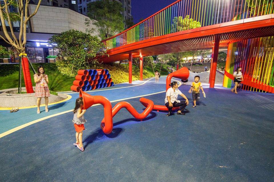兒童“活力谷”,利用原有的谷地空間打造一個安全,圍合感強的空間,為兒童營造適成長發(fā)育所需要的鍛煉場所。谷地內(nèi)部設(shè)置了秋千、繩網(wǎng)、攀援、攀巖墻、大型滑梯等具有不同挑戰(zhàn)難度的兒童項目,滿足不同年齡兒童的活動需求。色彩選擇以清新的藍(lán)色系鋪地來隱喻水流,以色彩豐富跨越谷地橋體隱喻彩虹。彩虹橋上結(jié)合兒童滑梯和秋千等兒童設(shè)施進(jìn)行的設(shè)計,中間還有一棵大樹穿透橋體,讓每個通過橋的人都能感受到自然的趣味。作為豐富了豎向景觀空間。這里將成為兒童自由奔跑、嬉戲、撒野、挑戰(zhàn)自我的活力谷地。