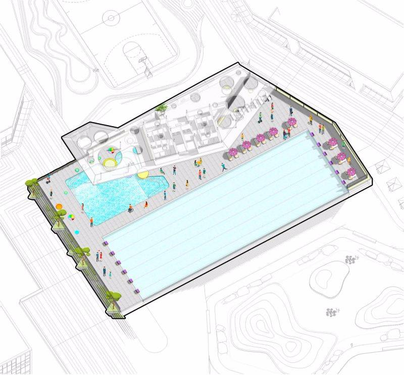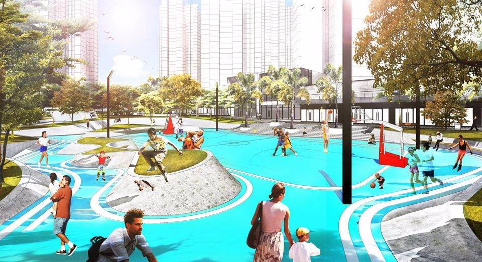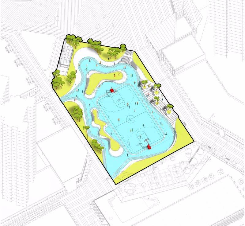 設(shè)計運用起伏的地景將籃球場進(jìn)行圍合,人們可以在此進(jìn)行滑板,球類運動。
