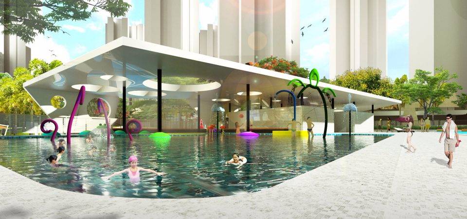 結(jié)合高差,設(shè)計將泳池南邊設(shè)計為無邊界,同時配以疊水景觀,連接南邊的親水庭院。更衣室建筑提供了場地的休憩場所。