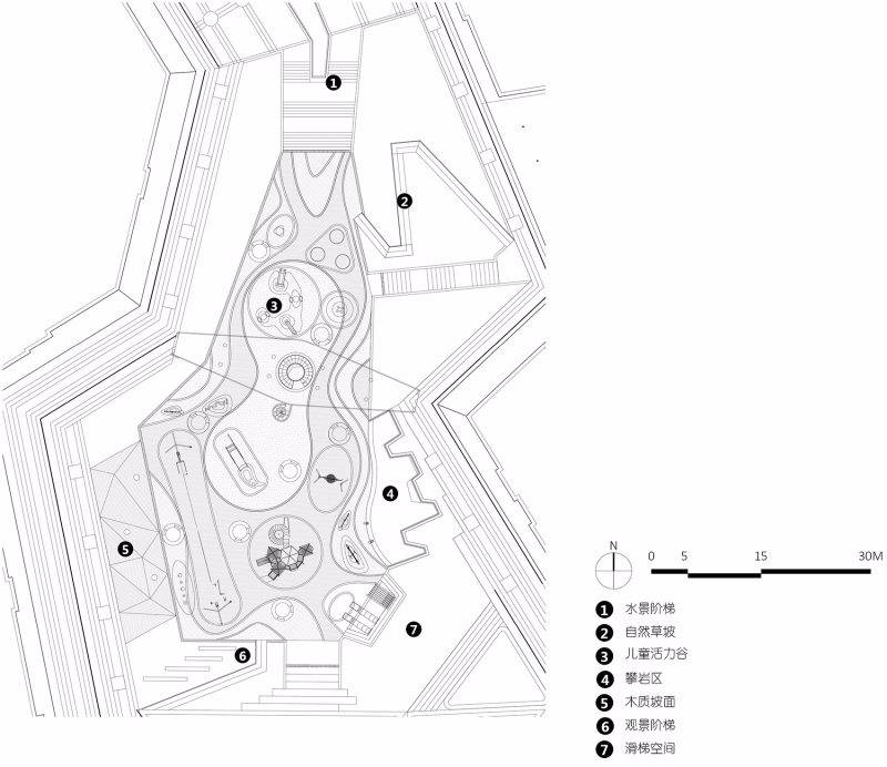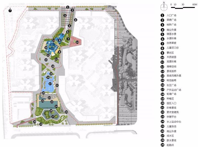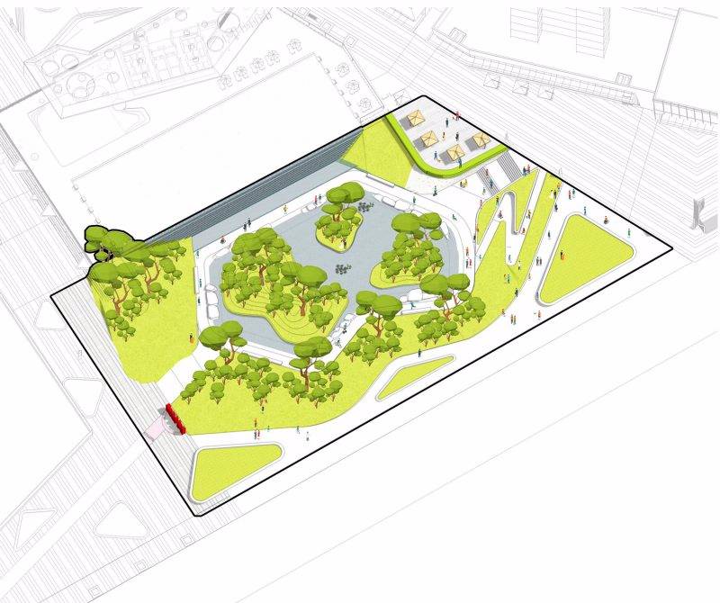 3 最終將綠廊劃分為多個主題區(qū)域,用兩側(cè)的步行街進(jìn)行串聯(lián),在保持整體性的同時又有每個空間的獨特性。分區(qū)由北至南分為:樹陣廣場,兒童活力谷,戶外運動廣場,水上運動中心,生態(tài)水景庭院,其中樹陣廣場與兒童活力谷為一期開放。