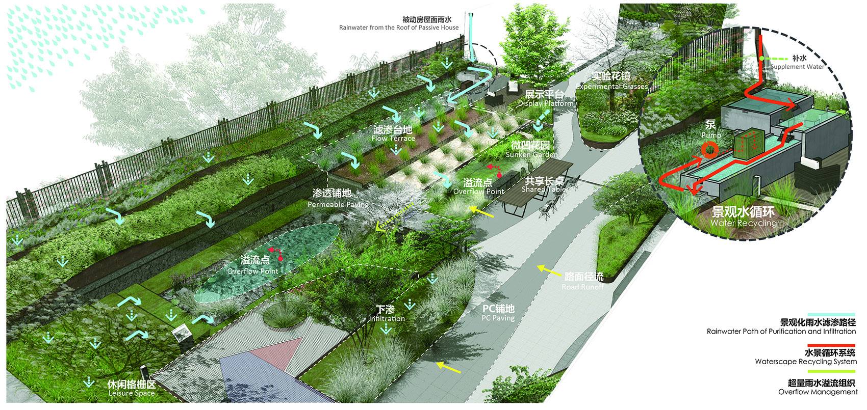 以可持續(xù)景觀理念探索生態(tài)景觀的落地性。用雨水街坊方式綜合解決海綿城市要求的景觀營造;結合景觀EPC的工作方式,設計與施工緊密結合,達到效果一致、省時間、省成本的目的。景觀結合文化與技術表達,引導人們參與互動,讓景觀促進生活美好。