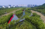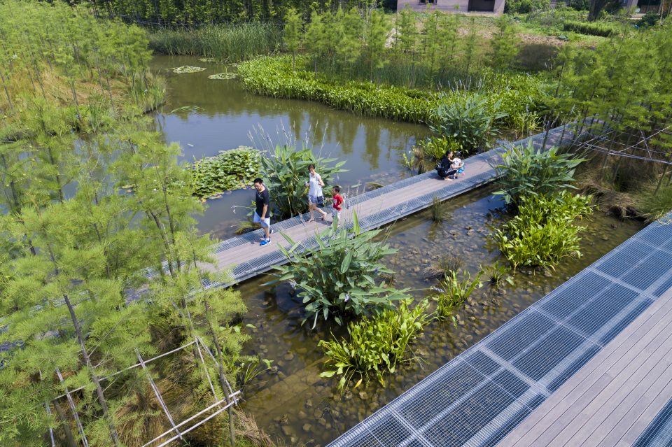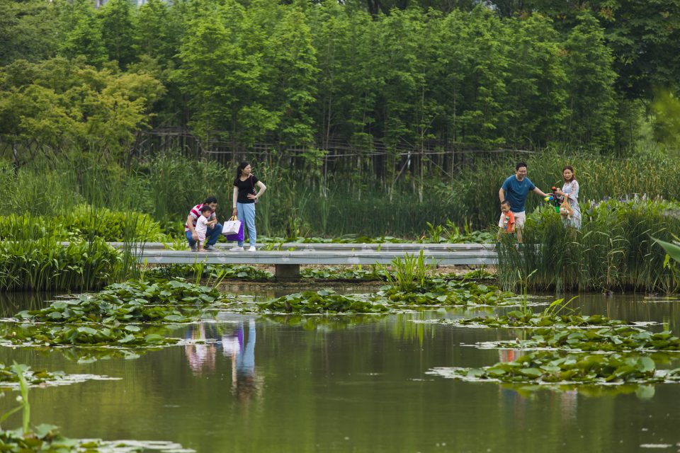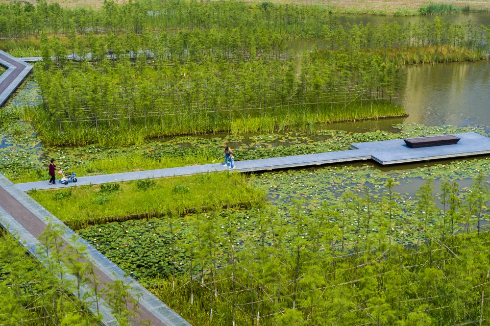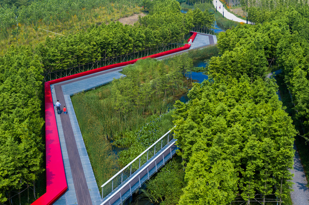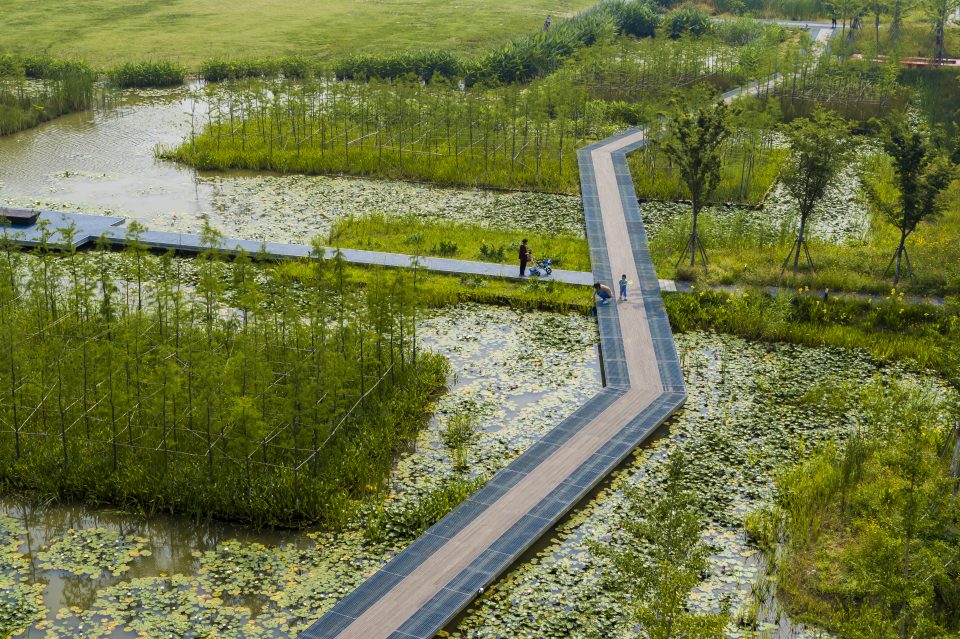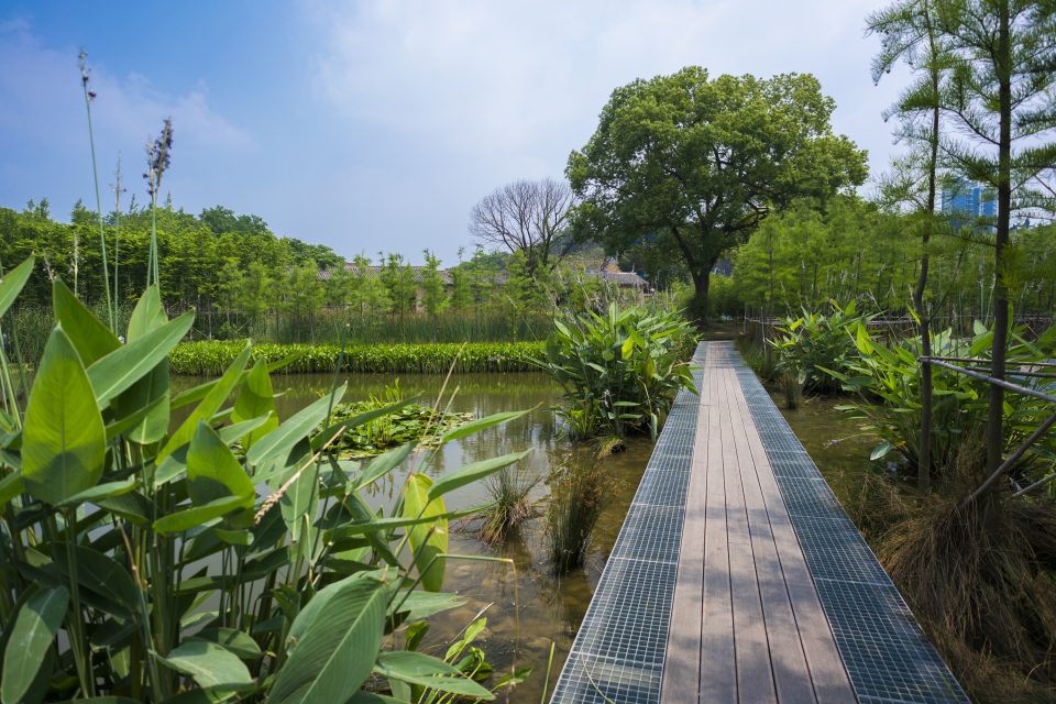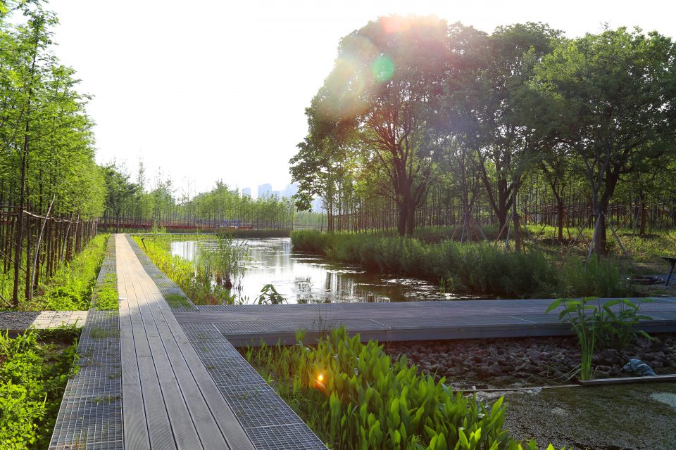 公園的核心是一條帶狀、具有水凈化功能的人工濕地系統(tǒng),它將吸納來自場地及周邊地塊的雨水,通過沉淀以及長達1公里的濕地凈化后,流入末端水質穩(wěn)定區(qū)。凈化后的雨水可用于公園綠化灌溉及道路沖洗等。