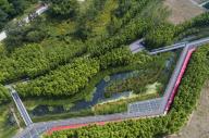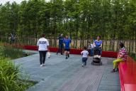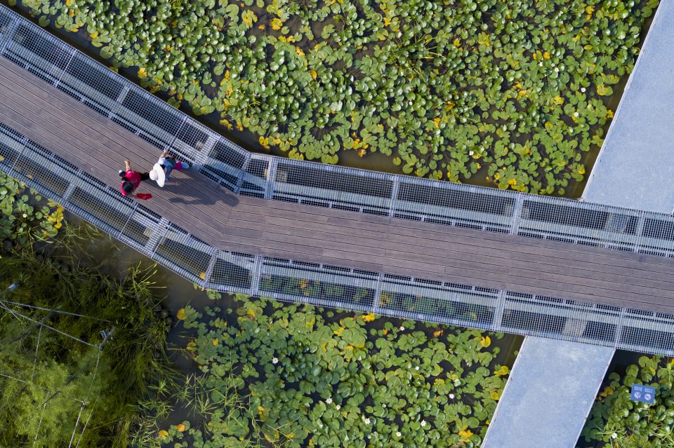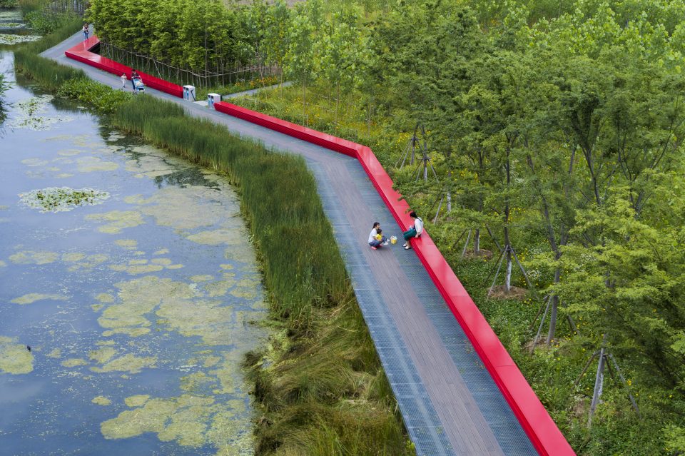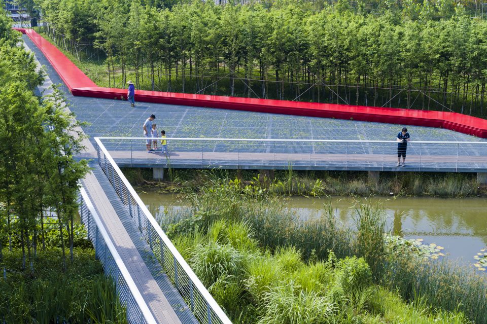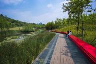 慢行系統(tǒng)由鋼格柵棧道及紅色玻璃鋼座椅組成,提供集游客漫步、觀光、休憩、科普教育等為一體的帶狀功能體驗。