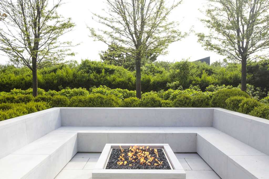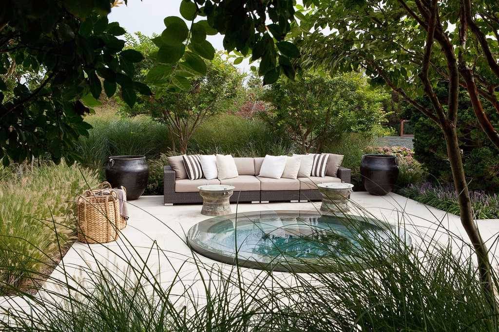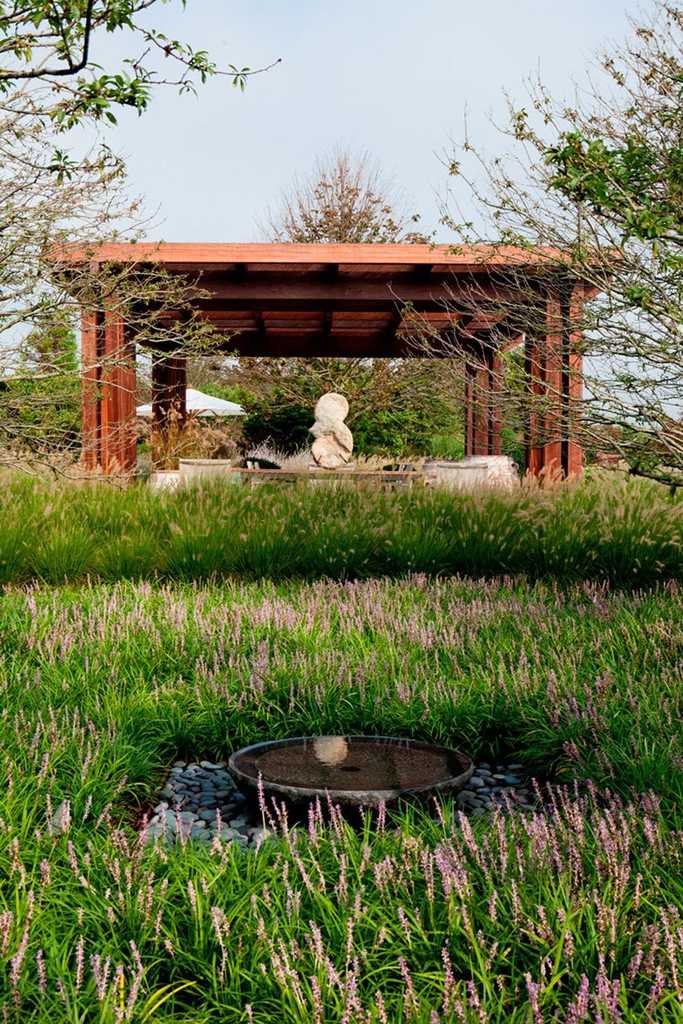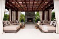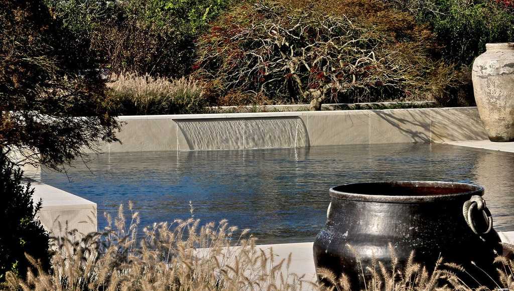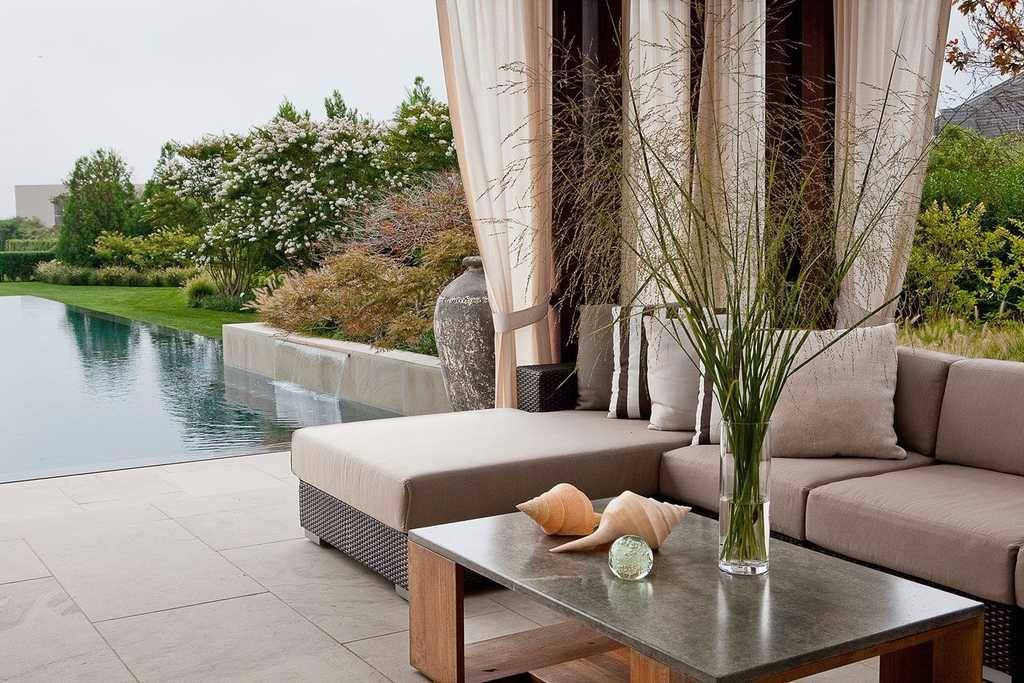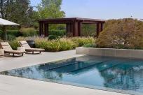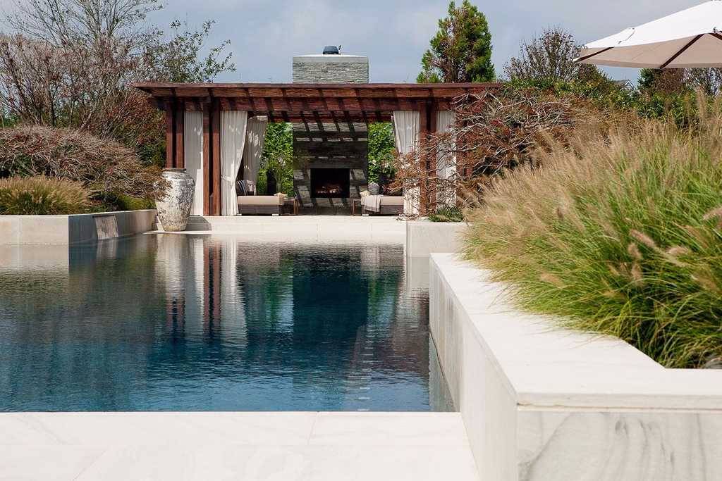 天然木廊架既可以遮陽,又可以將室外客廳和獨(dú)立的餐廳隔開。一個(gè)負(fù)邊緣的游泳池和獨(dú)立的圓形spa沿著中心的走道被組織起來,通向一個(gè)私人桑拿浴室和更衣區(qū)。Sagaponack花園內(nèi)的空間適合二、二十人居住,細(xì)節(jié)上注重奢華和放松。