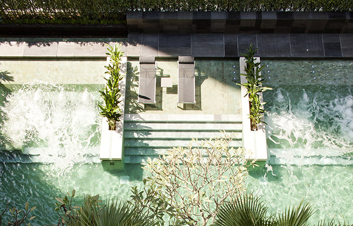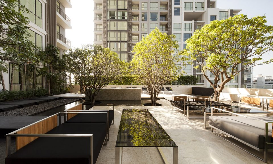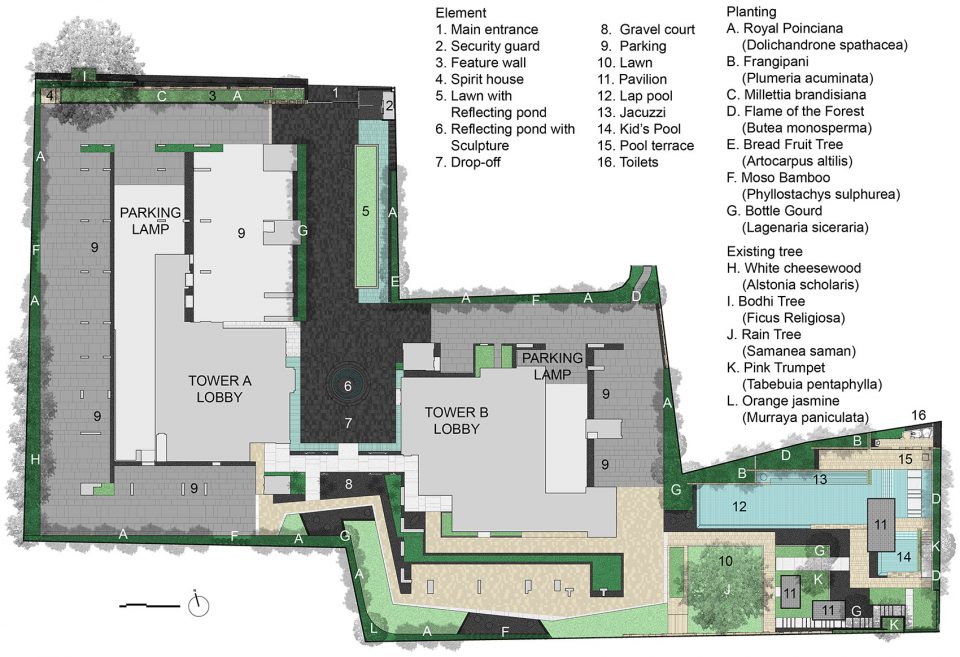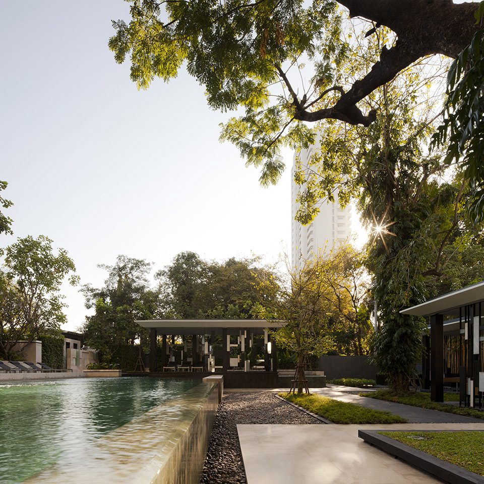 這個擁有三個花園的公寓景觀項目,位于曼谷鬧市區(qū),其內部古老而巨大的雨樹(豆科含羞草)以及一些小型寄居者(松鼠和鳥類)被設計師看作是場地內的“原住民”。設計師通過設計向這些“原住民”表示著尊重,并倡導入住的業(yè)主與這些“原住民”及周邊自然環(huán)境和諧共處?;谶@一理念,該設計將雨樹作為該公寓景觀的主體,其它景觀元素作為配景和補充。
