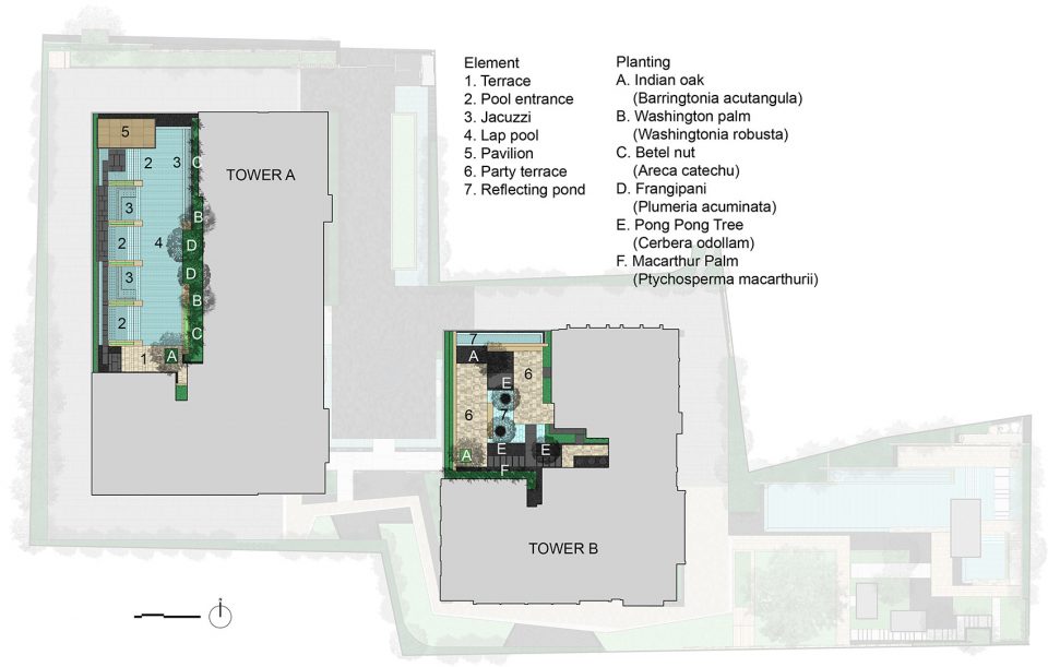 兩個屋頂花園設在兩個塔樓的屋頂。在塔樓A的停車樓上方,設計師策略性地安排了一個水池。該設置不僅成為一處景觀亮點,促進了樓盤銷售;水體也很大程度上降低了樓板的溫度。由于屋頂面積有限,設計師沒有留出很大面積作綠化用,只是圍繞著水池做了一些小型的花帶,精選了兩株素馨樹栽植在上面。而素馨樹的樹冠延伸到水面之上,減少了建筑表面的陽光直射。