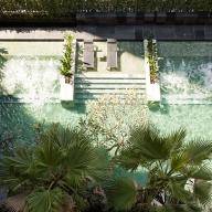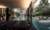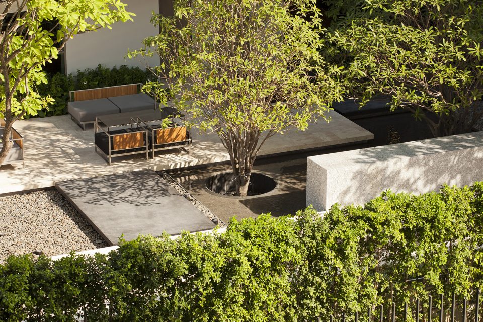 景觀設計師的下一個目標是圍繞著這些樹來設計主庭院。他們計劃將這片場地塑造成曼谷的中心綠洲。這一愿景從研究這些雨樹就開始了,并一貫而終,最終收效頗豐。例如,由于樹冠遮擋了部分陽光,營造出了林下舒適的小氣候。這處林下空間自然也成為了一處景觀中的“新涼亭”。為了減少樹木球根對地面的影響,設計師避免了大面積種植,而是在不同區(qū)域設計了一些分散的小臺地,在其上種植了鼠尾草,鋪設了一些卵石,來營造微氣候。基于同樣的原因,主池塘也選擇了遠離樹木的位置,并在四周設置了圍墻,高于花園大約80cm,借以邊緣景觀設置和穿流而過的流水營造出了“白噪音”效果–即減弱外部交通噪音的影響。該設計的靈感來源于這個項目的名字,Quattro. 設計師將矩形組合形式運用到花園中,一些大矩形構成臺地,而小矩形作為路徑。一系列矩形石塊被設計到亭子的墻體上,營造出半圍合效果。主花園旨在表現(xiàn)鄉(xiāng)村景觀意象,以疏解新駐業(yè)主的思鄉(xiāng)之情?;▓@中設有一開敞空間,除了保留的雨樹,沒有設置任何景觀設施,成為了項目中罕見的做法。