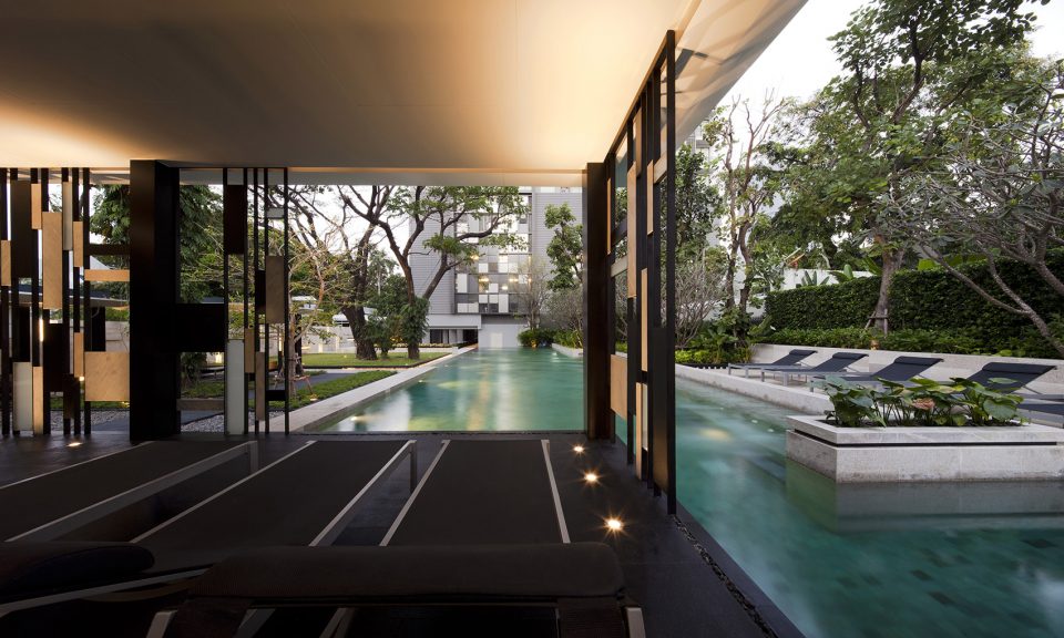 Quattro是一個服務于曼谷上流社會的高端住宅項目。如果你環(huán)顧當今的曼谷環(huán)境,你很難在市區(qū)中找到裸露的土壤,大部分地面都被混凝土和柏油覆蓋。市民的生活也隨著城市面貌而發(fā)生著變化。遙想過去,人們住在城外的小房子里,有自己的院子,每日為工作通勤于市區(qū)間。而今時不同往日,為了適應生活的快節(jié)奏,泰國新一代年輕人選擇了搬離家鄉(xiāng),移居到了城市的高樓大廈中。以往的平房被認為是過時的,高樓大廈才是主流選擇。如今的我們基本上都生活在碼放整齊的城市“盒子”里。無論是30平米的蝸居還是更大的豪宅,但終究只是“盒子”。這些混凝土“盒子”一個挨一個地不停向上堆積,而能看到裸露土地的區(qū)域卻越來越少。導致這樣的居住模式與理想的“家”的面貌背道而馳。如果你讓孩子們畫出理想的“家”的樣子,你一定會發(fā)現(xiàn)結果都是相似的,即,里面會有座房子,一個像花園的空間,一個可以釣魚的池塘,等等。相比我們如今的實際居所,我們的確是擁有一套房子,但是花園和池塘早已不復存在。設計師表示,對于這種不盡如人意的現(xiàn)狀,他們正試圖去改變它。