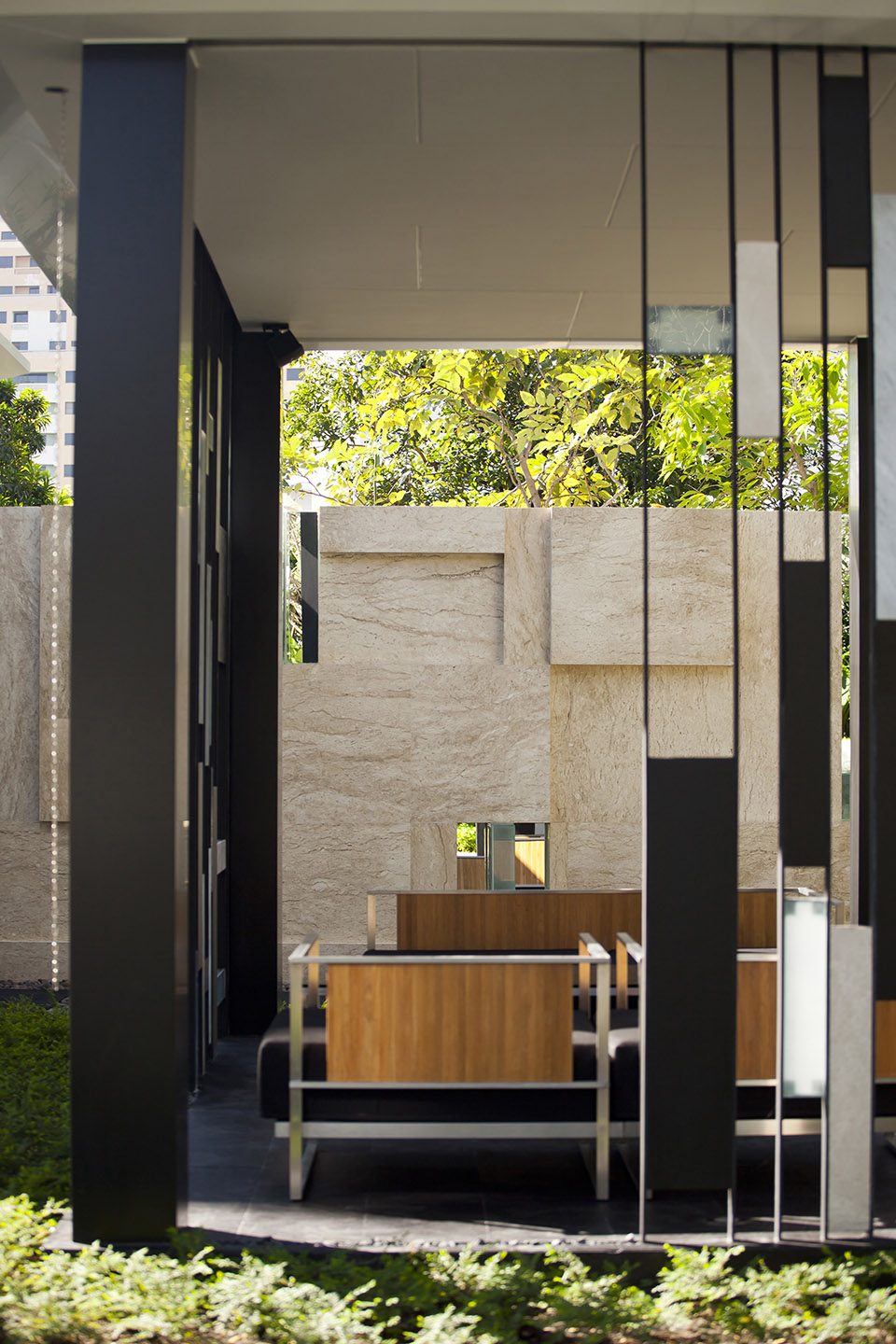 Quattro原址是一處帶有大花園的住宅。當設計師第一次探訪這個場地的時候,看到這些據(jù)說有40年歷史的漂亮雨樹,萌生的第一個想法就是“要不惜任何代價把它們保留下來”。本著這一信念,景觀設計師和地產商,建筑師以及法律顧問密切交流合作,調整了兩棟居住樓的位置,才使得這些雨樹免遭砍伐。雖然其結果導致地產商減少了一些開發(fā)空間,但能使這些無價資產得以保留,著實令人欣慰。