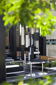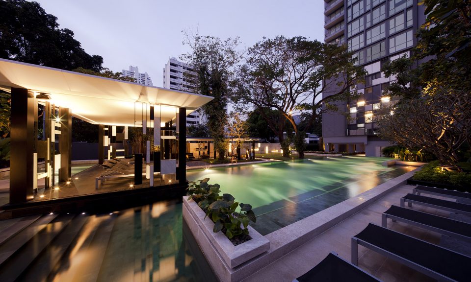由于塔樓B近鄰主花園,因此沒有為其另設水池。而是設置了一個多功能聚會臺地。利用和之前類似的做法降低樓板溫度,該臺地被分為兩個鋪裝區(qū)域,中間由反光池分隔。曼谷的鄉(xiāng)土樹種是印度橡樹和乒乓球樹,設計師在這個臺地上栽植了一些以營造場地微氣候。盡管曼當?shù)貧夂虿⒉贿m于進行室外活動,但是這個場地卻全天都很受歡迎。