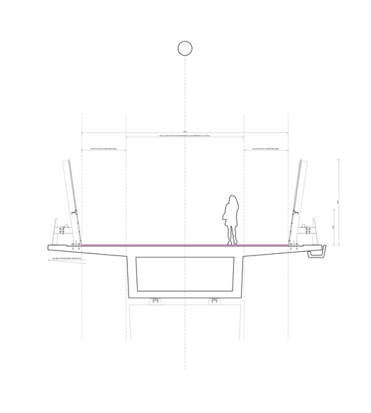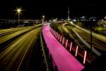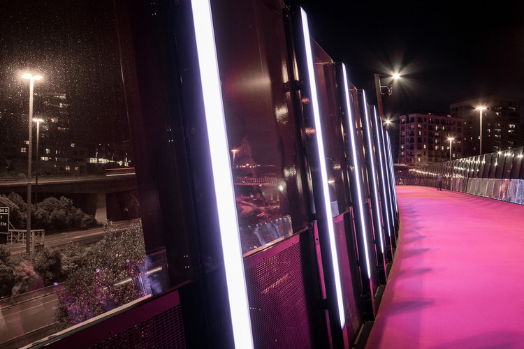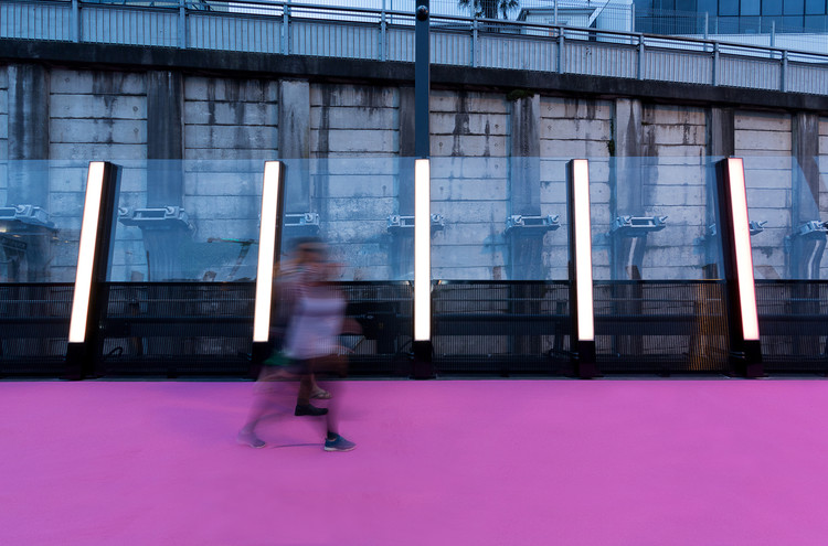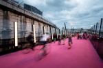 之前的瀝青高速被賦予了異常鮮艷奪目的粉色樹(shù)脂和集料表面。這種做法把棄用的高速轉(zhuǎn)變了一個(gè)供騎行愛(ài)好者和行人使用的高度當(dāng)代主義的城市空間。為了黃昏與夜晚的景觀,項(xiàng)目沿著東側(cè)自行車(chē)道的邊界布置了300個(gè)定制LED燈箱,如此營(yíng)造了一條光亮的脊線(xiàn)。