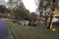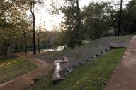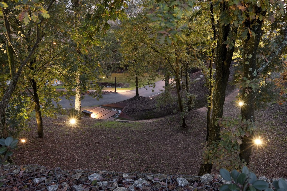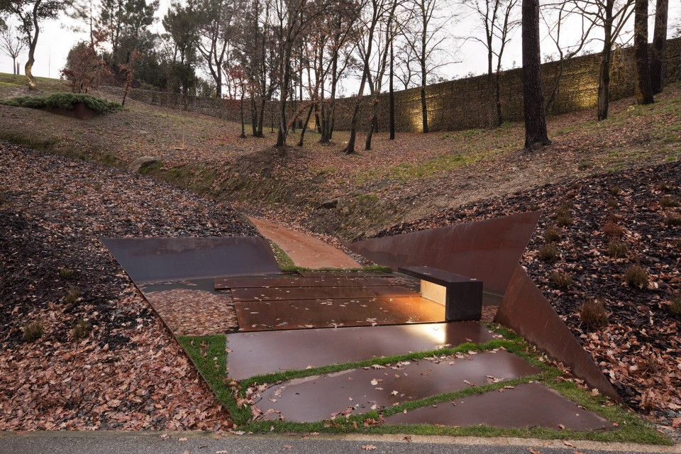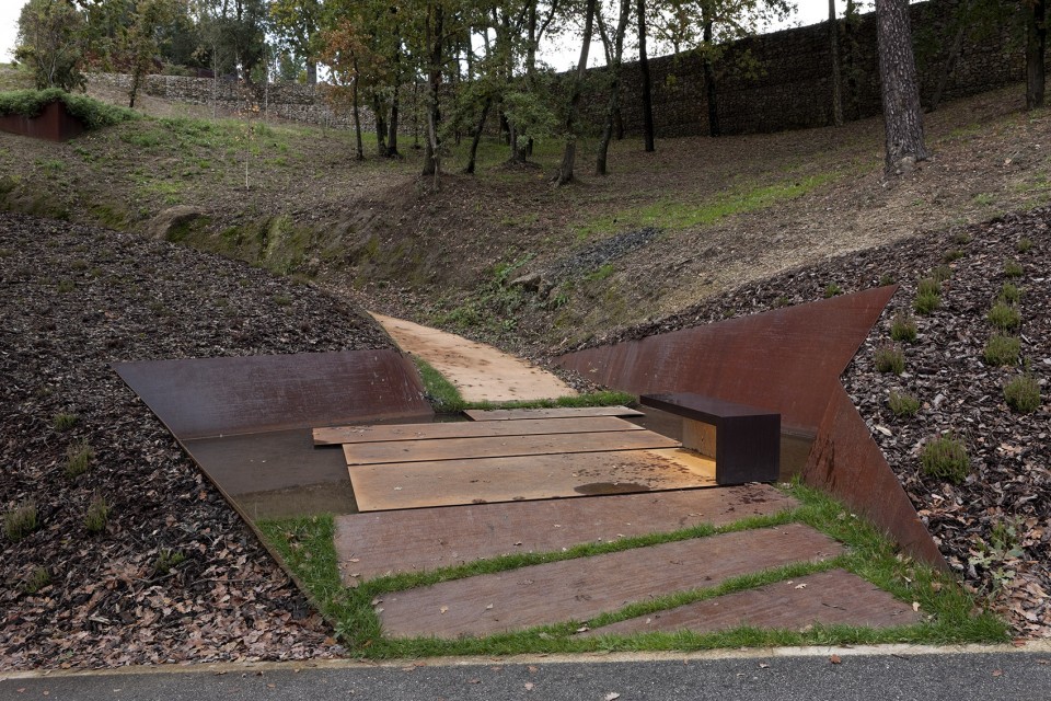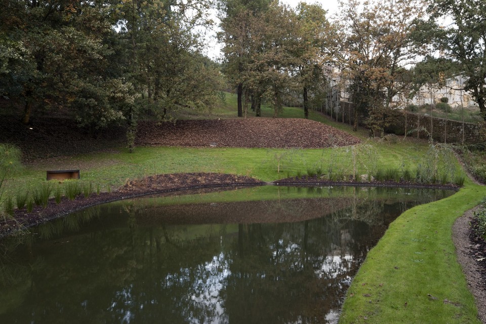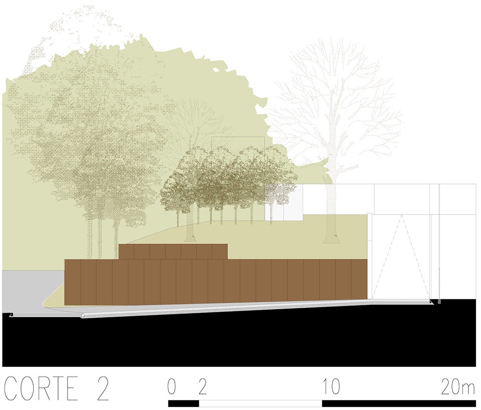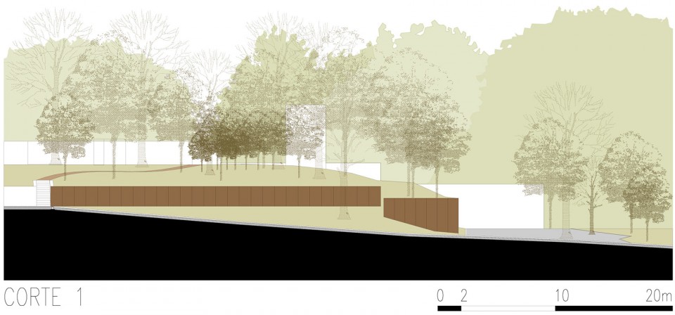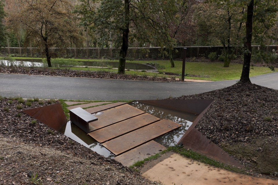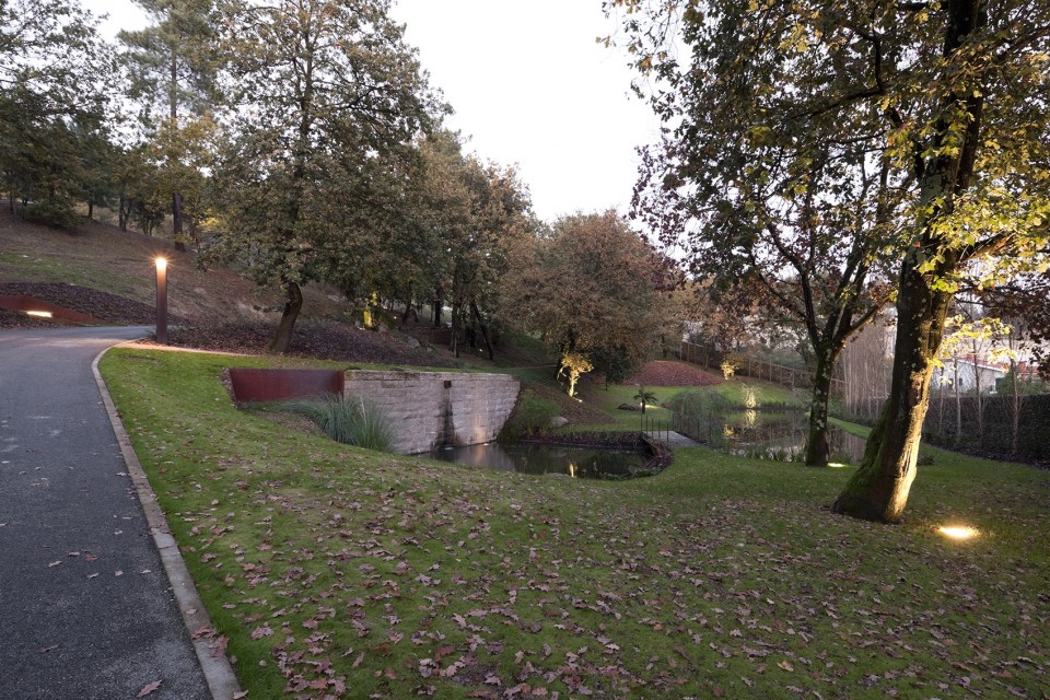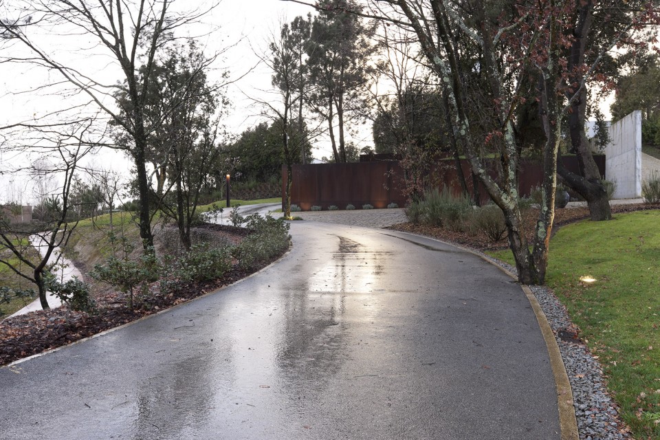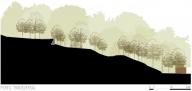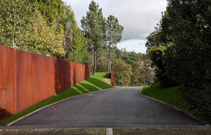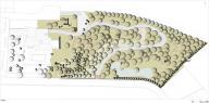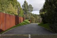 一條4米寬的公共道路將12000平方米的橡木林與4000平方米的建筑基地劃分,業(yè)主希望通過景觀設(shè)計(jì)方案,將兩片區(qū)域重新連接。方案與道路的相連處取代了在其24米之上的現(xiàn)狀入口,成為了建筑新的主入口。方案的出發(fā)點(diǎn)是服務(wù)于功能和結(jié)構(gòu)的,但景觀設(shè)計(jì)師同時(shí)將它視為一個(gè)穿越叢林的休閑步道,而不只是一條交通性的道路。林間的小溪成為了一個(gè)結(jié)構(gòu)性的景觀要素,活躍了場(chǎng)地的氛圍。