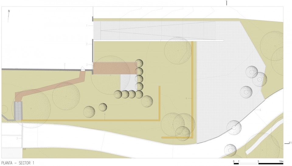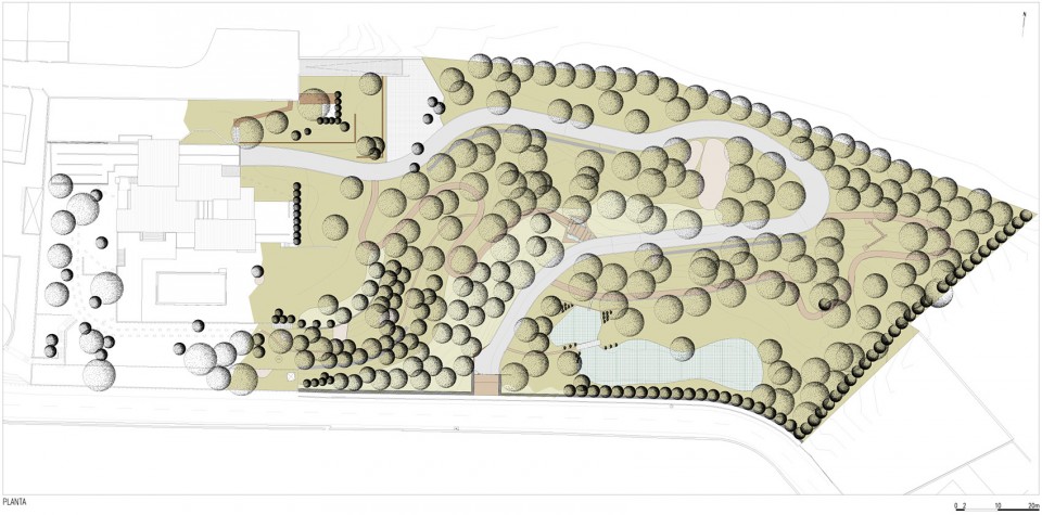 與建筑設(shè)計(jì)一樣,整個(gè)景觀方案是由靈感,結(jié)構(gòu)和形式共同運(yùn)作而成的。墻體,山坡和坡道隨地勢(shì)蜿蜒,道路被劃分為不同的等級(jí),而小溪?jiǎng)t順流而下,流入了新建的湖泊。景觀系統(tǒng)的重構(gòu)基于一個(gè)種植和現(xiàn)狀景觀的集成系統(tǒng)之上。材料、物種、肌理和亮麗的色彩完美的融合在一起,自然和人工的關(guān)系在這里得到了升華,人的感官被無限放大,與自然親密接觸。