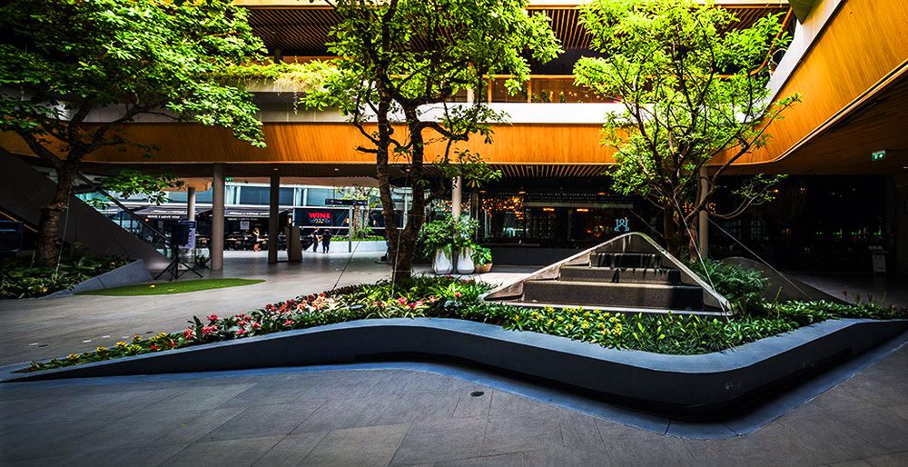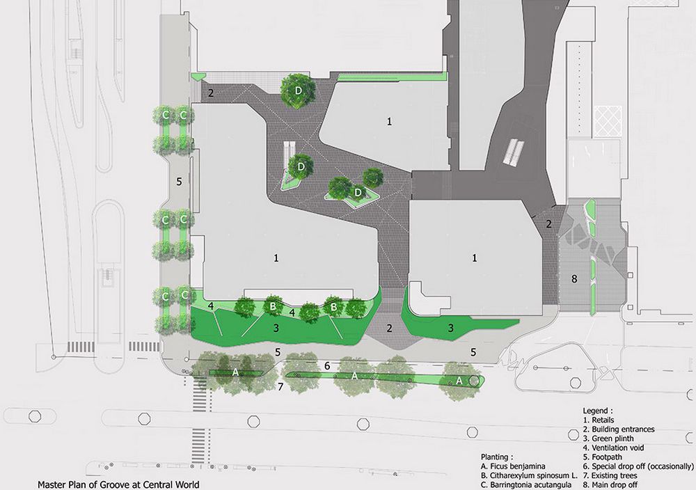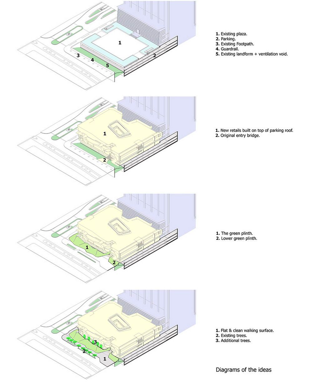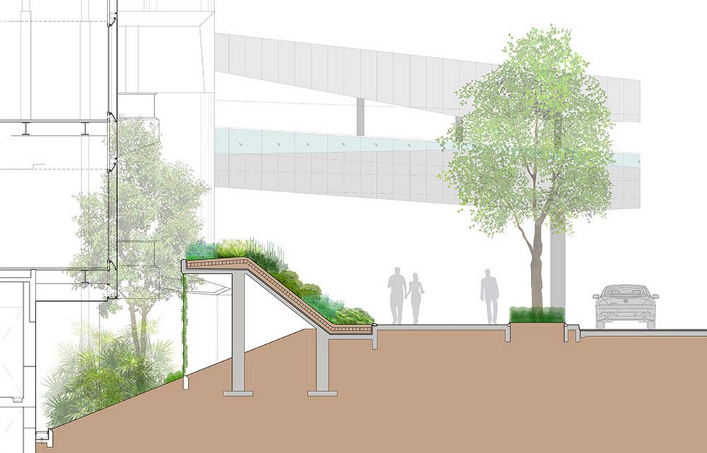 由于這項(xiàng)工程的原因,原本的皇家棕櫚樹(shù)被移植別處。因此到時(shí)候大量陽(yáng)光可以灑到地面,對(duì)于行人來(lái)說(shuō)更加方面安全。公共人行道兩旁將會(huì)重新建綠地以達(dá)到安全且美觀的目的。這一新設(shè)計(jì)為線型景觀斜坡,從地平面至2米高處。從街道看去,通風(fēng)空間如今完全被隱藏在綠地景觀后面,同時(shí)綠地景觀也起到了防止行人不慎墜落的作用。盡管綠地景觀并不與新的購(gòu)物中心連接,但是它能夠成為購(gòu)物中心底部的一部分,并且可以使得行人在看到之后有種賞心悅目之感。精心安排的灌木和鮮花能夠使得這一區(qū)域四季如春。與以前的舊景觀相比,新景觀能夠幫助降低地表氣溫,對(duì)于行人來(lái)講更加舒適。同時(shí),新的地下排水系統(tǒng)也可幫助減少地表污水,而地表污水是造成附近街區(qū)積水的主要原因,另外,多余的水也可收集起來(lái)用于澆灌植物。除了綠地景觀之外,這一區(qū)域的其他部分如今全部用作步行區(qū)。