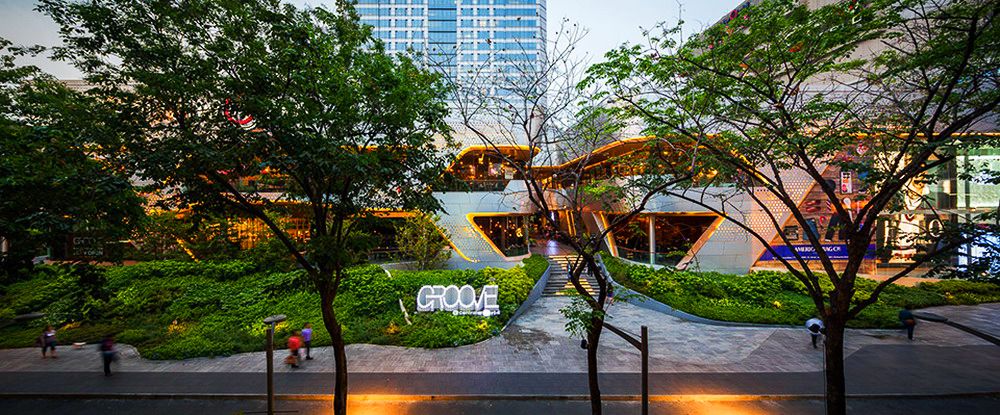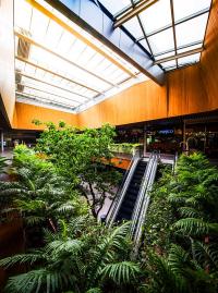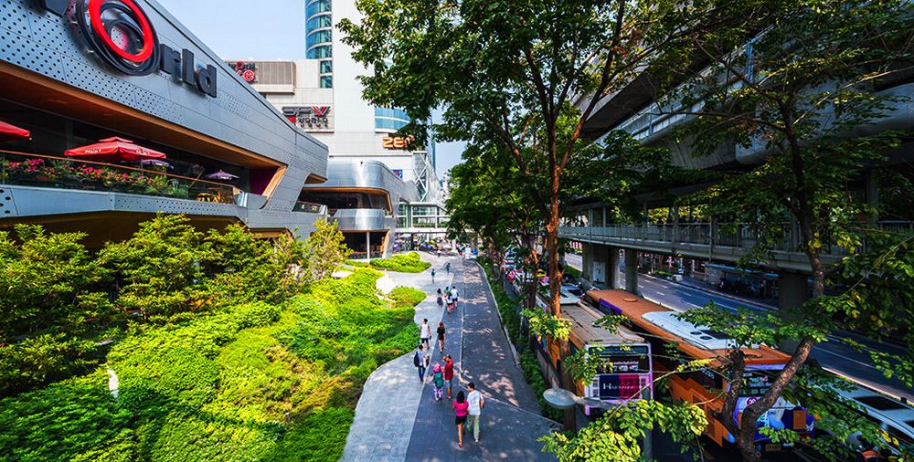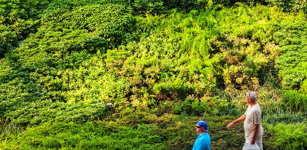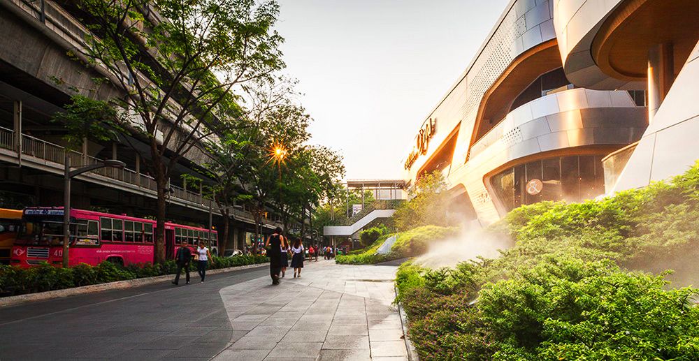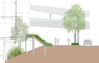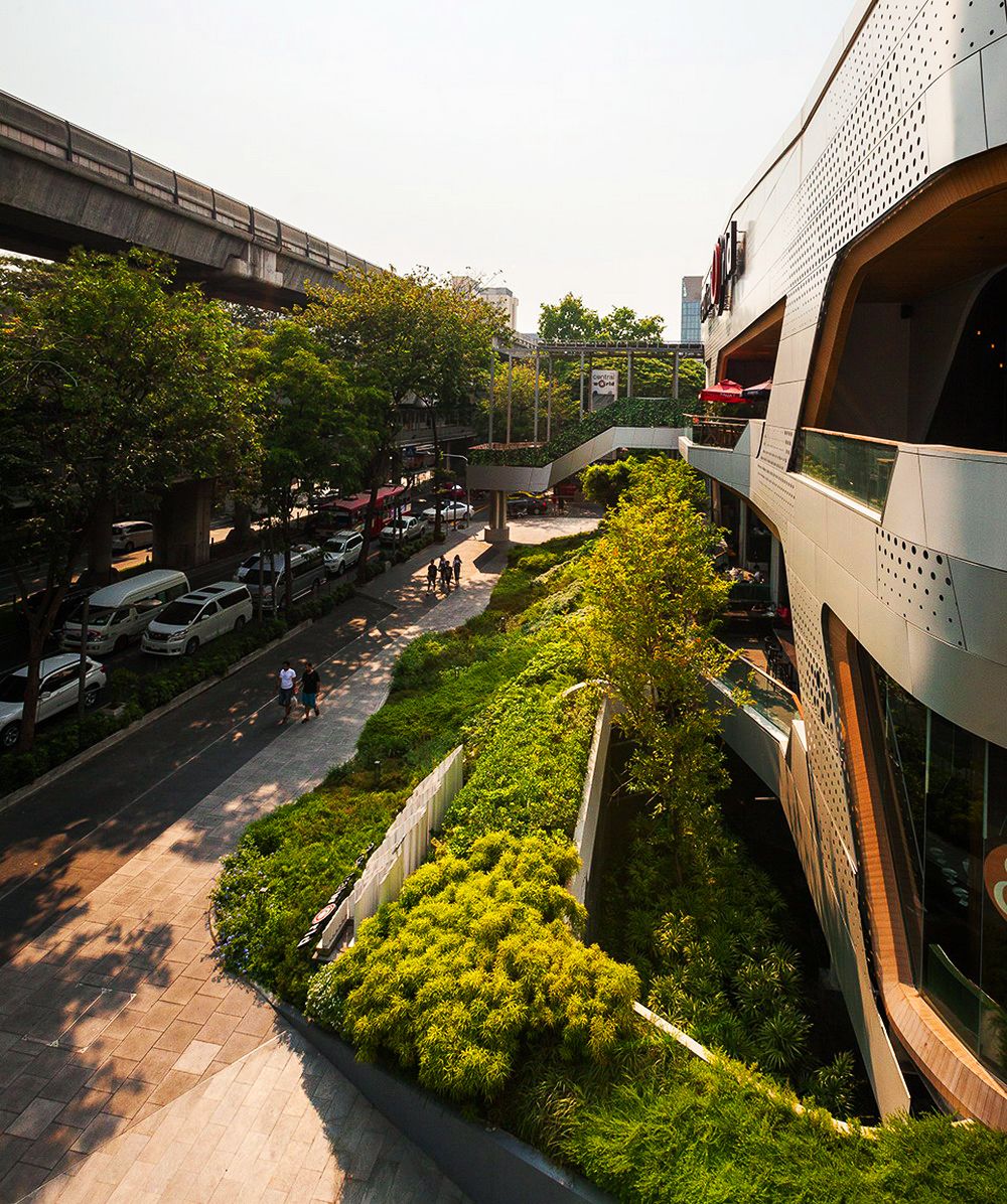 由于這項(xiàng)工程的原因,原本的皇家棕櫚樹(shù)被移植別處。因此到時(shí)候大量陽(yáng)光可以灑到地面,對(duì)于行人來(lái)說(shuō)更加方面安全。公共人行道兩旁將會(huì)重新建綠地以達(dá)到安全且美觀的目的。這一新設(shè)計(jì)為線型景觀斜坡,從地平面至2米高處。從街道看去,通風(fēng)空間如今完全被隱藏在綠地景觀后面,同時(shí)綠地景觀也起到了防止行人不慎墜落的作用。盡管綠地景觀并不與新的購(gòu)物中心連接,但是它能夠成為購(gòu)物中心底部的一部分,并且可以使得行人在看到之后有種賞心悅目之感。精心安排的灌木和鮮花能夠使得這一區(qū)域四季如春。與以前的舊景觀相比,新景觀能夠幫助降低地表氣溫,對(duì)于行人來(lái)講更加舒適。同時(shí),新的地下排水系統(tǒng)也可幫助減少地表污水,而地表污水是造成附近街區(qū)積水的主要原因,另外,多余的水也可收集起來(lái)用于澆灌植物。除了綠地景觀之外,這一區(qū)域的其他部分如今全部用作步行區(qū)。