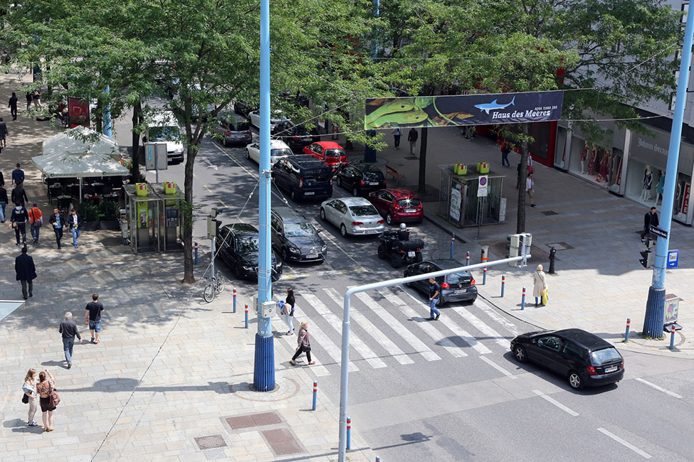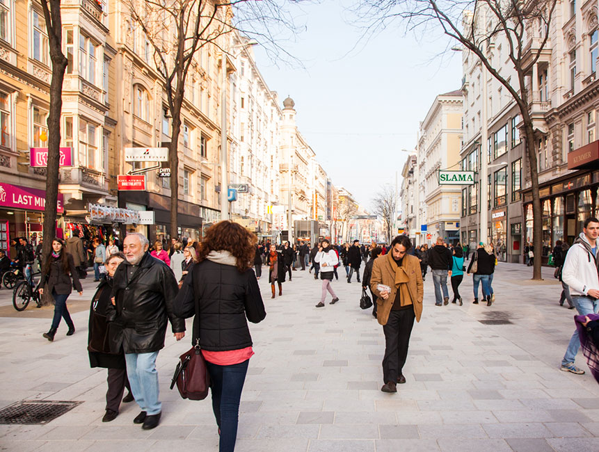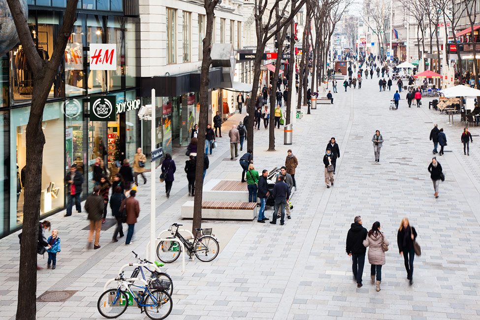 在上世紀(jì)中期,在沒有考慮行人的感受下,維也納將優(yōu)美的林蔭大道轉(zhuǎn)變成一條公路?,F(xiàn)在的目標(biāo)是把受到污染和嘈雜的Mariahilfer Stra?e購物街轉(zhuǎn)變成一個(gè)限制交通的區(qū)域。其主要目標(biāo)是為居民、游客、當(dāng)?shù)厣虡I(yè)和商店提供更加高質(zhì)量的生活。這個(gè)1.6千米的街道被劃分成2部分。中心區(qū)域?qū)⒈恢匦陆ㄔ斐烧嬲娜诵械绤^(qū)域,而其他的2個(gè)區(qū)域?qū)⒆裱蚕砜臻g的原則進(jìn)行設(shè)計(jì)。共享空間是一個(gè)城市設(shè)計(jì)方法,會(huì)尋求機(jī)動(dòng)車交通和人行道之間分界的最小化。