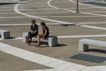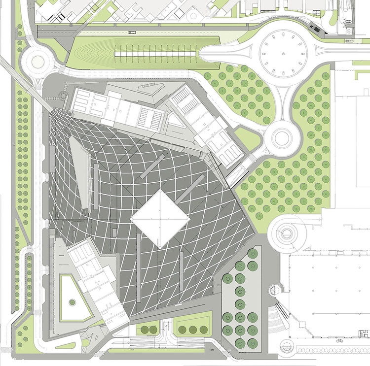 廣場有一個寬大的基礎,表面的梯度上升5%時沿對角線朝向45度角方向以表示對展區(qū)的尊敬,那是它開始的地方。這條對角線繼續(xù)沿著人行道過去就到了公園,這也是波特魯整個規(guī)劃的主軸線?;窘Y構為地下2層和地面1層。建有停車場、服務區(qū)、建筑入口,商業(yè)空間和一個餐廳。因此這不是一個單純的步行場所,有著眾多的不同功能的配套設施,這些設施散布在廣場的各處:一個靈活的矩性上面擁有所有的服務。