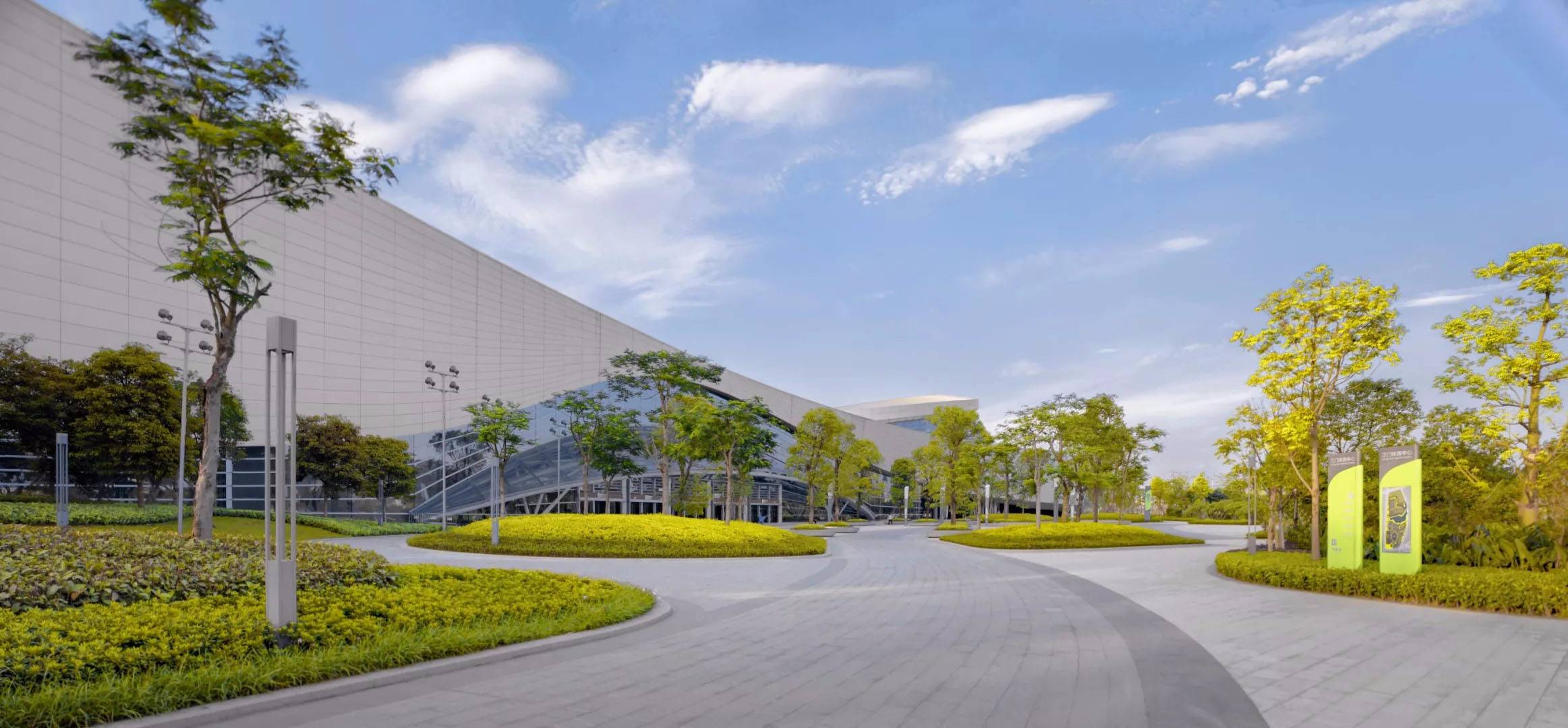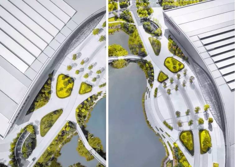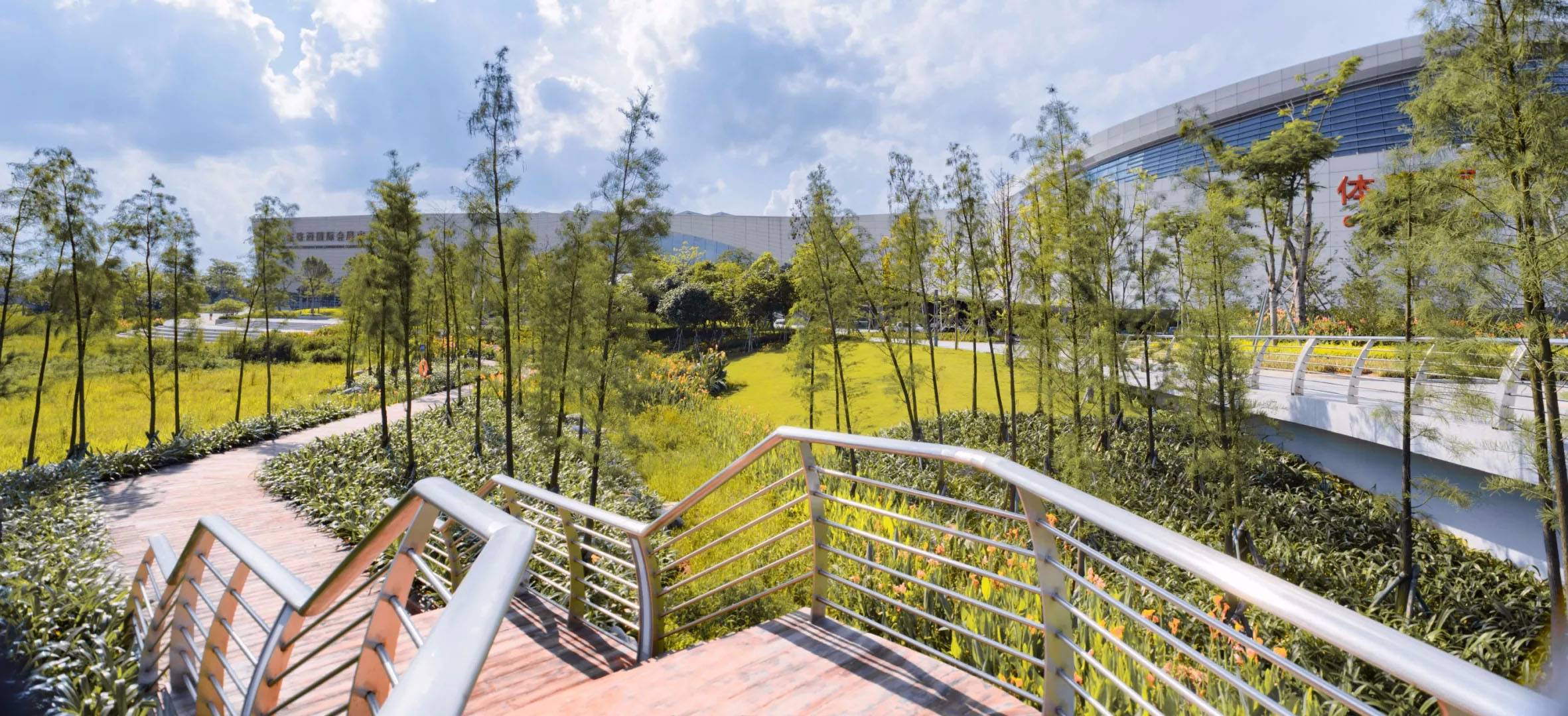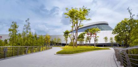 會(huì)展中心場館的周邊集商業(yè)、休閑功能于一體,設(shè)置會(huì)展廣場、陽光草坡休閑棧道等開放空間,提供完善舒適的休閑體驗(yàn)系統(tǒng)。