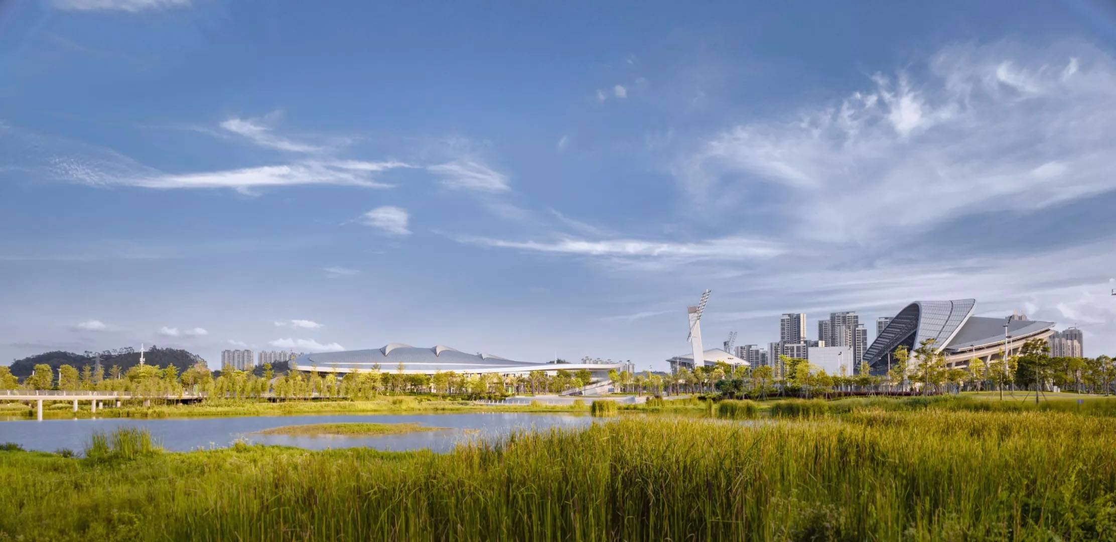 “一心兩館”的特色布局,將體育場、會(huì)展中心、中心湖公園三部分進(jìn)行一體化的設(shè)計(jì),在提高土地使用效率的同時(shí),將景觀與建筑和諧的融為一個(gè)整體。