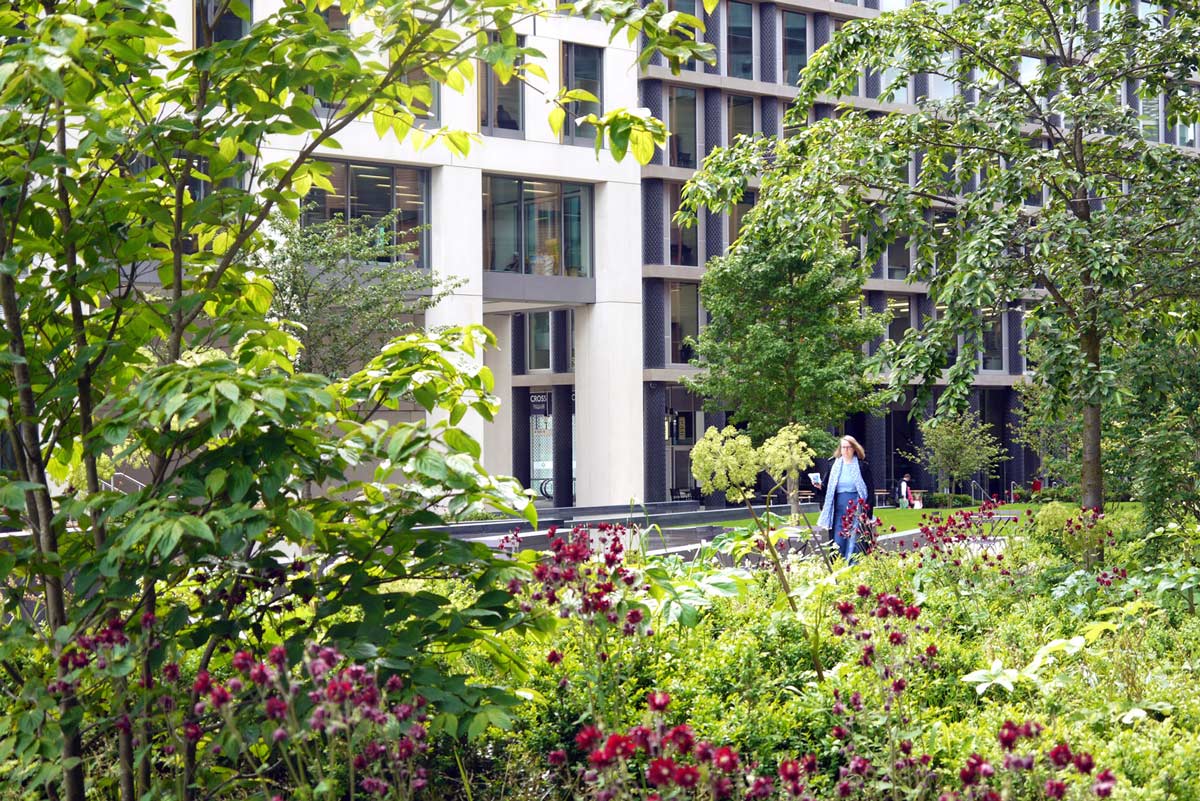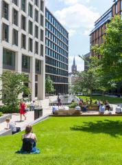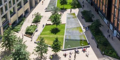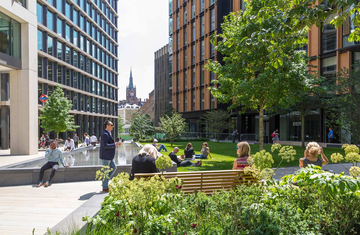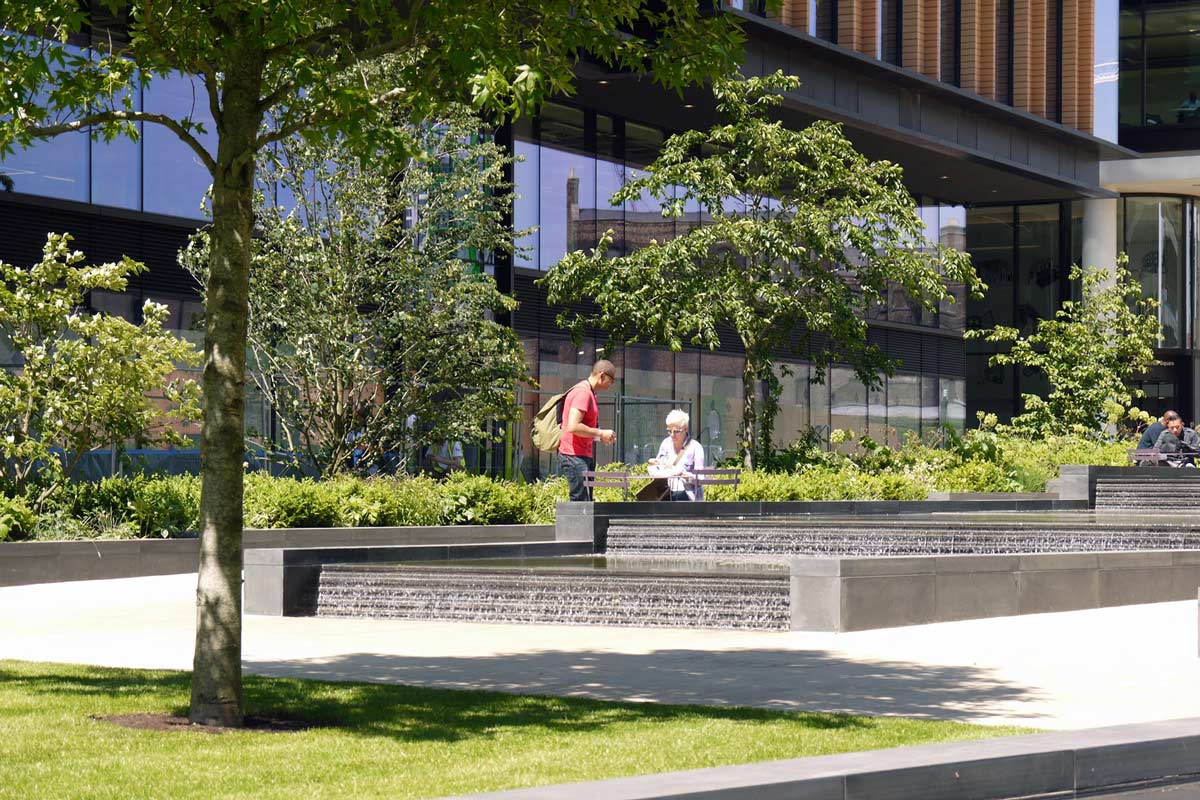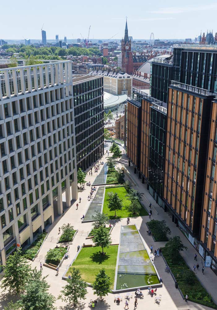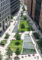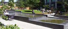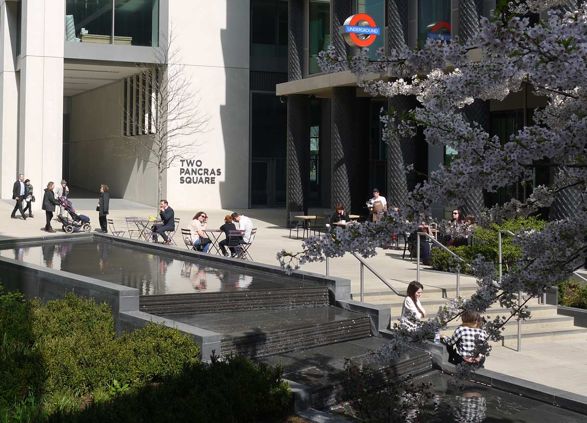 Pancras廣場(chǎng)是一個(gè)全新的城市廣場(chǎng),周邊是七個(gè)嶄新的辦公大樓。這個(gè)面積大約為4000平方米的戶外活動(dòng)空間有著傳統(tǒng)的當(dāng)?shù)鼐坝^風(fēng)格,但又能與周邊的城市環(huán)境銜接在一起,讓人們?cè)诜泵Φ亩际猩钪心軌蛳硎艿缴畹臉啡?。?chǎng)地上修建了草坪和綠色植被區(qū),還有一個(gè)階梯式的水景,美麗的環(huán)境和獨(dú)特的設(shè)計(jì)受到了人們的青睞。