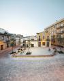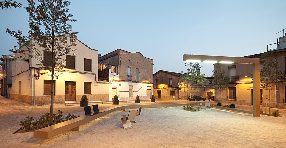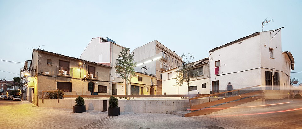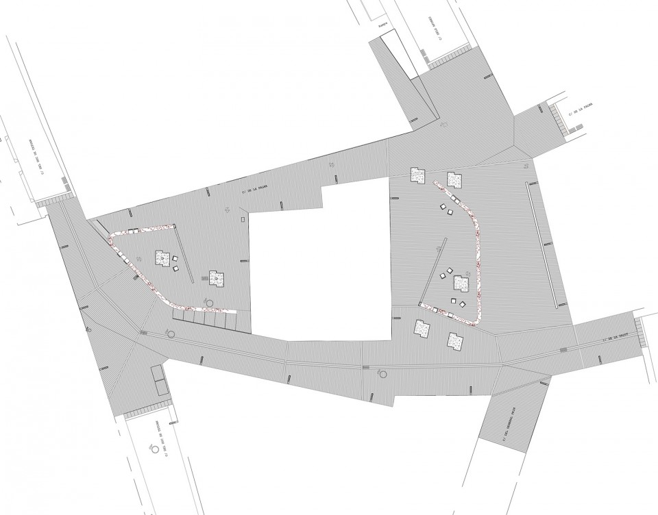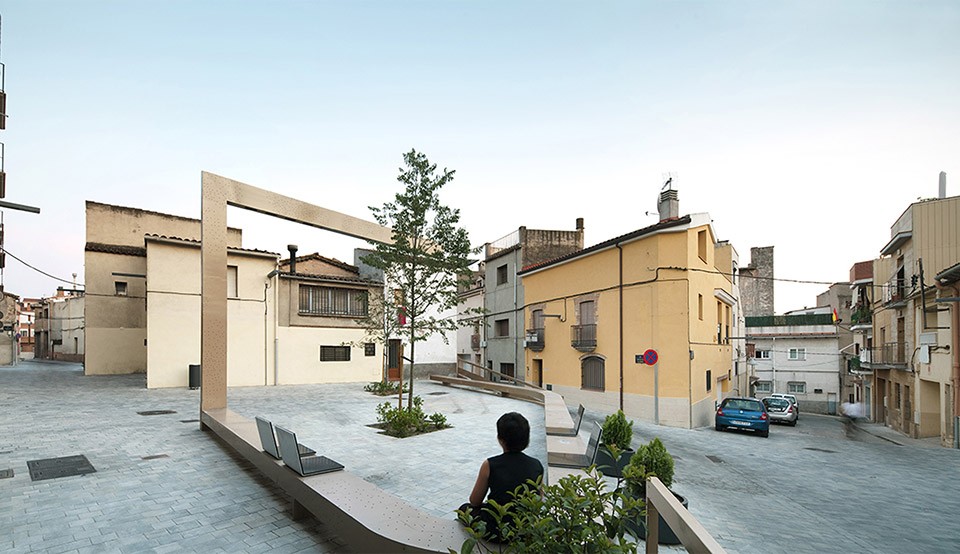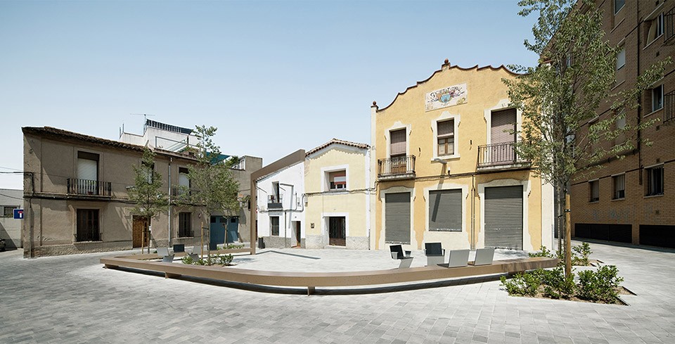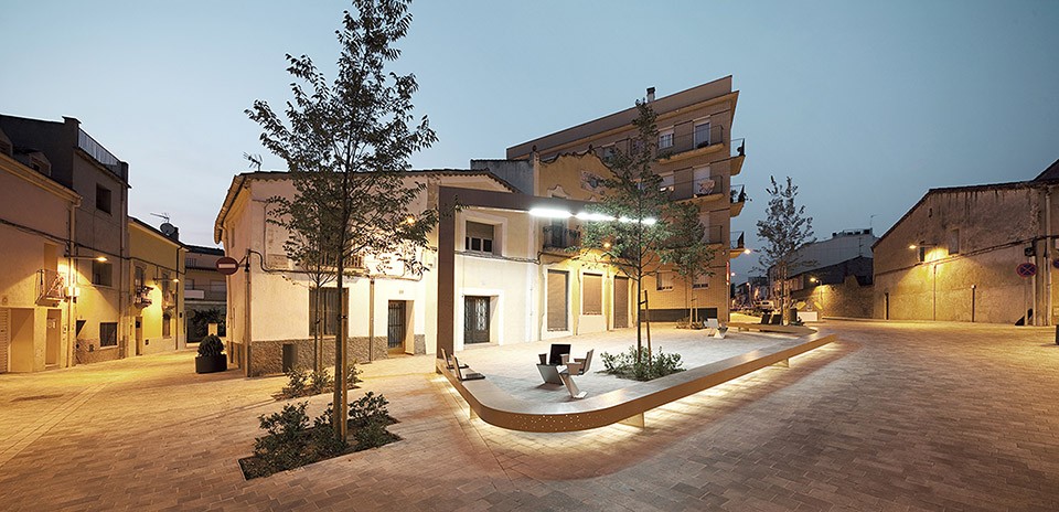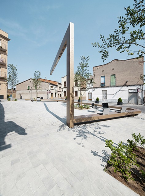 由于廣場的空間非常狹小,地面鋪裝沿用了原有街道的鋪裝而沒有做過多的切割。而在此之上,景觀設計師僅僅使用了一個簡單的元素, 就將各個不同功能的空間劃分開來。