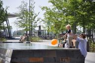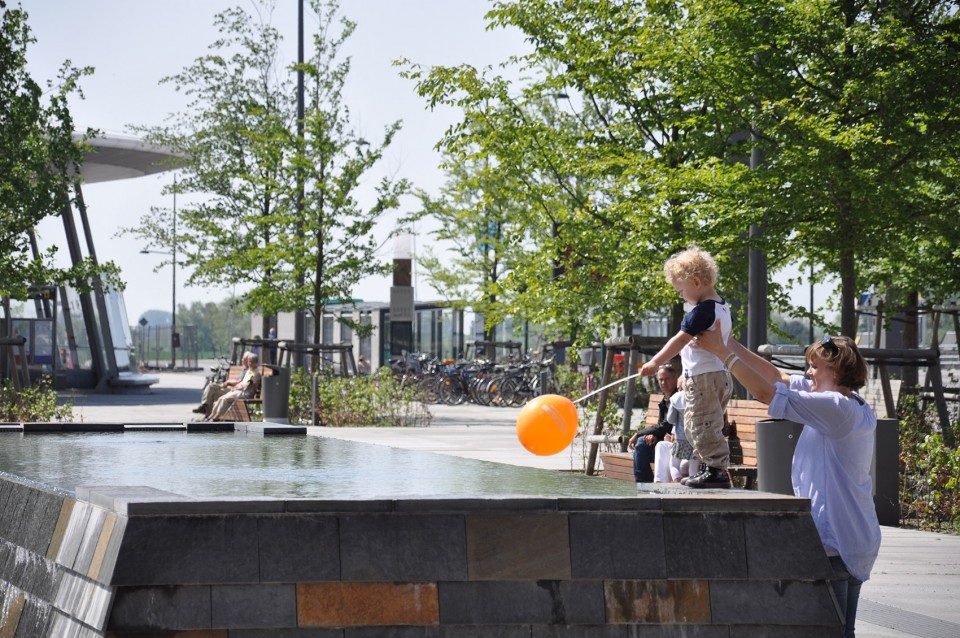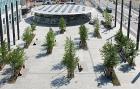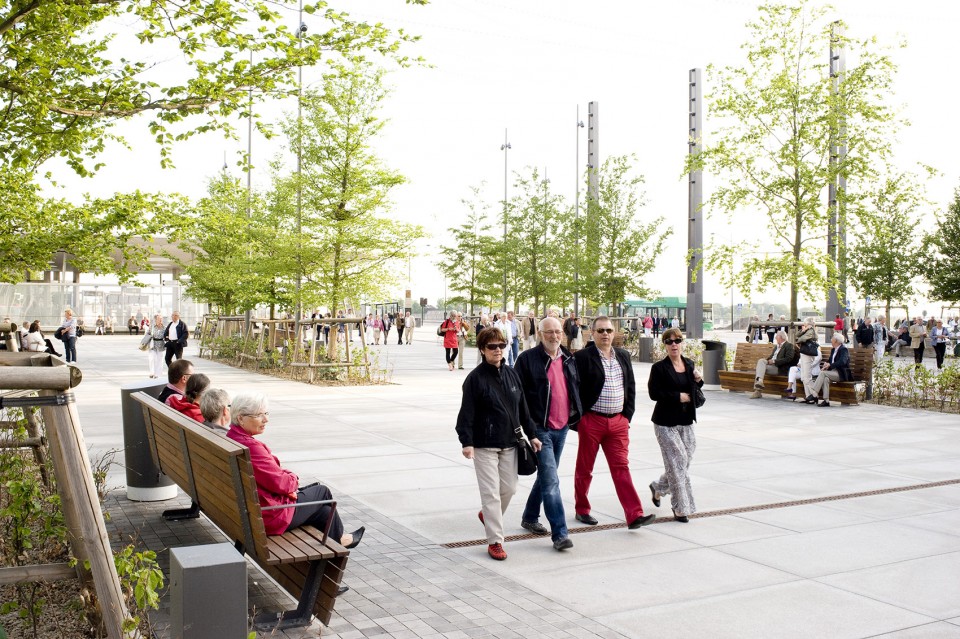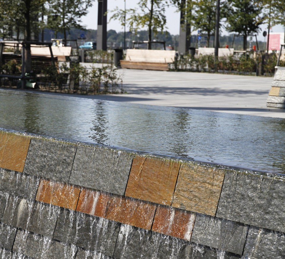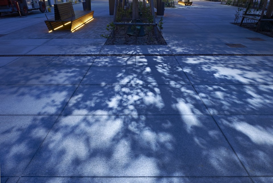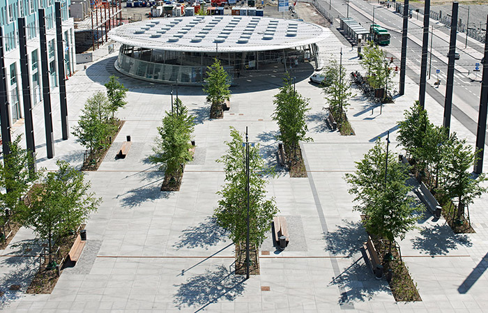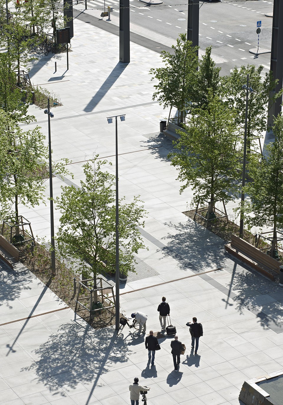 Hyllie廣場位于馬爾默城南的新區(qū),是來自丹麥的火車駛離連接瑞典和丹麥的橋梁后??康牡谝粋€站點。在這個生長于花崗巖地面上的城市森林中,各式各樣的公共交往活動相繼展開?!吧帧崩锏臉淠玖兄灿趶V場之上,林間能被太陽照曬到的空地上則散布著大量休息座椅。雖然這28棵已有30年樹齡的山毛櫸進口自德國北部,但這瑞典南部的本土樹種也為廣場帶來了濃重的地域色彩。景觀設(shè)計師采用了最前沿的土壤技術(shù),保證這些移植的樹木得以成活。2×1米的巨大花崗巖石板經(jīng)過精挑細(xì)選,質(zhì)量上乘。在廣場的最北端,是四個供嬉戲玩水的大型跌水池。