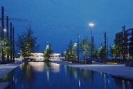 12根16米高的桅桿兩兩成對排列于廣場東西兩側(cè),界定了廣場的邊界,也拉起了如同蜘蛛網(wǎng)般錯綜復(fù)雜,長達(dá)1800米的鋼絲網(wǎng)。鋼絲網(wǎng)上懸掛著的2800枚LED二極管,根據(jù)季節(jié)變化亮起不同的色彩,為夜晚的廣場打造不一樣的“天空”。20年前,北歐城市的大部分公共空間都作為停車場而存在,如今,這些公共空間的使用優(yōu)先權(quán)已經(jīng)完全交還給城市生活和行人。這種變化大大地提高了城市的生活品質(zhì)。城市中心區(qū)更多的作為公共交往空間而不是純粹的金融商區(qū)。在Hyllie新區(qū)的建設(shè)過程中,廣場首先落成,然后才是住宅,商業(yè)區(qū)和其它的設(shè)施。這種變革性的建造順序也反映了城市空間優(yōu)先權(quán)的更迭。