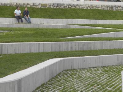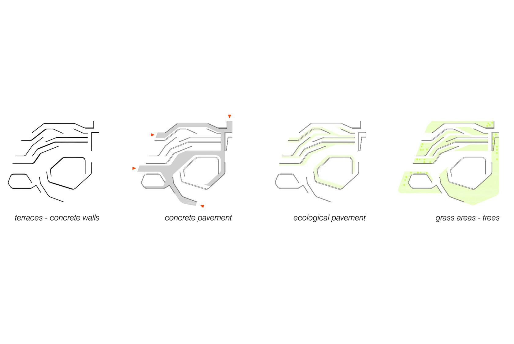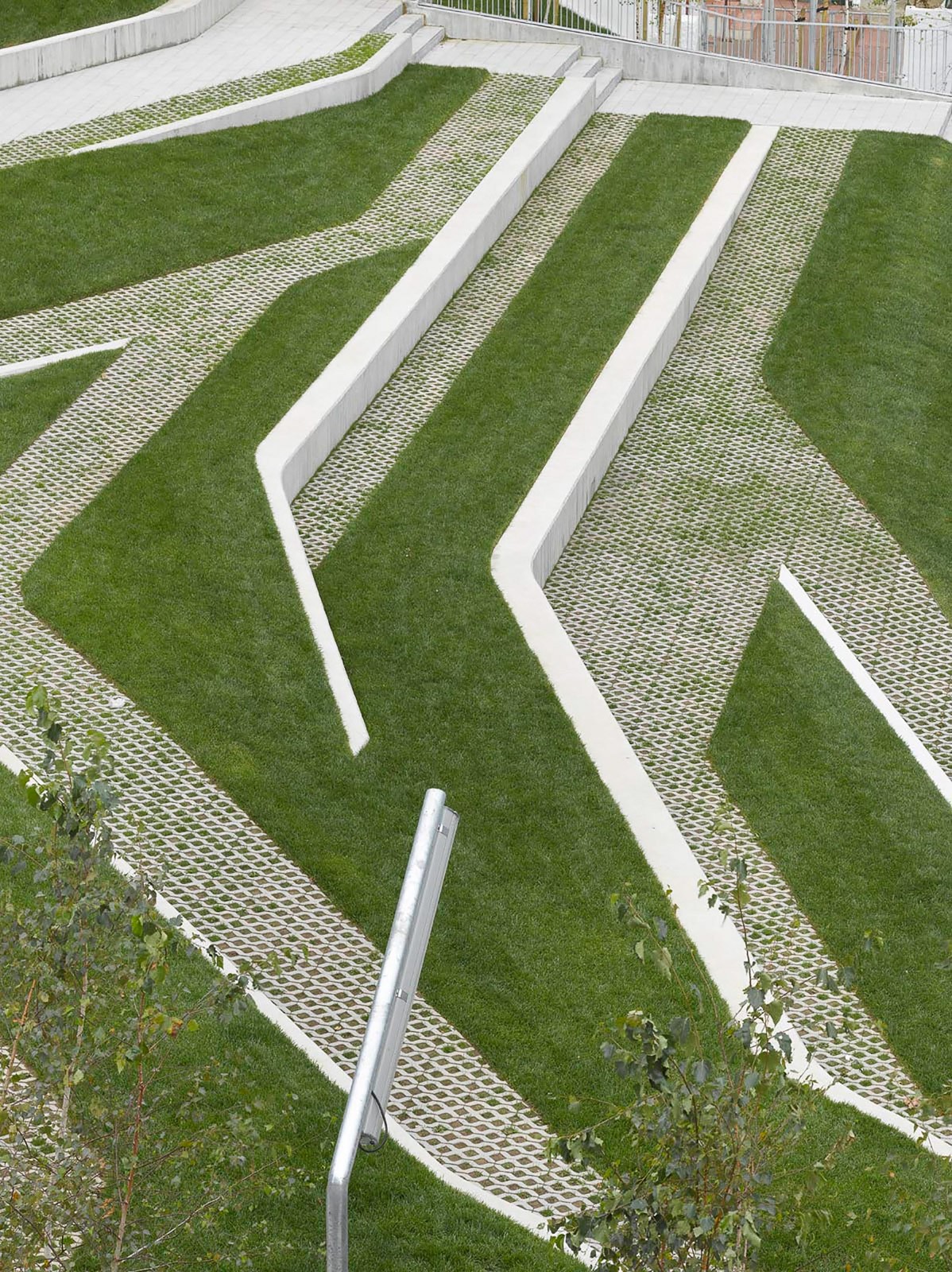 混凝土鋪裝的空間也位于看臺上,使路線更加簡單,并與新入口連接起來。這些鋪裝的看臺由天然—人工關(guān)系的方式定義,從硬質(zhì)混凝土鋪裝到草地區(qū)域,通過生態(tài)鋪裝石創(chuàng)造出混合交錯的情景。
