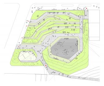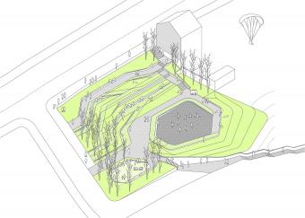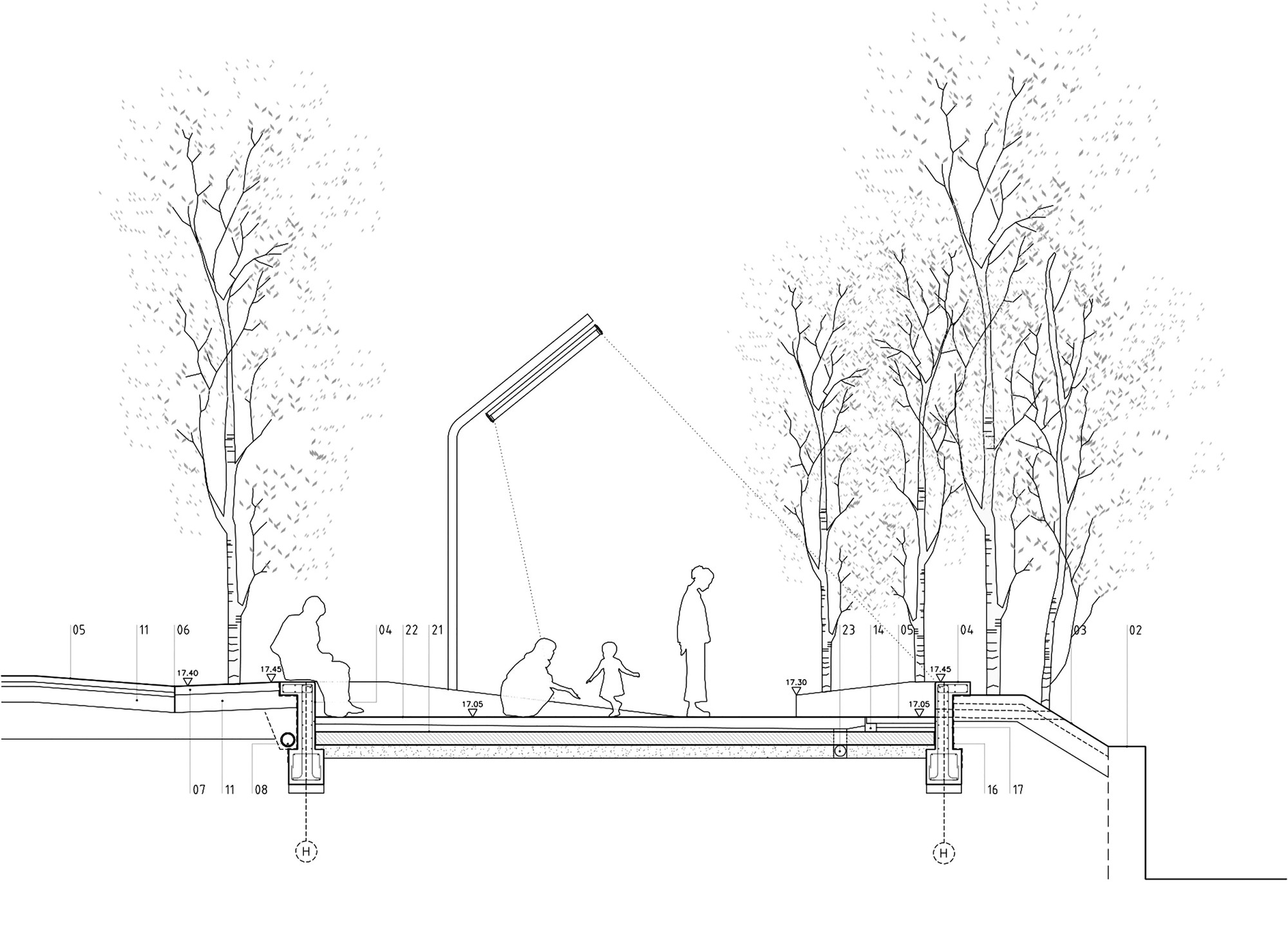 在該項目的較低部分有2個平行區(qū)域,用于游樂和表演。第一個較大些,六角形狀,作為游戲板或是城市活動的小型舞臺。其特殊的材料——合成的木質(zhì)鋪裝——在于提升這個空間類型的外形結(jié)構(gòu),傳達(dá)出暖意。第二,一個受保護(hù)的區(qū)域,種滿樹木和植被,設(shè)置橡膠地面和秋千,供孩子們玩耍。