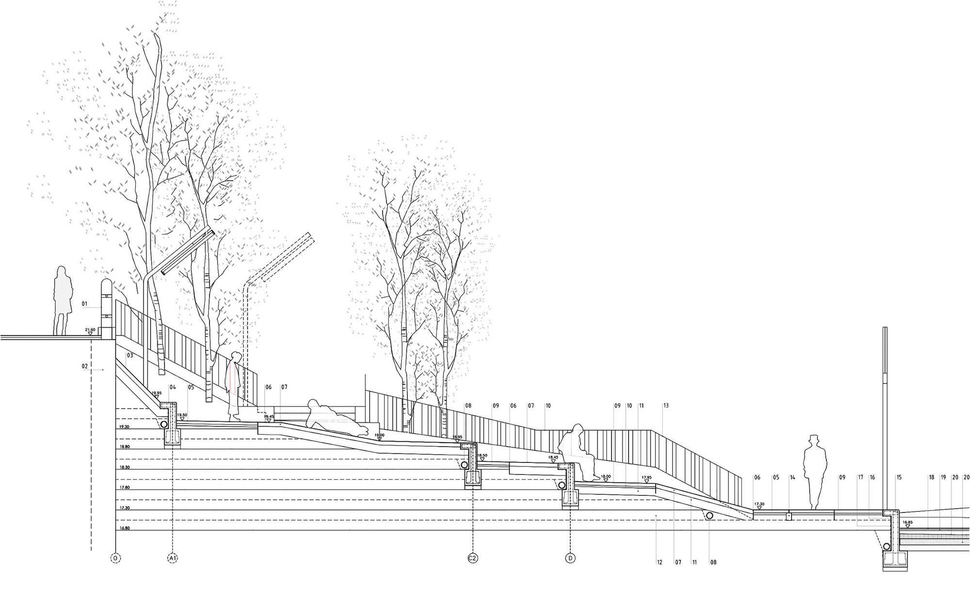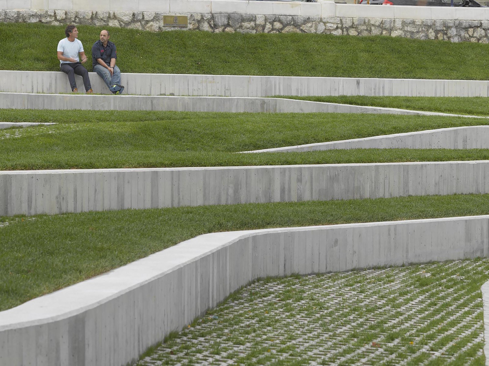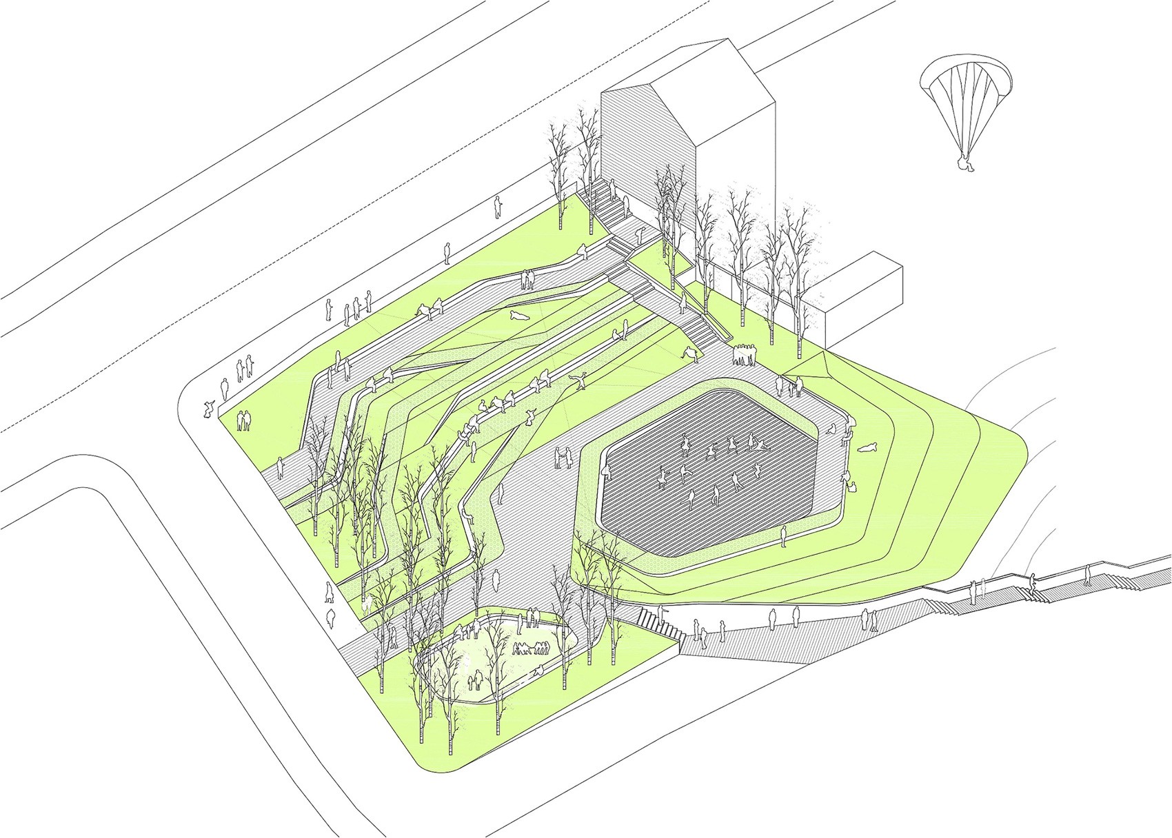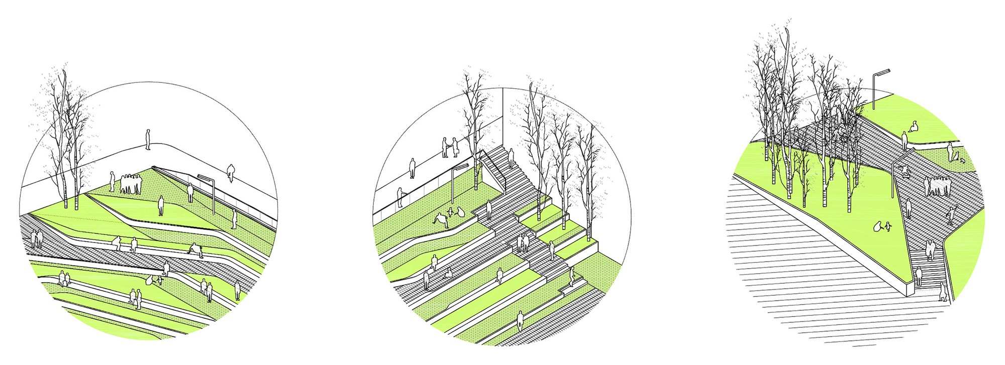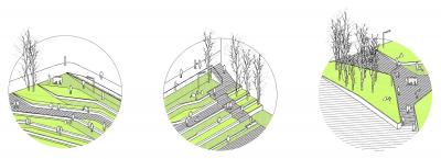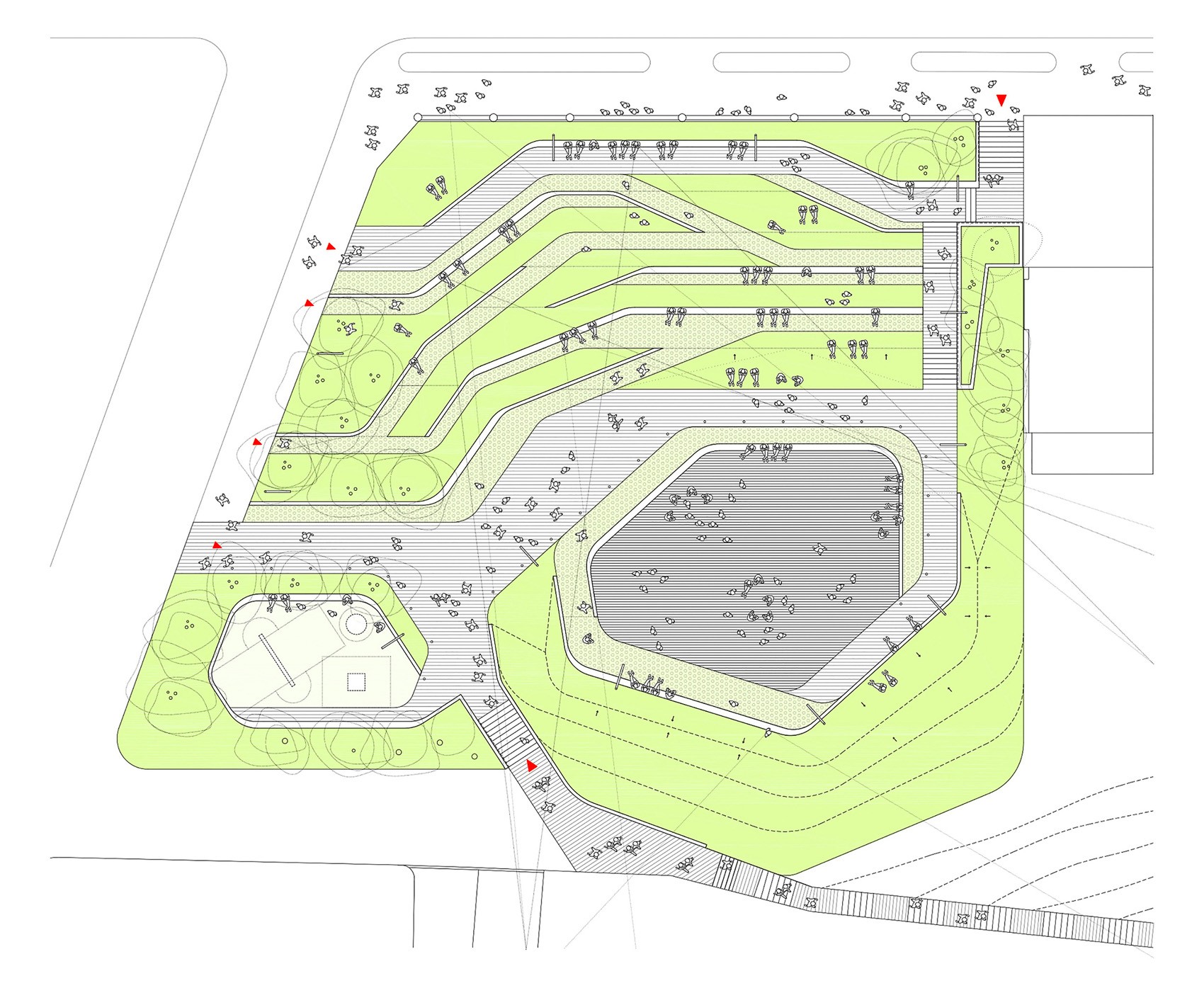 這些看臺有各種不同的維度,構(gòu)成多個層級,同時擴(kuò)寬平臺,建造出更加寬闊的空間,用于聚會和娛樂。這些臺地基本上是由自然元素建造:帶有綠色區(qū)域、生態(tài)鋪裝的空間,產(chǎn)生人工和天然元素交錯的情景,讓植物自然生長以及自然排放雨水。