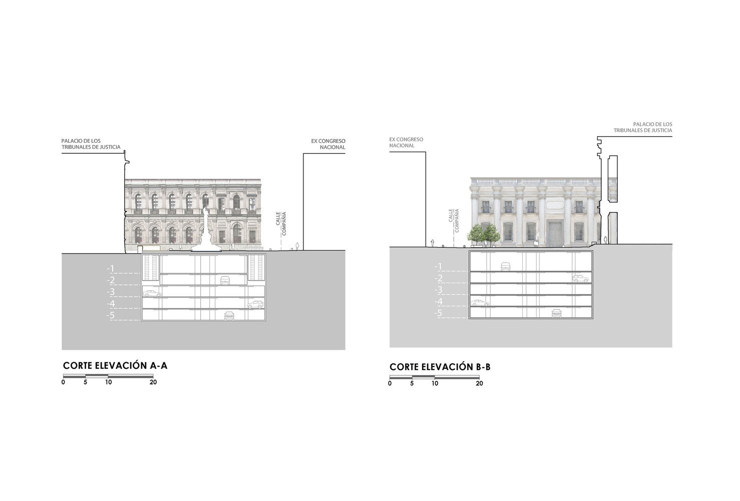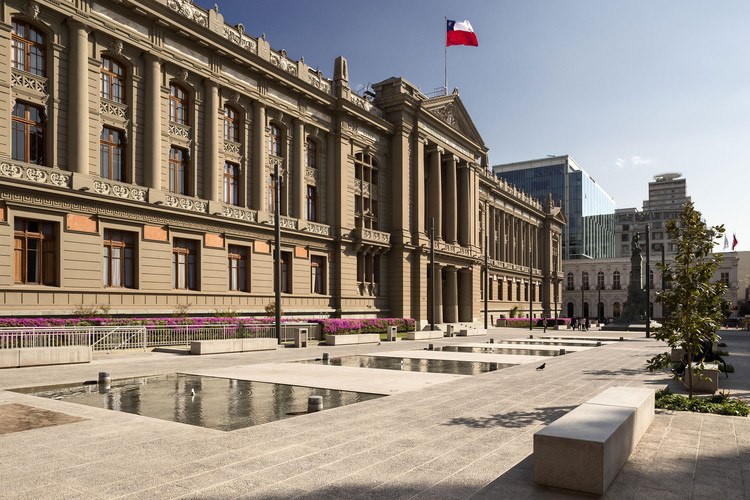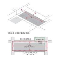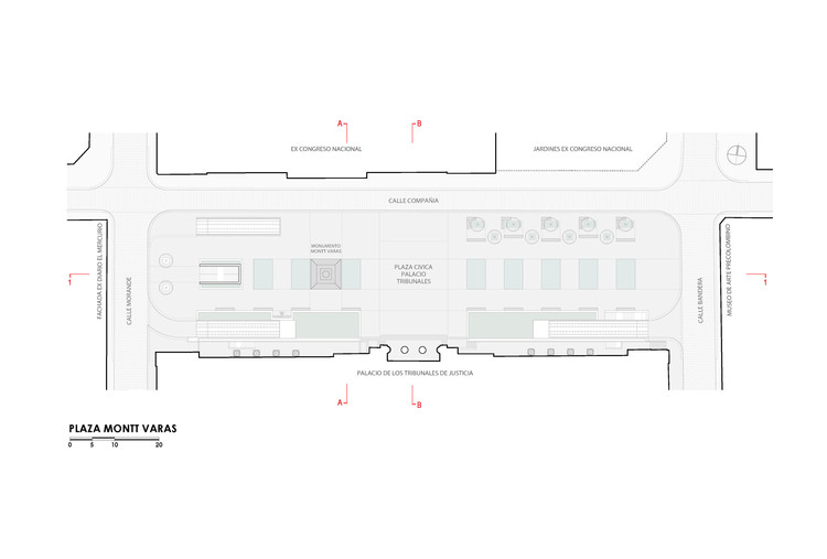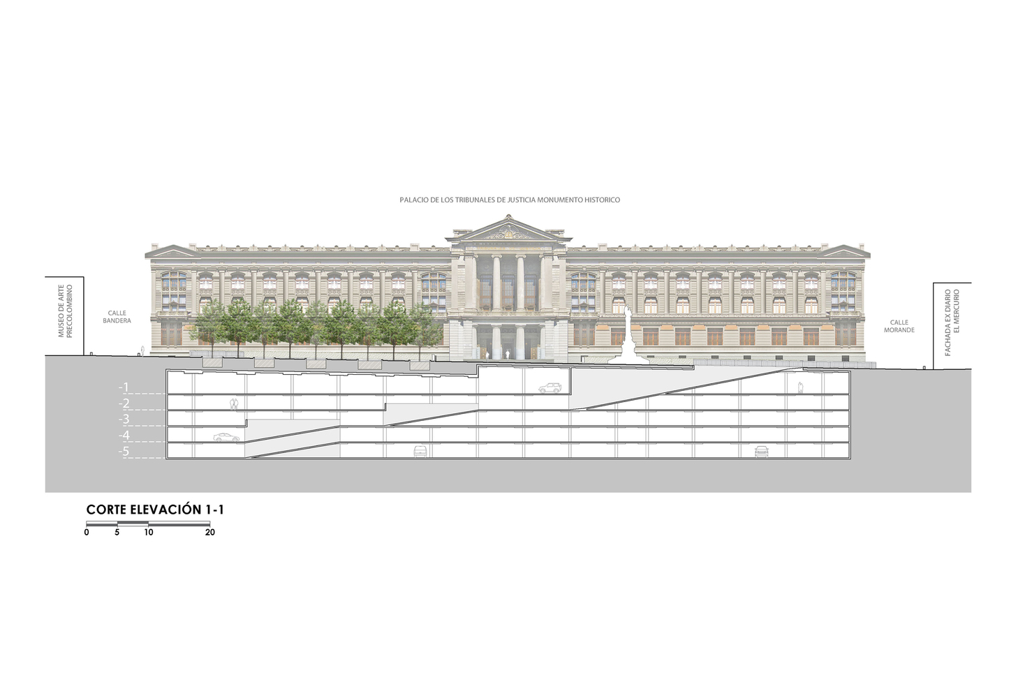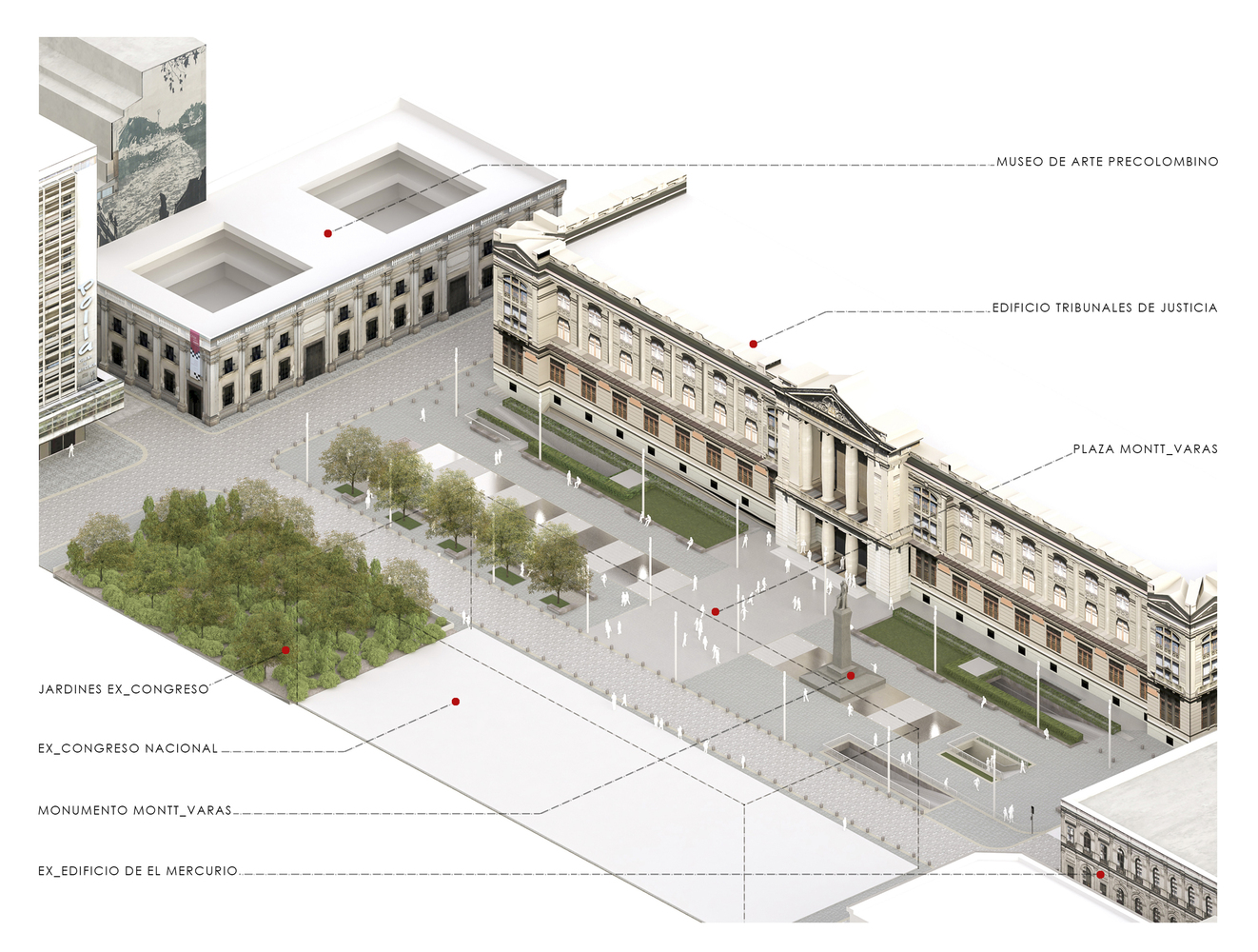 廣場所在的位置原本是當?shù)厮痉C構(gòu)停放車輛的地方。這樣一來,場地的公共使用率被大大降低,原有景觀也受到了破壞。曾經(jīng)的布局不僅影響法院大樓周圍環(huán)境的美觀,也不利于其他歷史建筑的保護,例如附近曾經(jīng)的國會大廈。項目徹底改變了這樣的現(xiàn)狀。新設(shè)計的五層地下停車場不僅大幅度地增加了停車場的停車容量,便于司法機構(gòu)工作人員和市民的使用,而且讓所有有機動車輛不再出現(xiàn)在路面上。該項目執(zhí)行的第一步就是對于停車場上方的廣場進行改造,創(chuàng)造出一個親民的市民廣場。廣場周圍是歷史建筑文物。這種設(shè)計不但能保留原有歷史標志性建筑如Montt Varas紀念碑,而且為這一整片區(qū)域大量的歷史建筑營造出新的空間感受。