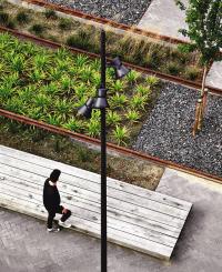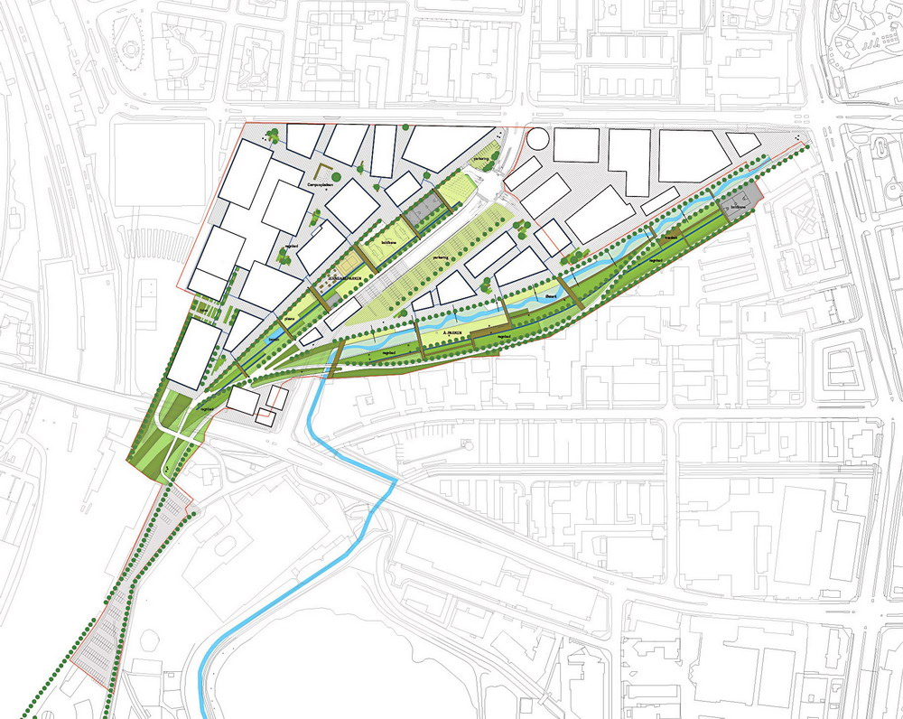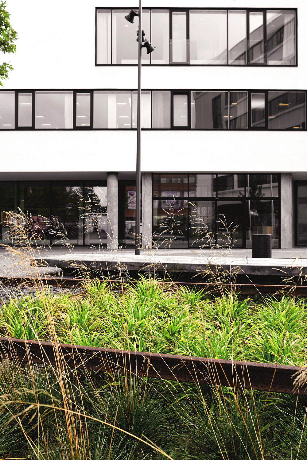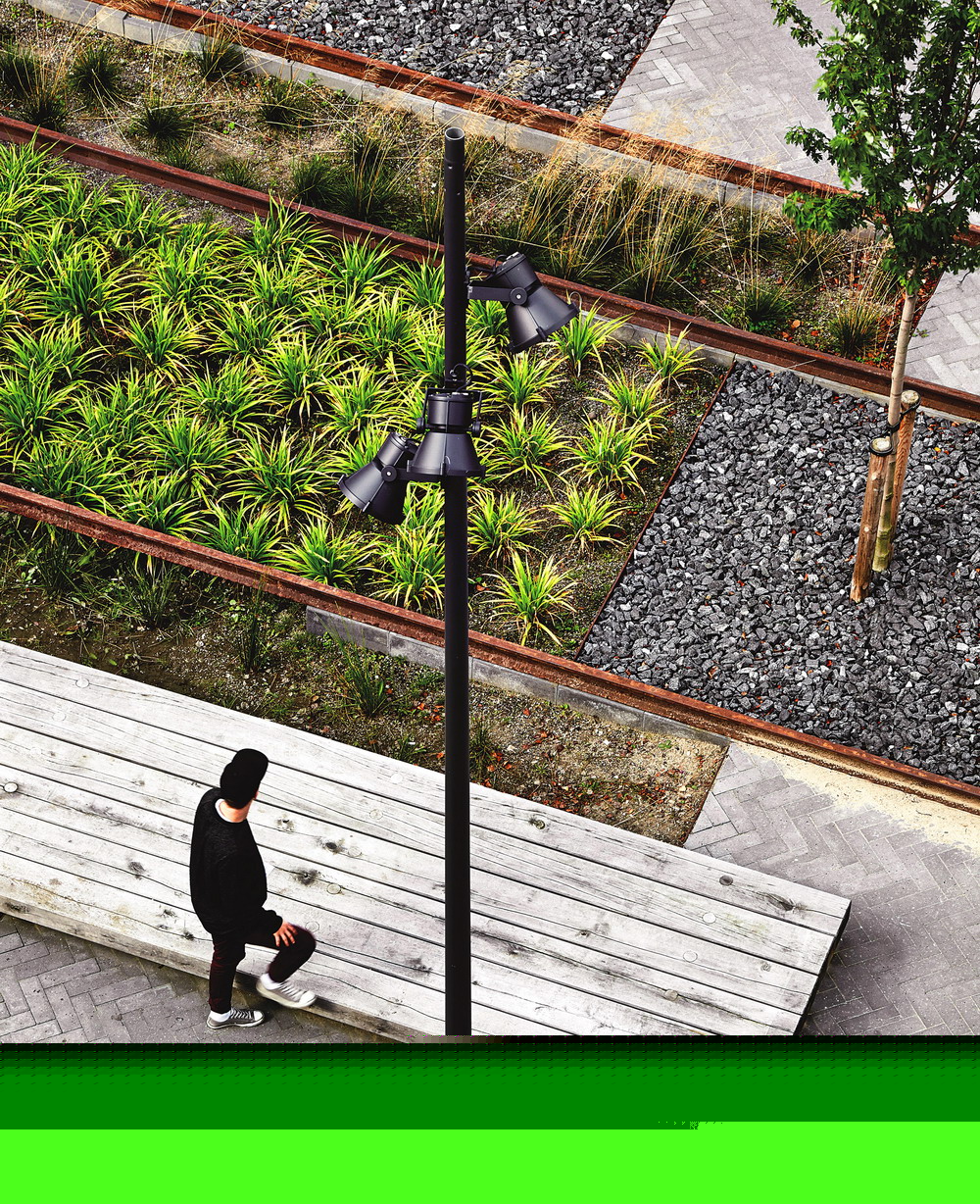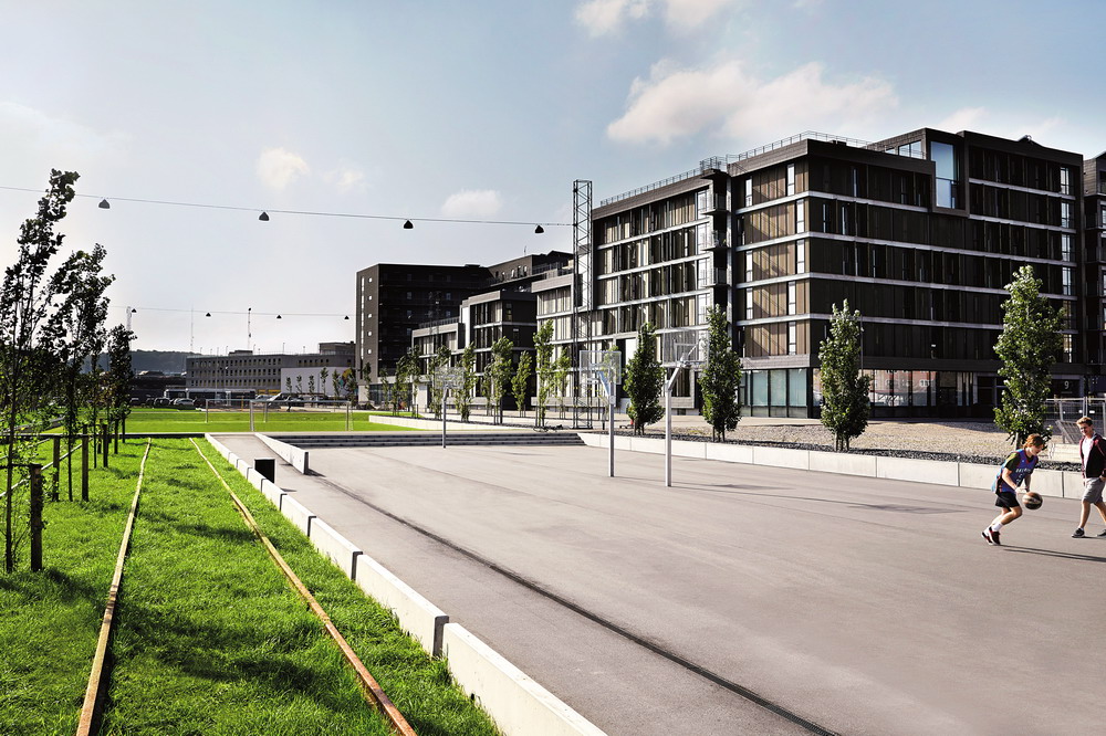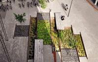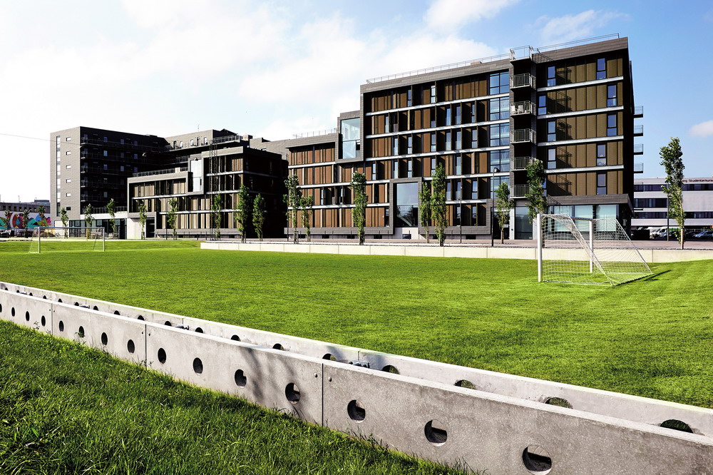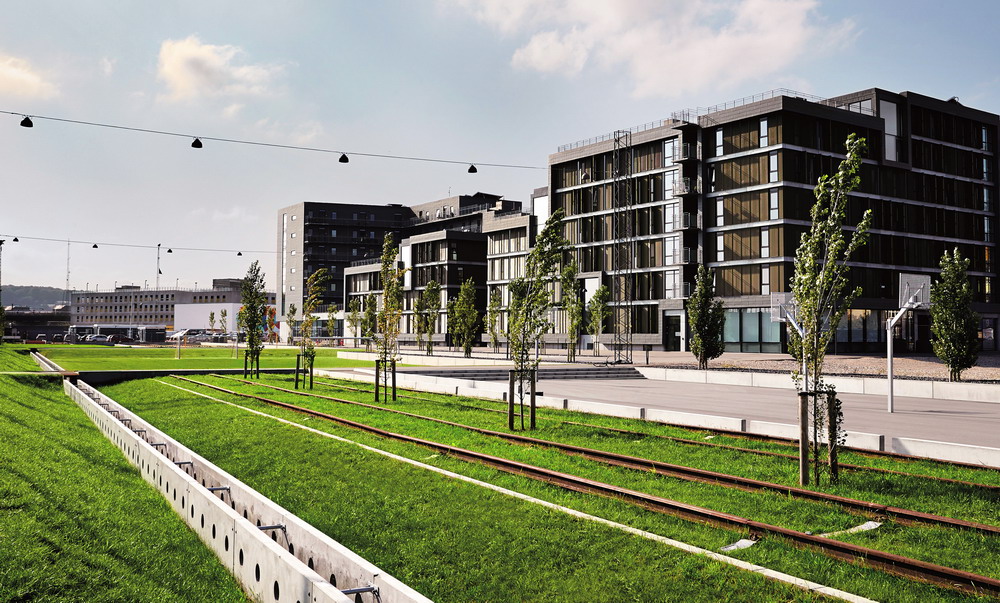 軌道廣場位于丹麥奧爾堡市,是丹麥首批提升城市氣候適應(yīng)性區(qū)域的項目之一,而地表水管理系統(tǒng)即可持續(xù)城市排水系統(tǒng)是城市環(huán)境建設(shè)中的綜合集成部分,起著非常重要的作用。由于氣候變化,2011年丹麥遭受了嚴重的暴雨洪澇災(zāi)害,損失嚴重。為了應(yīng)對洪澇自然災(zāi)害,丹麥開始采用可持續(xù)城市排水系統(tǒng),這也是此項目的創(chuàng)新部分。如今項目已經(jīng)成為一處碳平衡的城市區(qū)域,暴雨匯入低洼處和溝渠,減緩進入公共排水系統(tǒng),能夠幫助避免城市洪水泛濫。雨水管理系統(tǒng)融入到了城市總體規(guī)劃中的各個部分和環(huán)節(jié)。此區(qū)域的建筑設(shè)有綠色屋頂,幫助截留雨水;而體育設(shè)施和綠草坪設(shè)置在特定的水平高度,形成低洼處,用于蓄水。景觀建設(shè)于2014年完工,并為項目未來的城市發(fā)展設(shè)定了框架,具有很強的前瞻性。這里將會是一個年輕化的城市地帶,包括許多城市教育設(shè)施、公寓住宅、商業(yè)區(qū)及家庭住宅區(qū),提供了寬闊的活動空間。