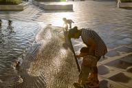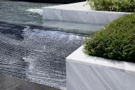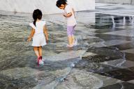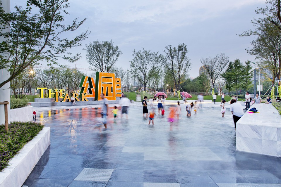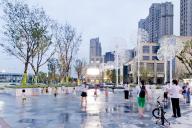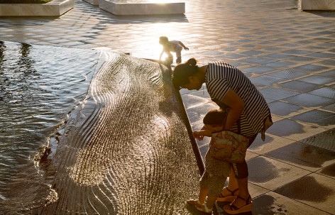 西廣場設(shè)置了一處面積約300m2的地面波浪戲水池,意圖在城市廣場上創(chuàng)造一個模擬自然海灘的景觀元素?!昂@恕睆碾[藏在爵士白樹池側(cè)壁上的出水口噴涌而出,逐漸減弱,然后慢慢退回來。在營造互動性場所的同時,改善小氣候,帶來一絲涼意。