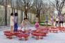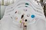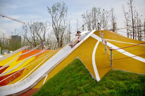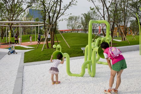 考慮到小公園是一個臨時場所,未來會被改造成商業(yè)用地,小公園內(nèi)主要由成本可控的波浪草坡和擁有許多可拆卸再利用的活動器械的兒童活動區(qū)構(gòu)成。白色礫石園路串聯(lián)了整個公園,與綠色的草坡相映成趣?;?、“樹葉”攀爬網(wǎng)、秋千、“花瓣”跳跳板、鉆洞和“大蓮蓬”、“青蟲說”等以自然元素為設(shè)計靈感的互動裝置或掩映在草坡之中,或安置在暖色的樹葉形塑膠地墊上。這些器械色彩明亮,提倡互動,引發(fā)人的聯(lián)想和探索欲,給孩子們營造了一個童話般的小世界。