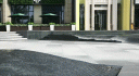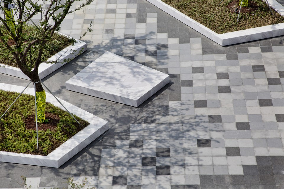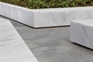 東西廣場均以緩坡與市政人行道相連,鋪裝也統(tǒng)一設(shè)計成600X600的正方形黑白灰三色跳色石材,這樣的處理方式模糊了場地和市政空間的界限,賦予了場地一個友好的對外界面。廣場由幾組大型花池組合圍合出中央活動空間,花池采用了光面爵士白花崗巖,在陽光下,亮白色的石材耀眼而優(yōu)雅?;ǔ叵路降匿佈b采用燒洗面福鼎黑花崗巖,與爵士白花崗巖形成鮮明的對比,更突出了白色花池的亮度。