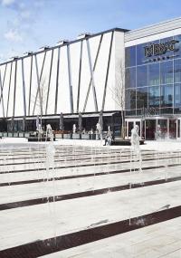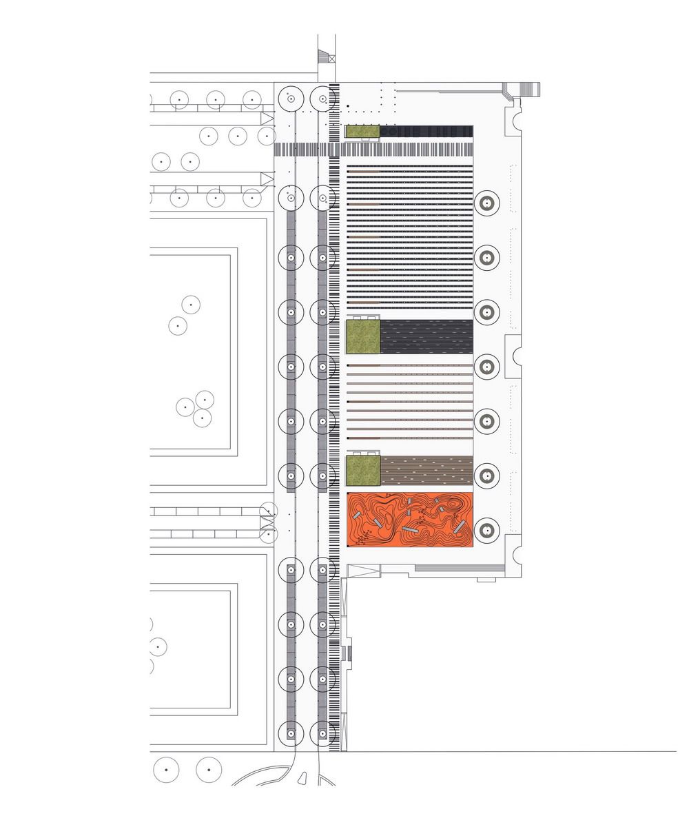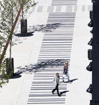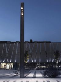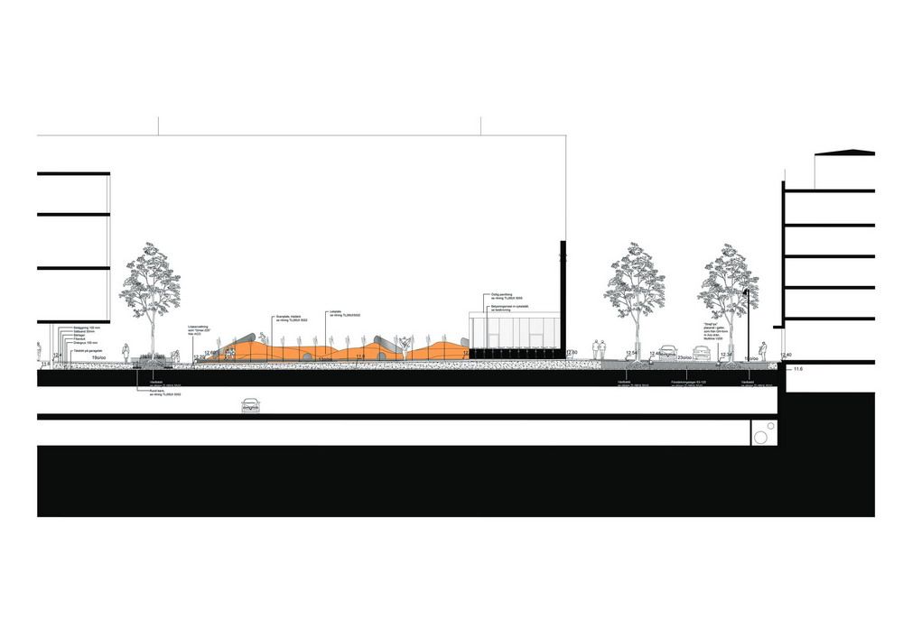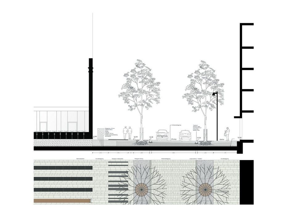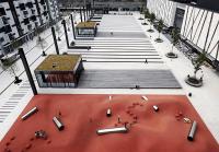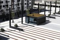 T?by Torg廣場以柔軟的白色混凝土磚鋪成。不同的子廣場被鍍上了不同的材料,如天然石材,混凝土,澆注橡膠和鑄鐵。這表明每個子廣場的定義和功能都被圖形化和程式化了。平行的街道和廣場被一排L形的燈桿和由黑色鋼結(jié)構(gòu)構(gòu)成的場館隔離開來。