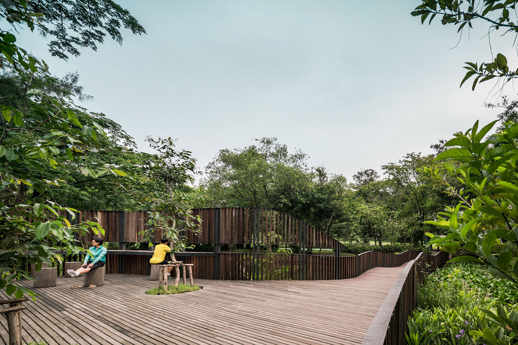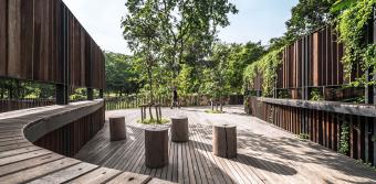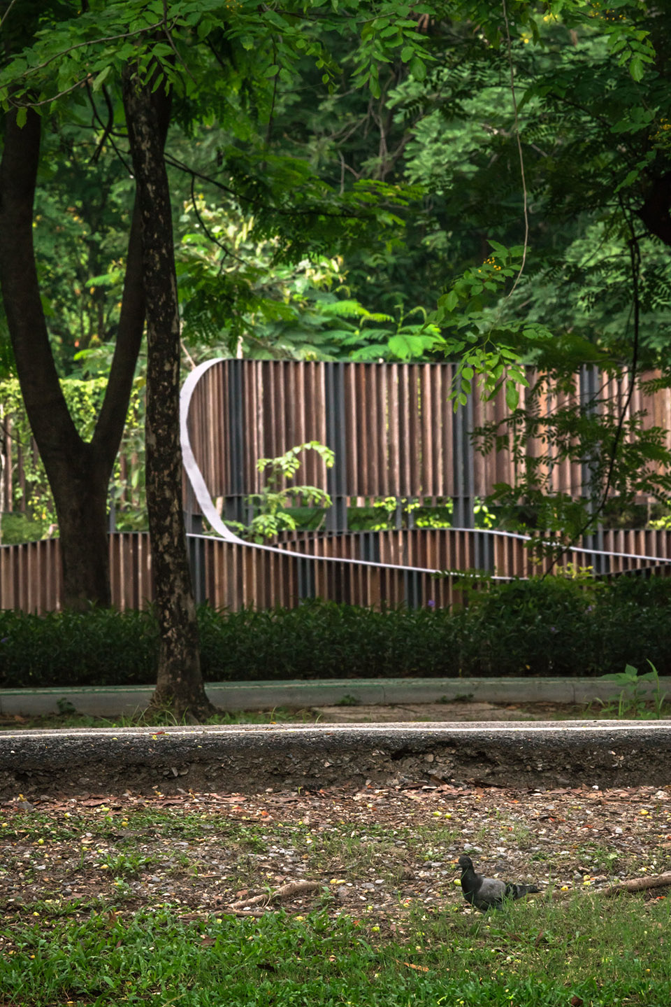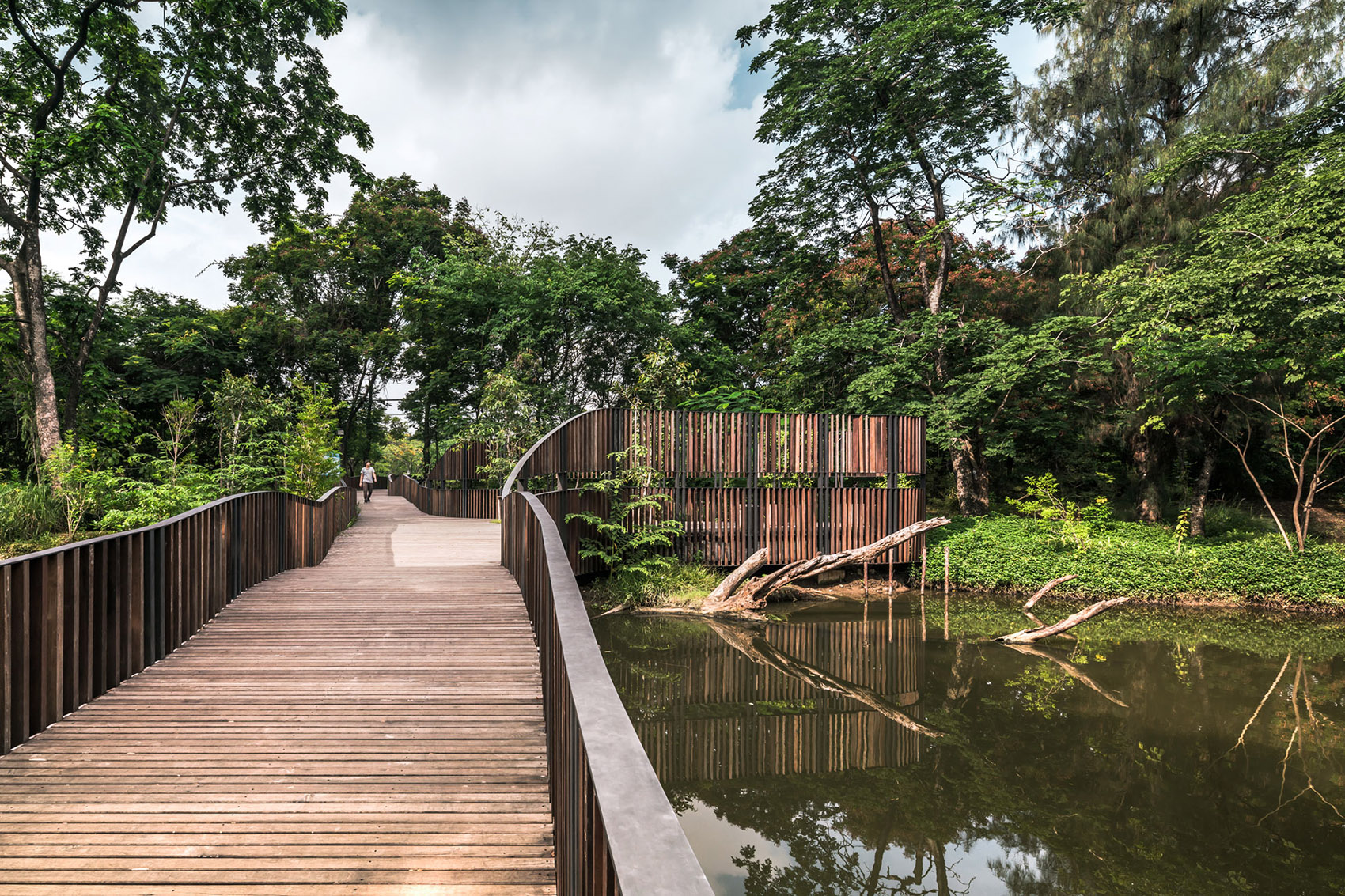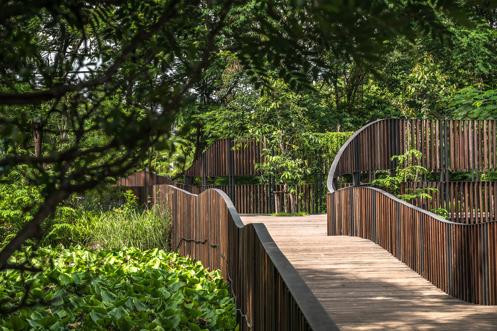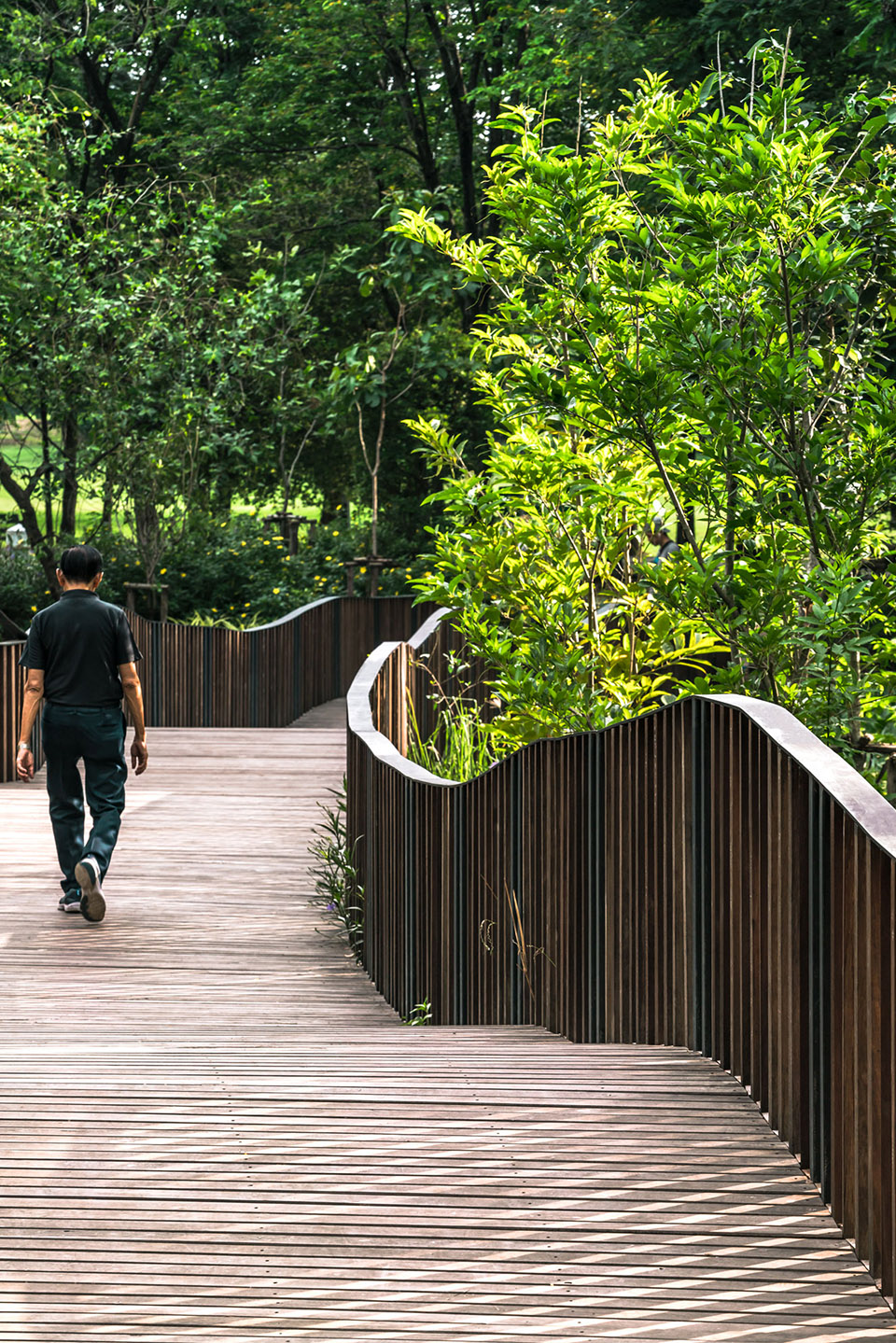 羽翼橋是一座位于曼谷Rotfai 公園與H.M. Queen Sirikit公園的連接橋,全長50米的步行橋旨在建立橋兩邊的物理聯(lián)系,同時將公共景觀營造與城市花園環(huán)境相協(xié)調(diào)。世界衛(wèi)生組織提出,城市人均最小公共綠地占有率應(yīng)不小于每人9平方米。而曼谷的人均公共綠地占有率僅3平方米每人,而這3平方米的綠地已經(jīng)包括了城市公園綠地及道路隔離帶。顯然,城市缺少綠地,于此同時,巨大的城市尺度給生態(tài)多樣性提供可能。